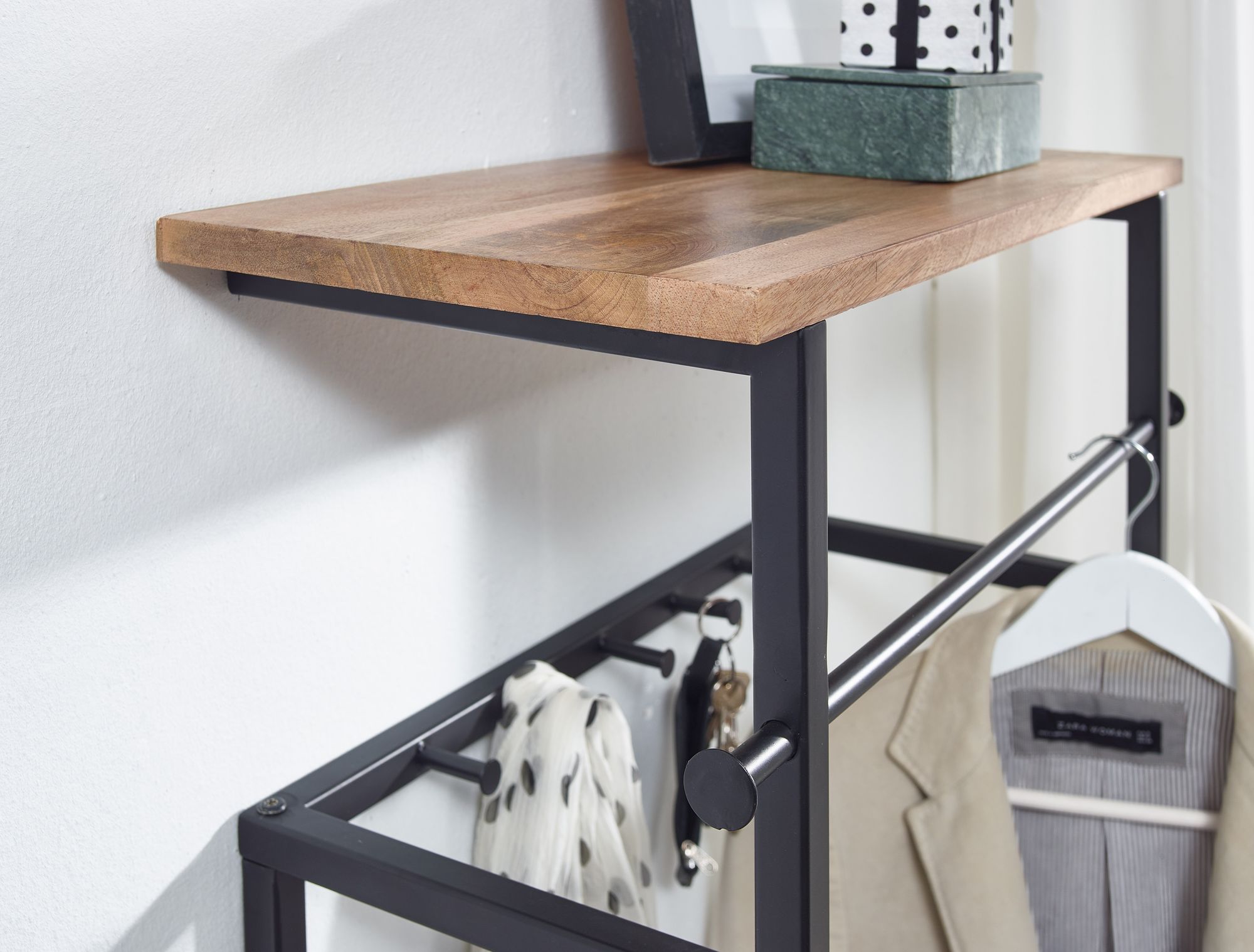 Große Wandgarderobe aus braunem Mango-Massivholz und schwarzem Metall, die elegantes Design mit optimaler Funktionalität kombiniert. Verfügt über zehn robuste Haken, eine Kleiderstange und eine großzügige Ablagefläche.