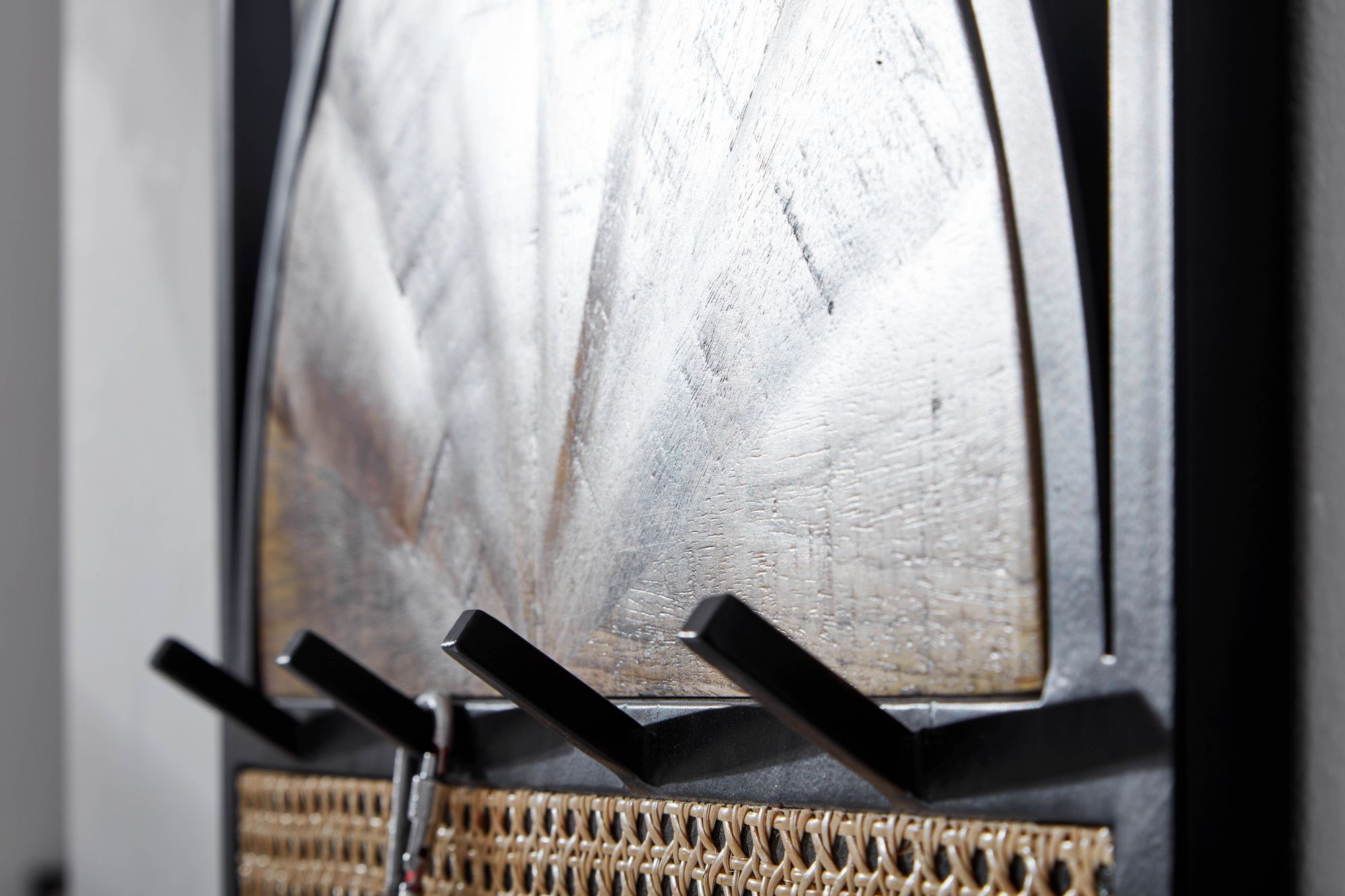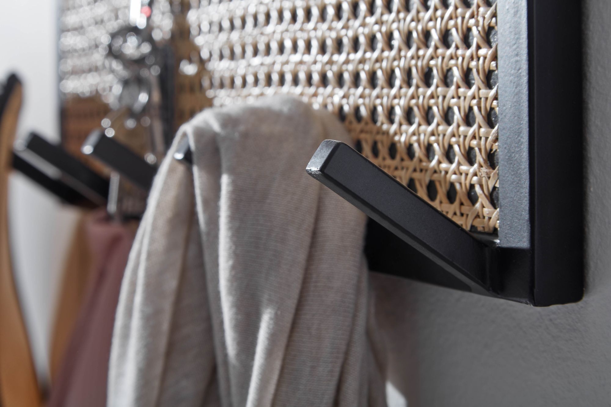 • Materialien: Rückwand aus lackiertem Mangoholz, Dekorstreifen Rattan auf MDF, Haken und Rahmen aus pulverbeschichtetem Eisen