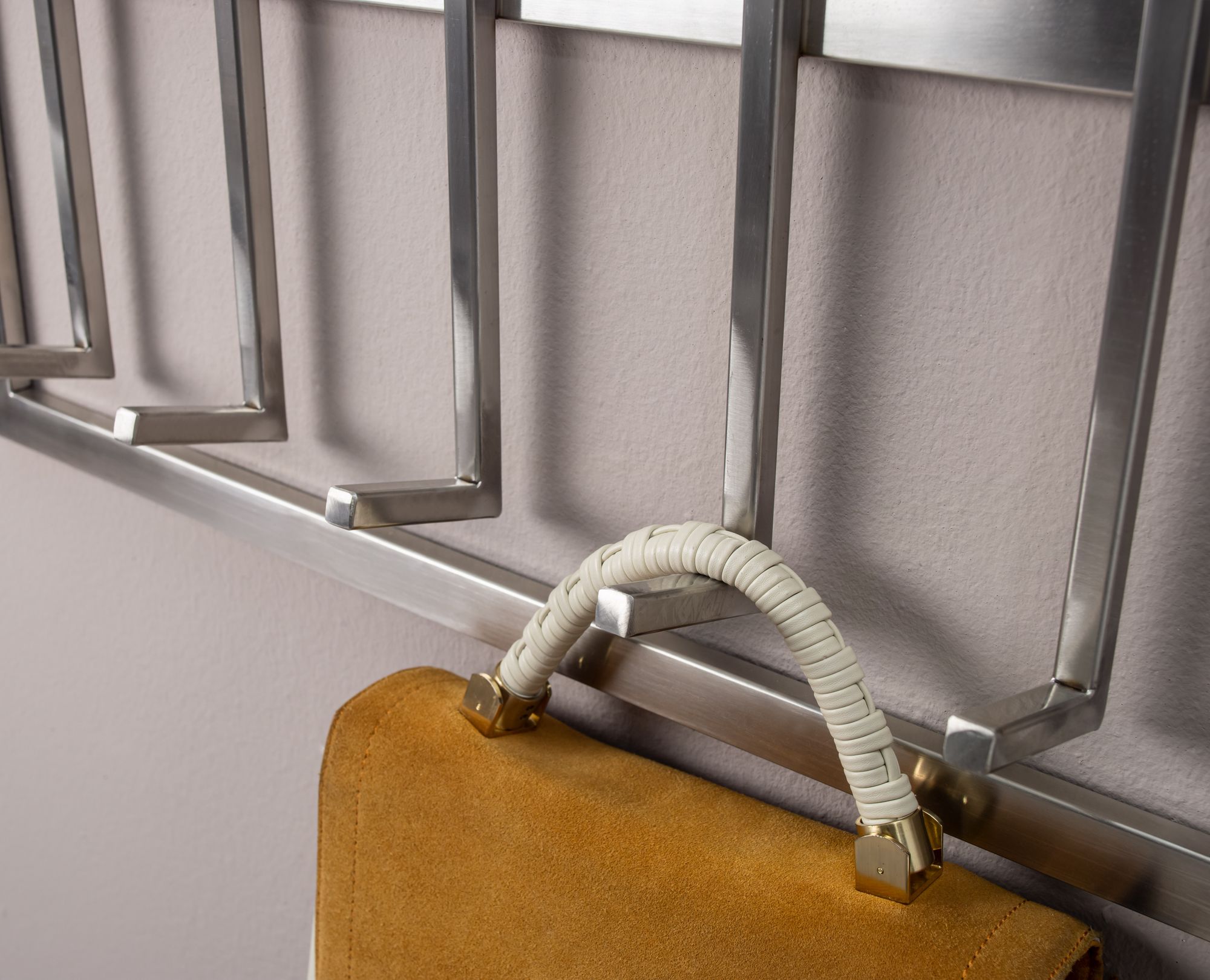 Diese elegante Wandgarderobe aus matt poliertem Stahl in Silber besticht durch ein schlichtes Design und zehn robuste Haken auf zwei unterschiedlichen Höhen. Ideal zum Aufhängen von Mänteln, Taschen und Accessoires im Flur oder Eingangsbereich.