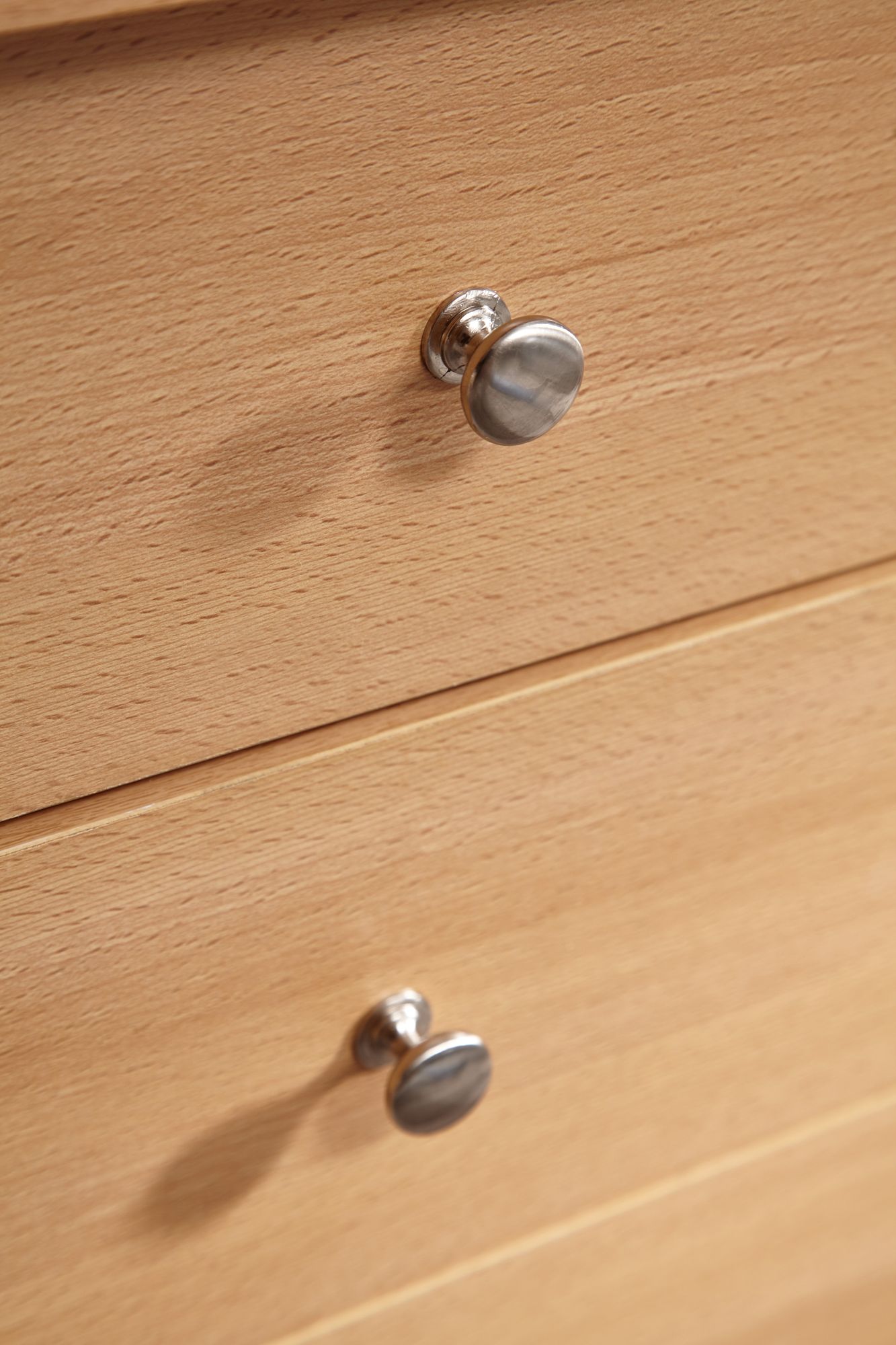 Diese helle Kommode aus Buchenholz besticht durch modernes Design und fünf Schubladen in zwei Größen mit silberfarbenen Aluminiumgriffknöpfen.