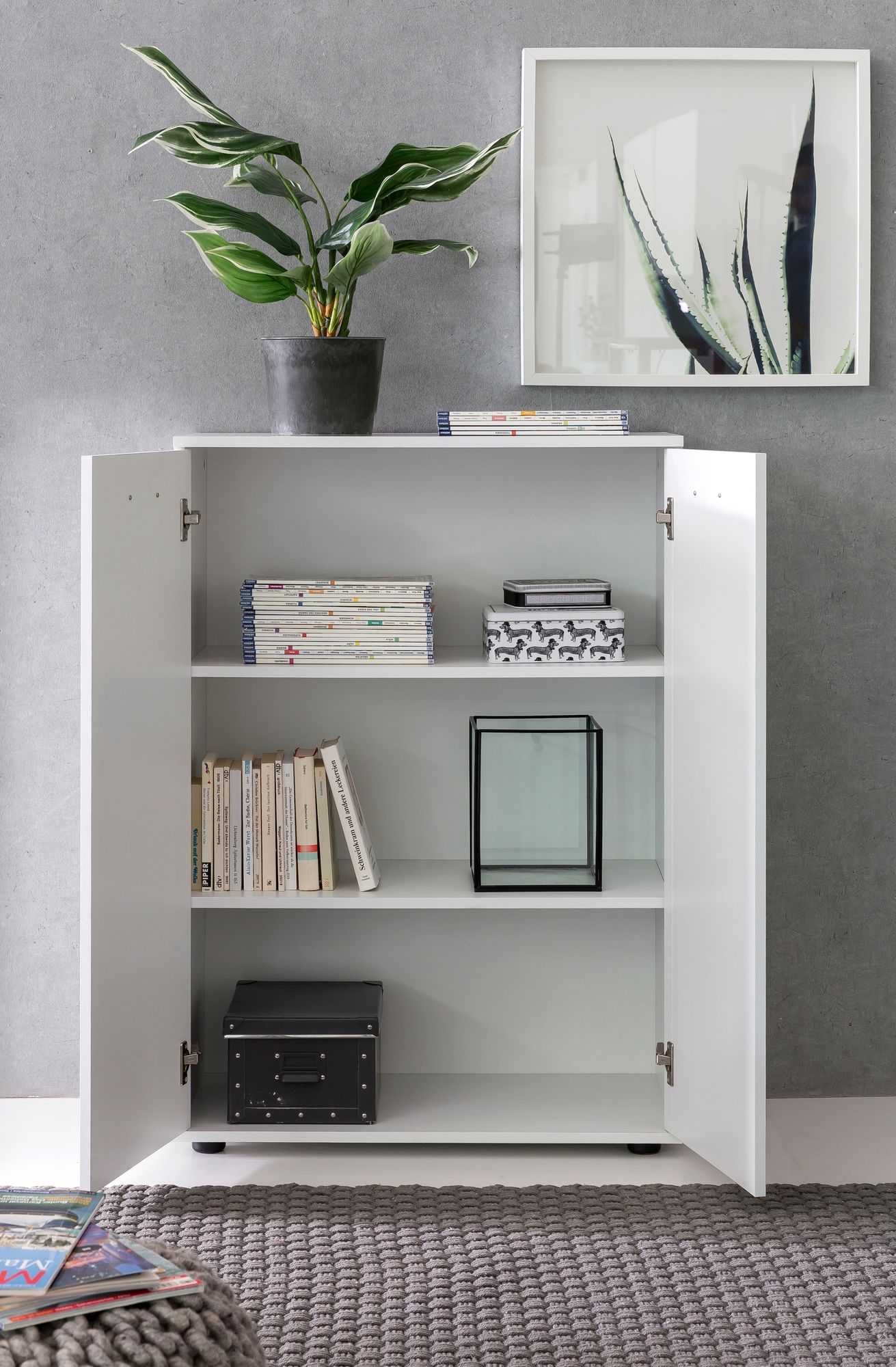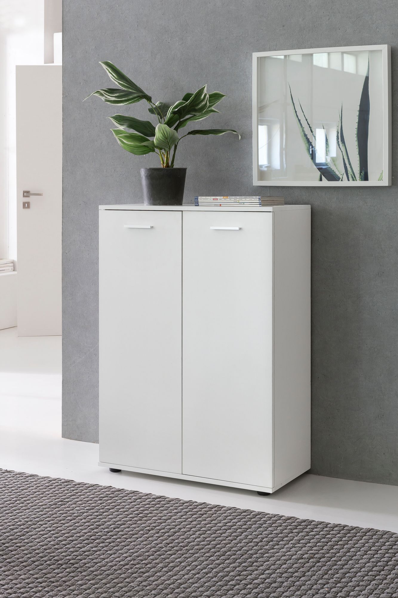 Diese mattweiße Holzkommode vereint modernes Design und Funktionalität für optimale Aufbewahrung. Mit zwei eleganten Türen und drei geräumigen Ablagen passt sie perfekt in kleine Räume.