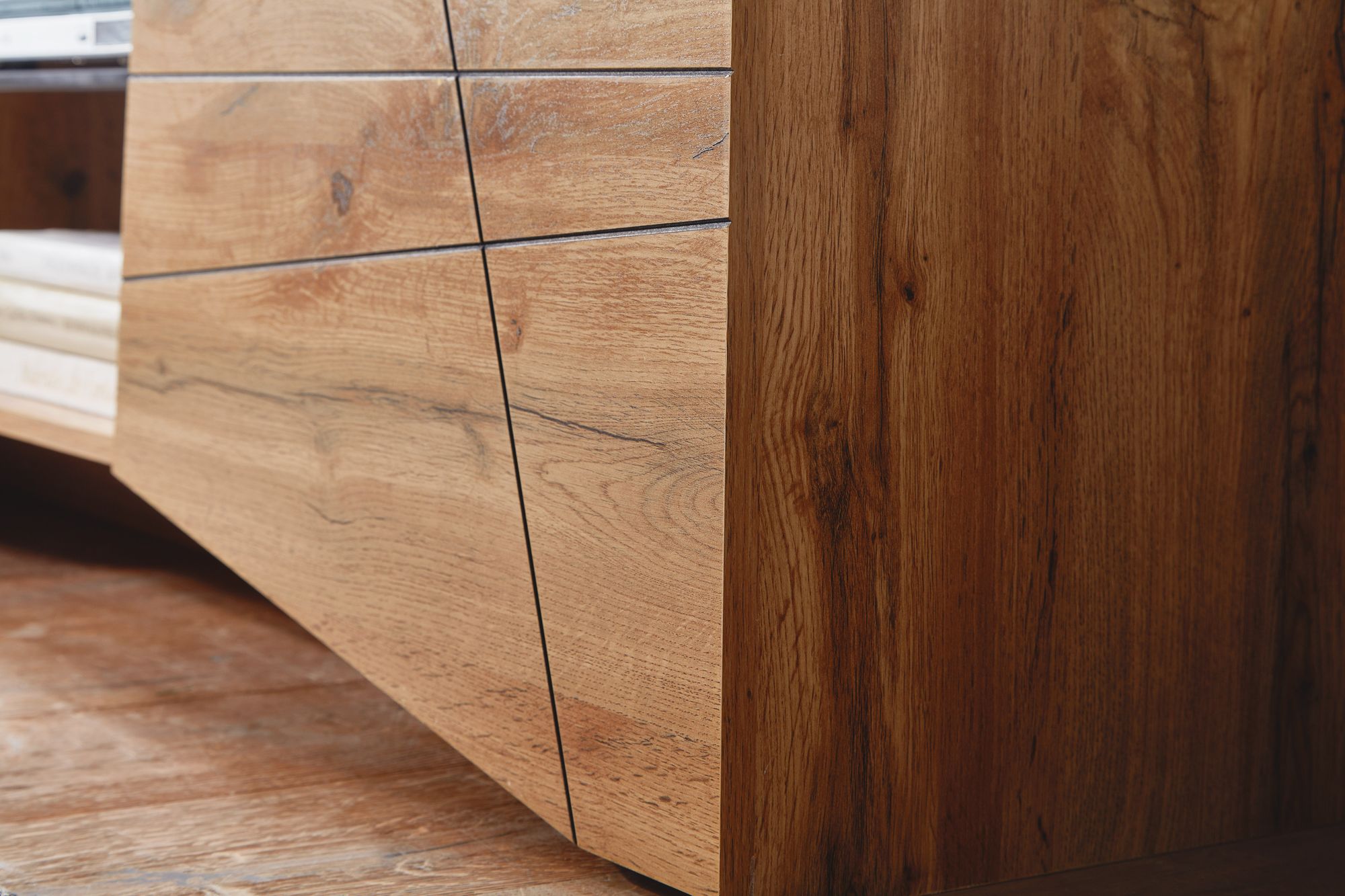 - Material: folierte Spanplatte mit Eichenoptik, Glasablagefläche