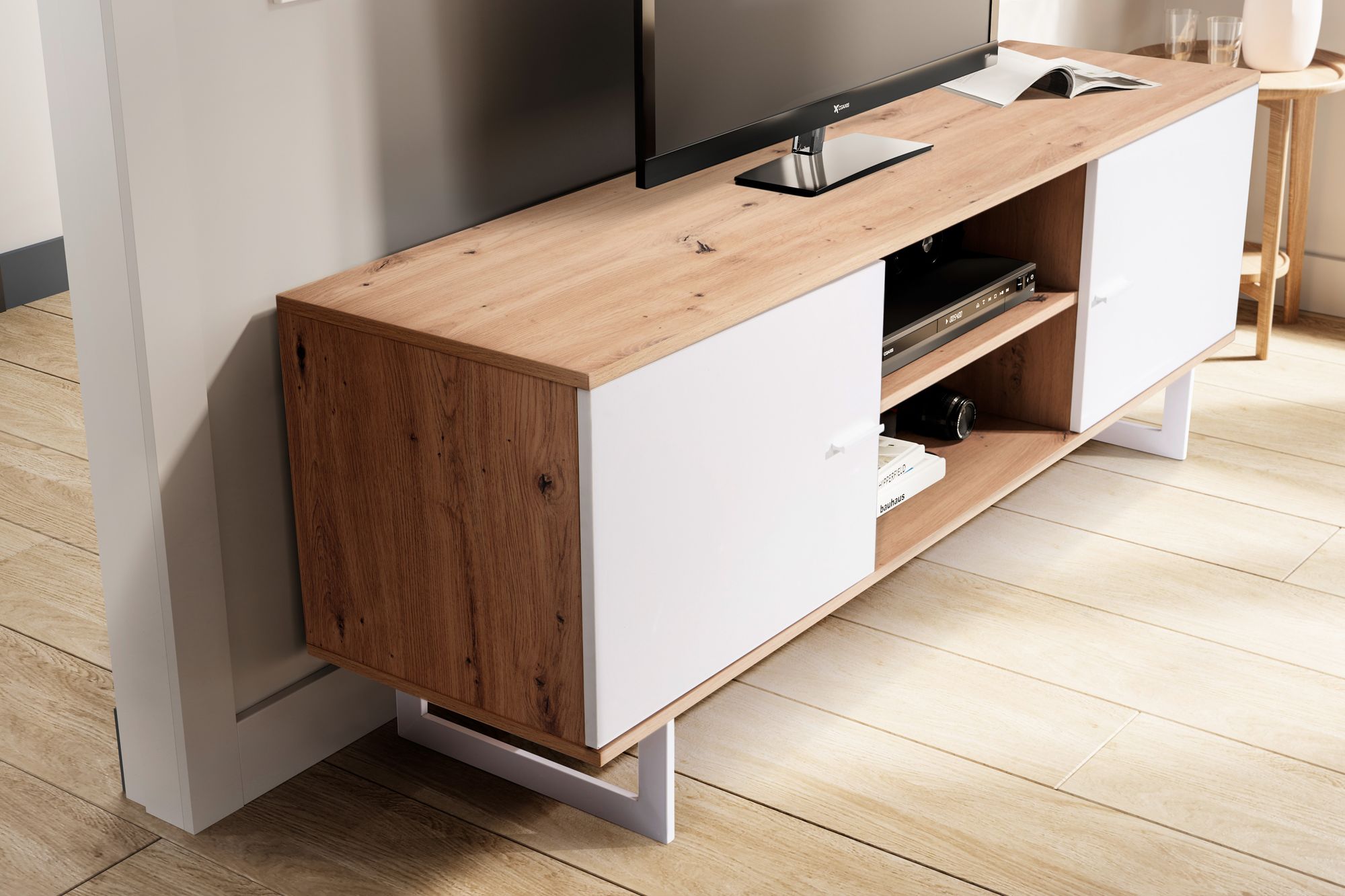 Dieser moderne Lowboard kombiniert hellen Eiche-Dekor mit weißen Türen, Griffen und Beinen für ein helles und sauberes Aussehen. Die großzügige Ablagefläche trägt Fernseher bis zu 70 Zoll. Zwei geschlossene Türen und zwei offene Fächer bieten optimalen Stauraum für Konsolen, DVDs und Multimedia-Geräte.