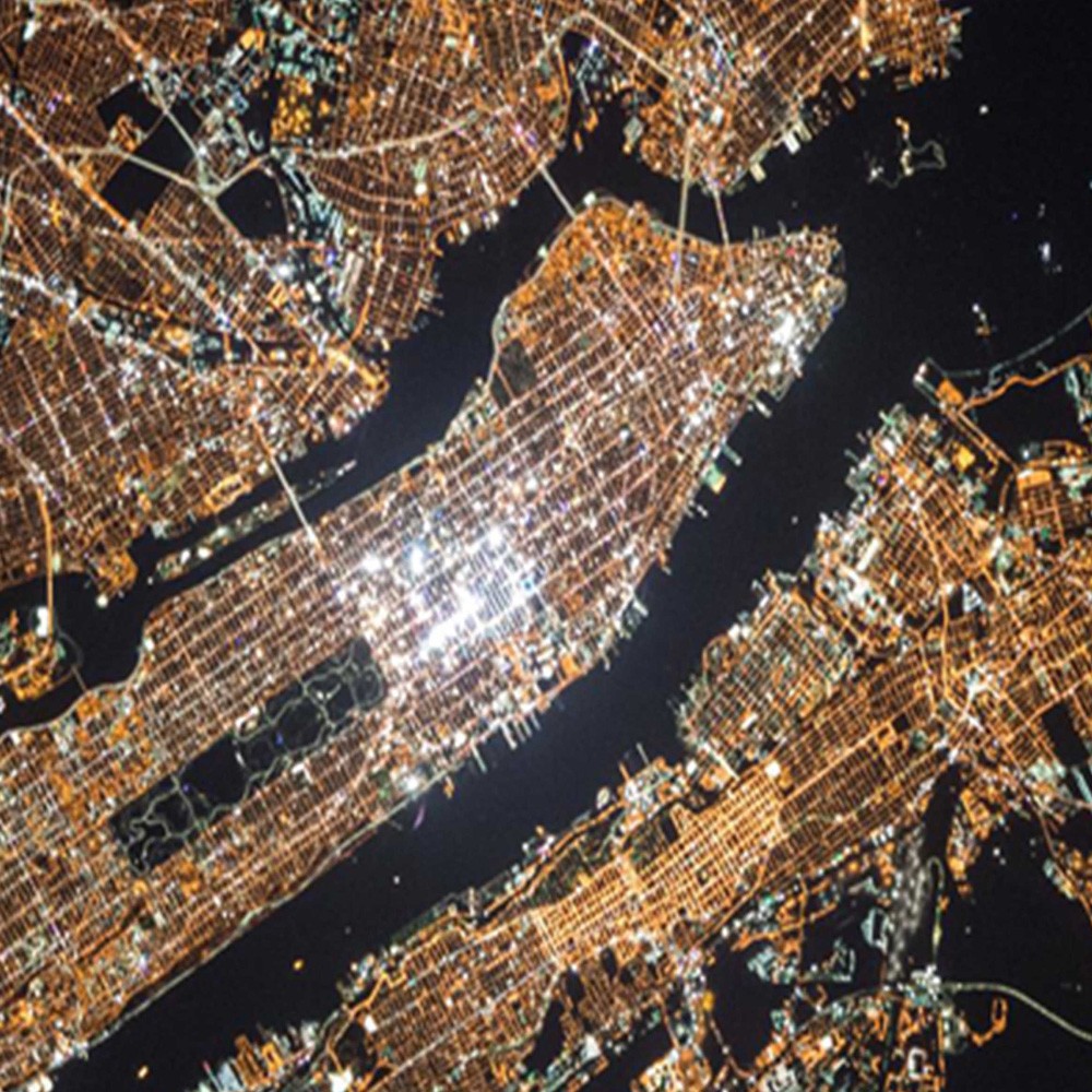 Beschreibung und Eigenschaften – 145 cm großer zweiseitiger Bildschirm aus MDF und Leinwand mit Satellitenbild einer Stadt