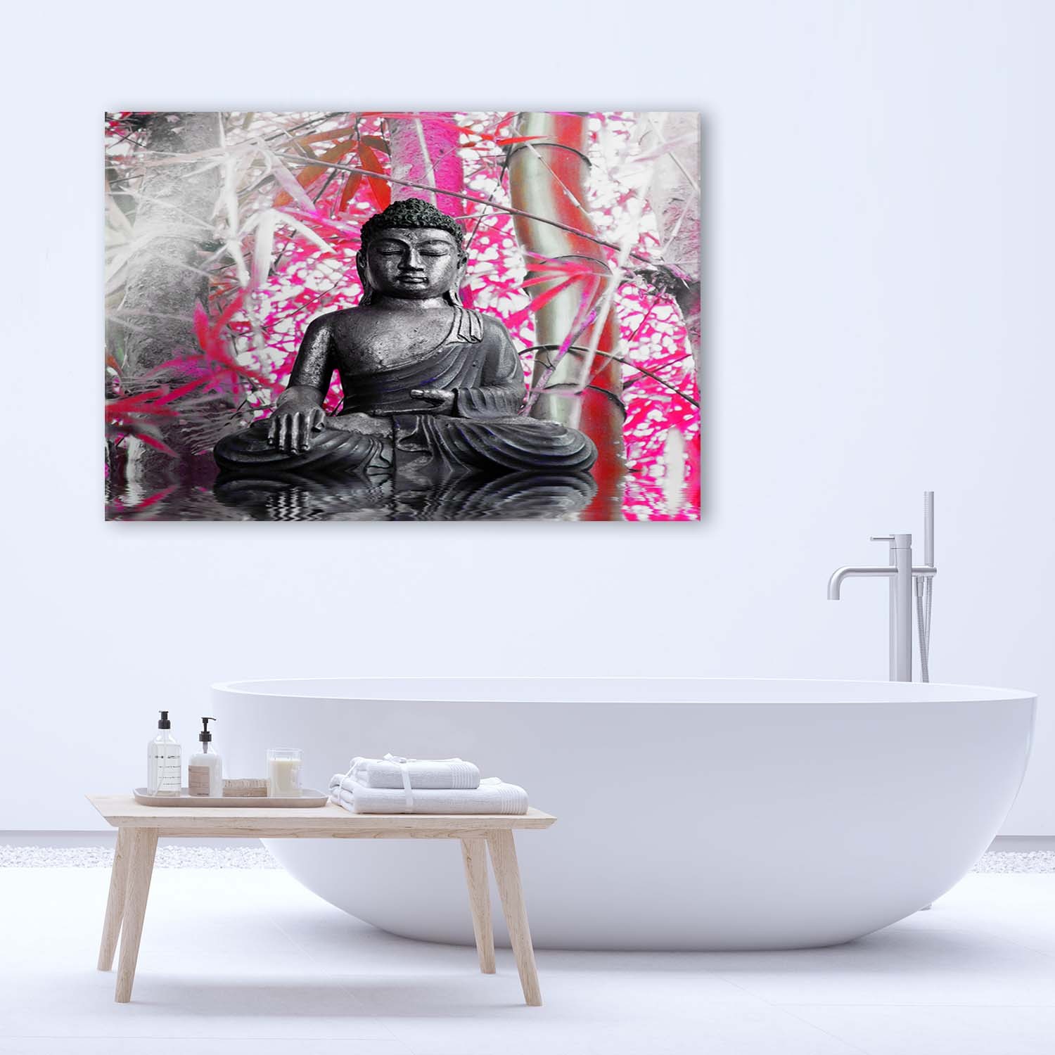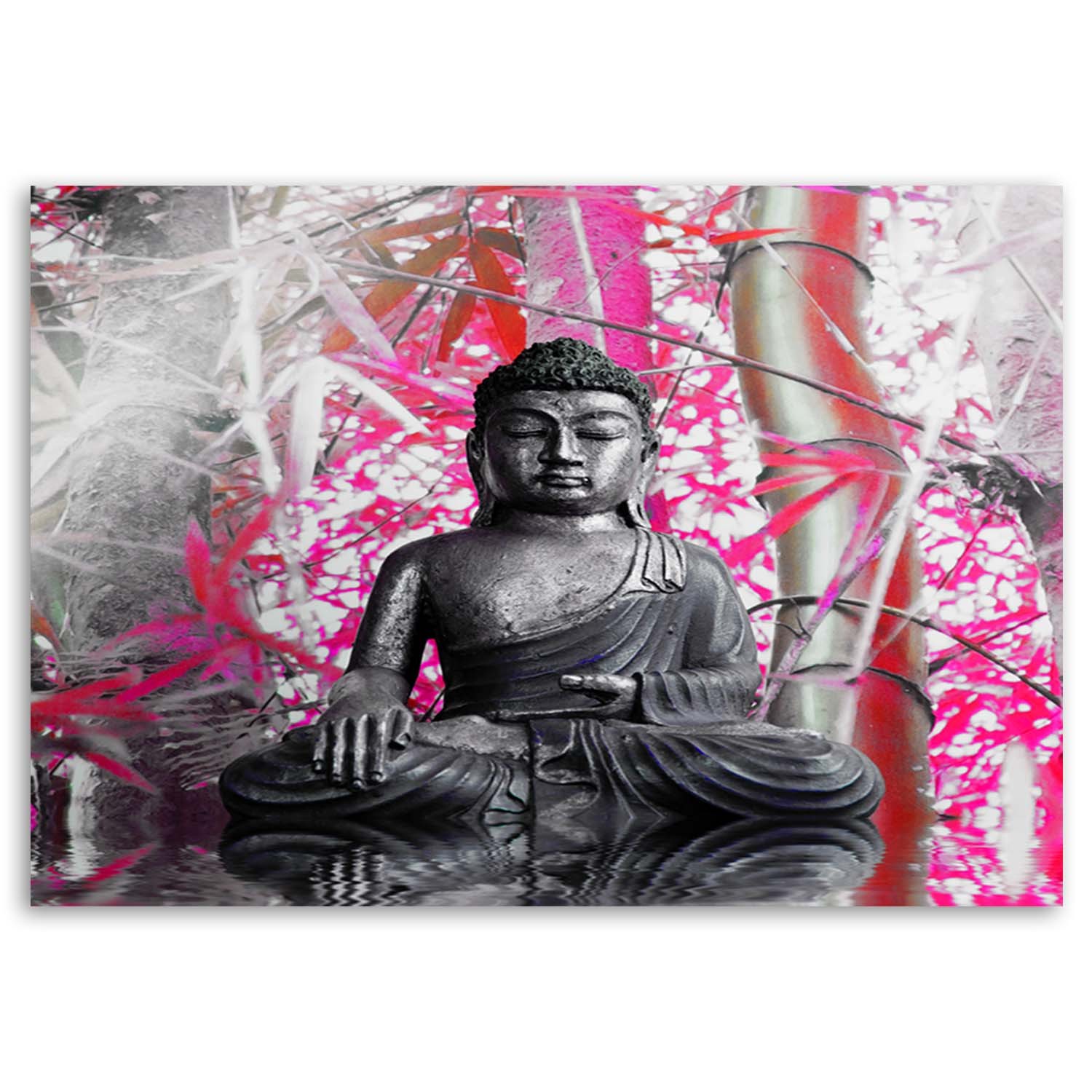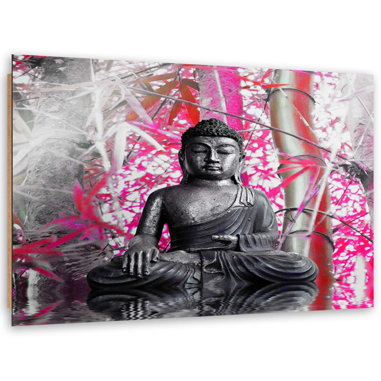 Produktinformationen "Dekorativer hdf-rahmen mit buddha-bild und bambusblättern in rosa und grauer ausführung"