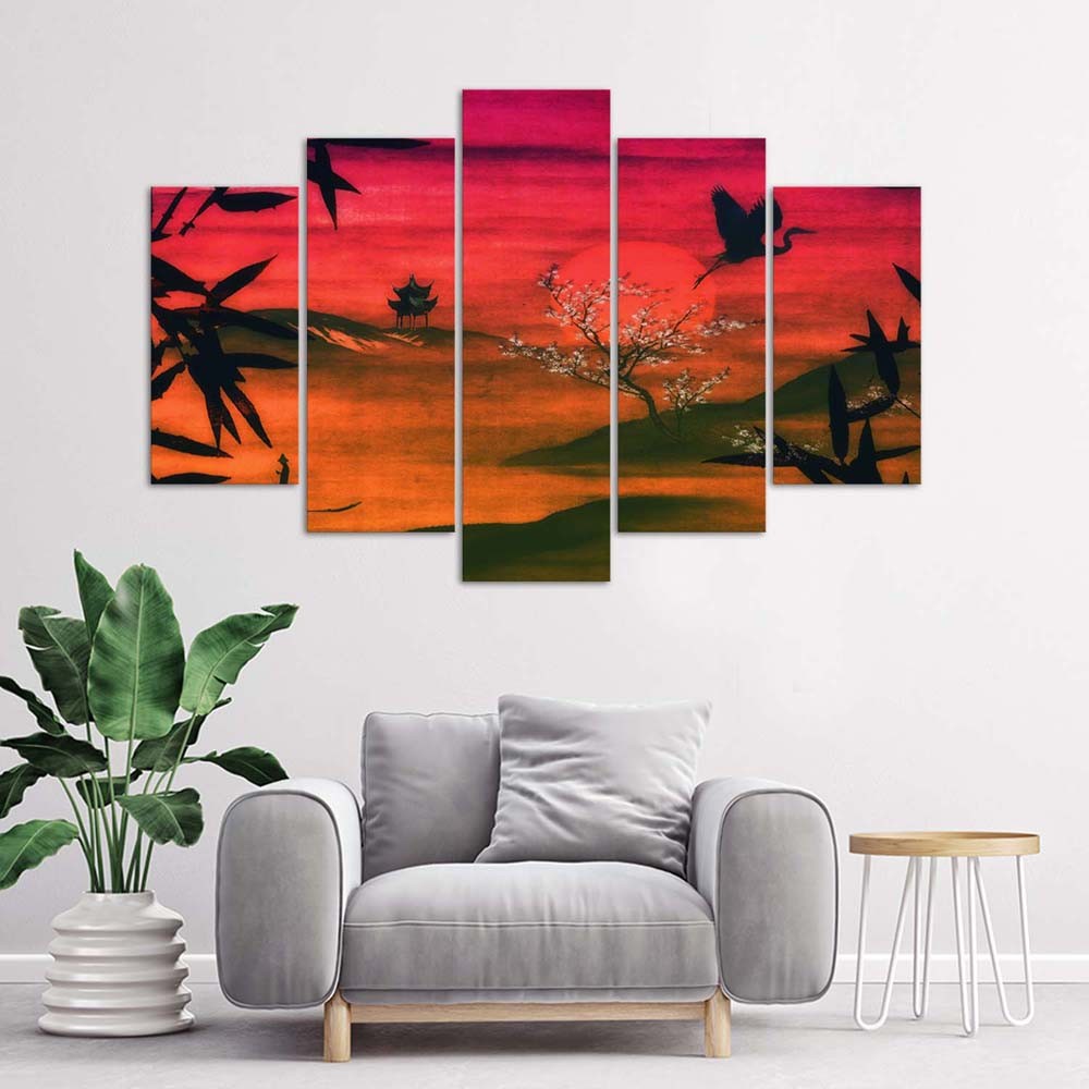 - Rahmen bestehend aus fünf Teilen „Japan im Sonnenlicht getaucht“, gedruckt auf HDF-Leinwand (hochdichte Faser).