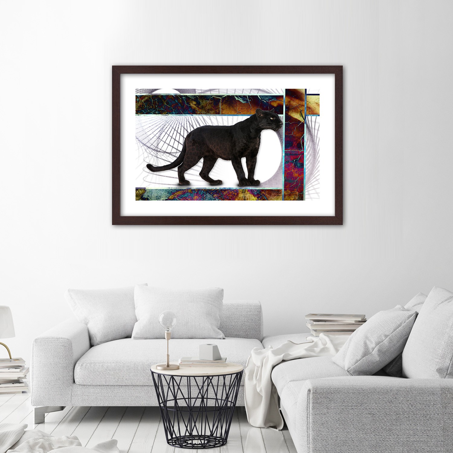 - „Aufmerksamer Panther“-Rahmen, gedruckt auf Satinpapier mit MDF-Rahmen (mitteldichte Fasern).