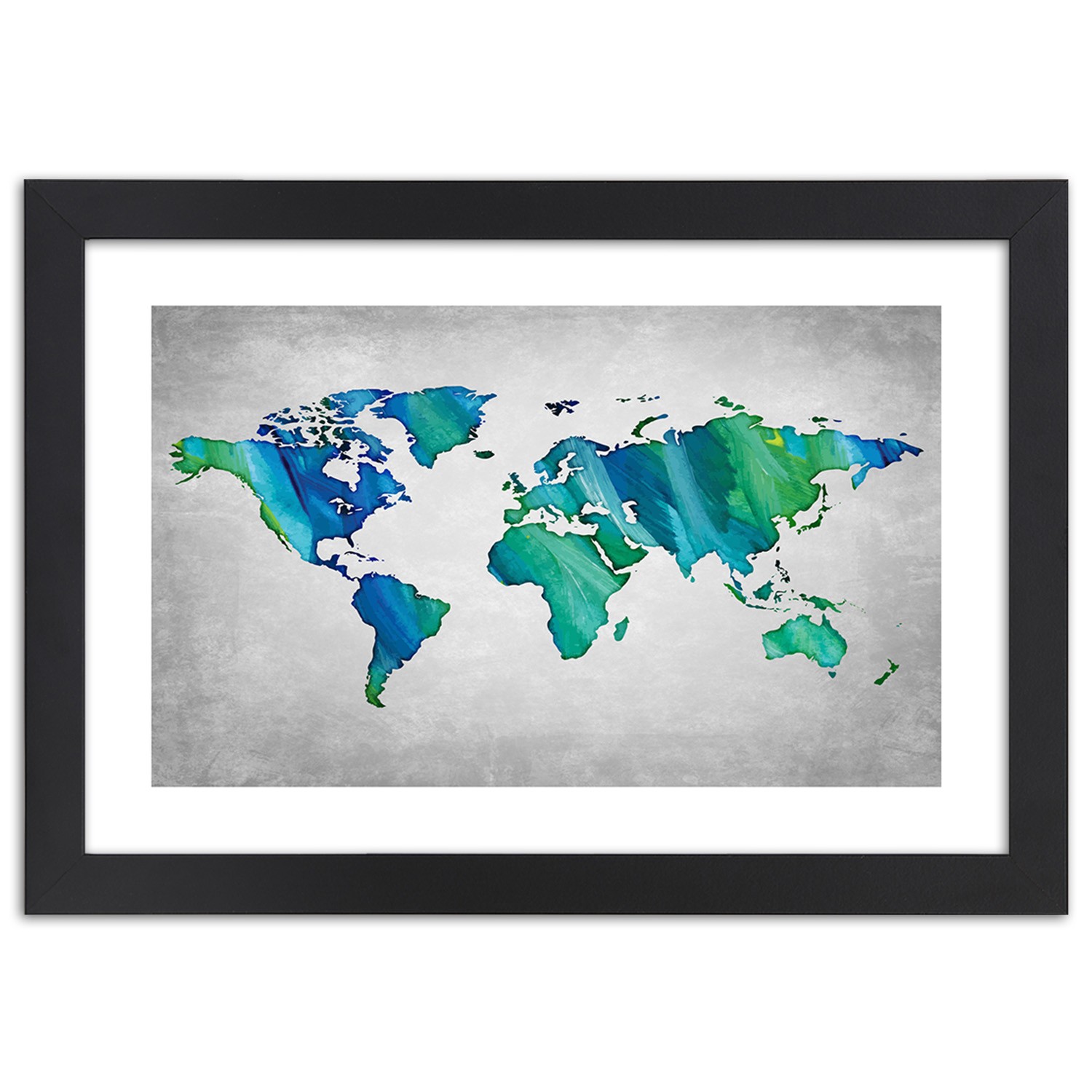 Schwarz furnierter mdf-rahmen mit dekorativem, farbenfrohem weltkarten-poster auf beton
