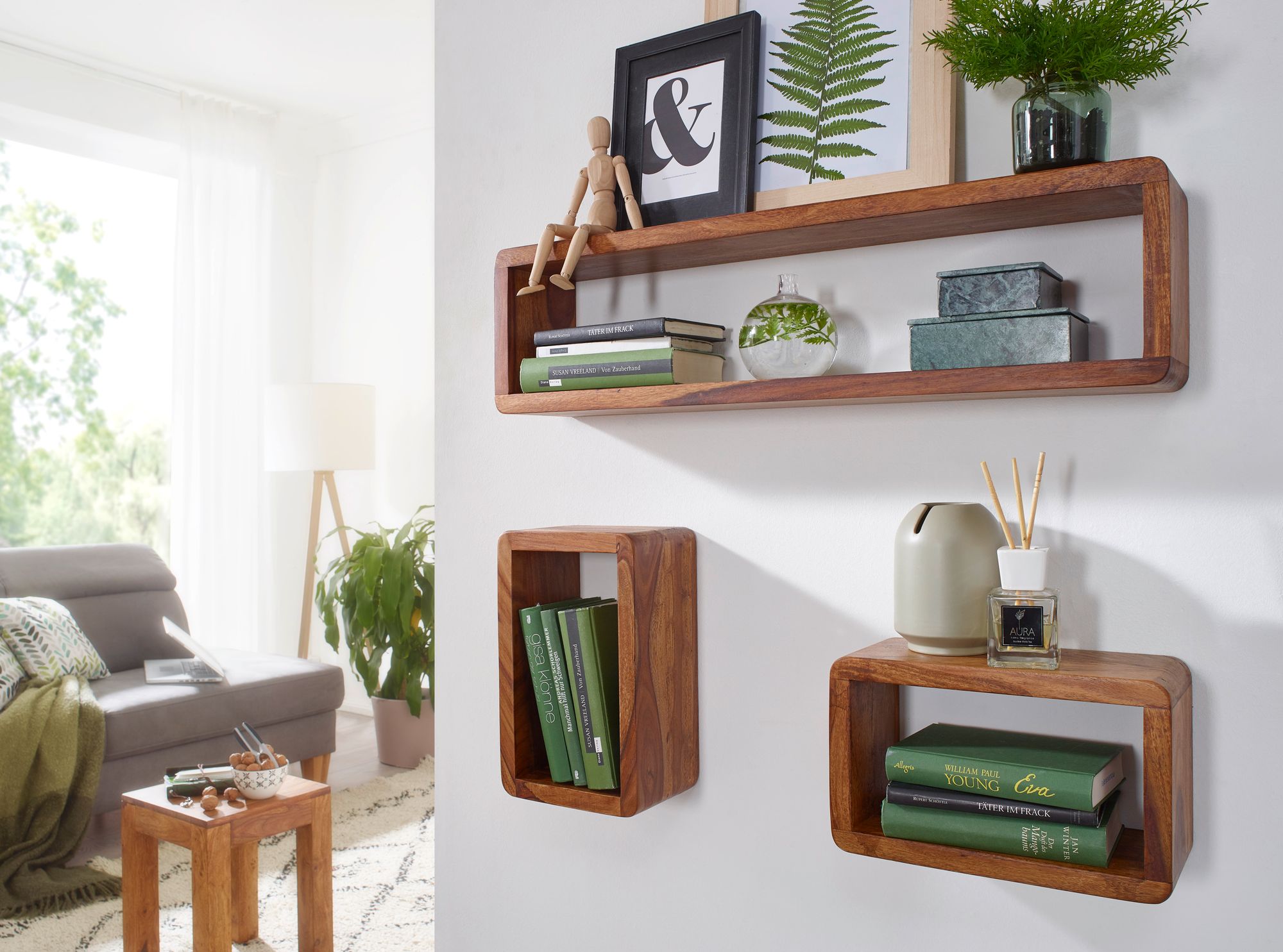 Verleihen Sie Ihrem Zuhause mit dem 3-teiligen Wandregalset BOHA aus massivem Sheesham-Holz einen rustikalen und authentischen Look. Die abgerundeten Würfelformen bieten großzügige Ablageflächen, ideal für Wohnzimmer oder Flur.