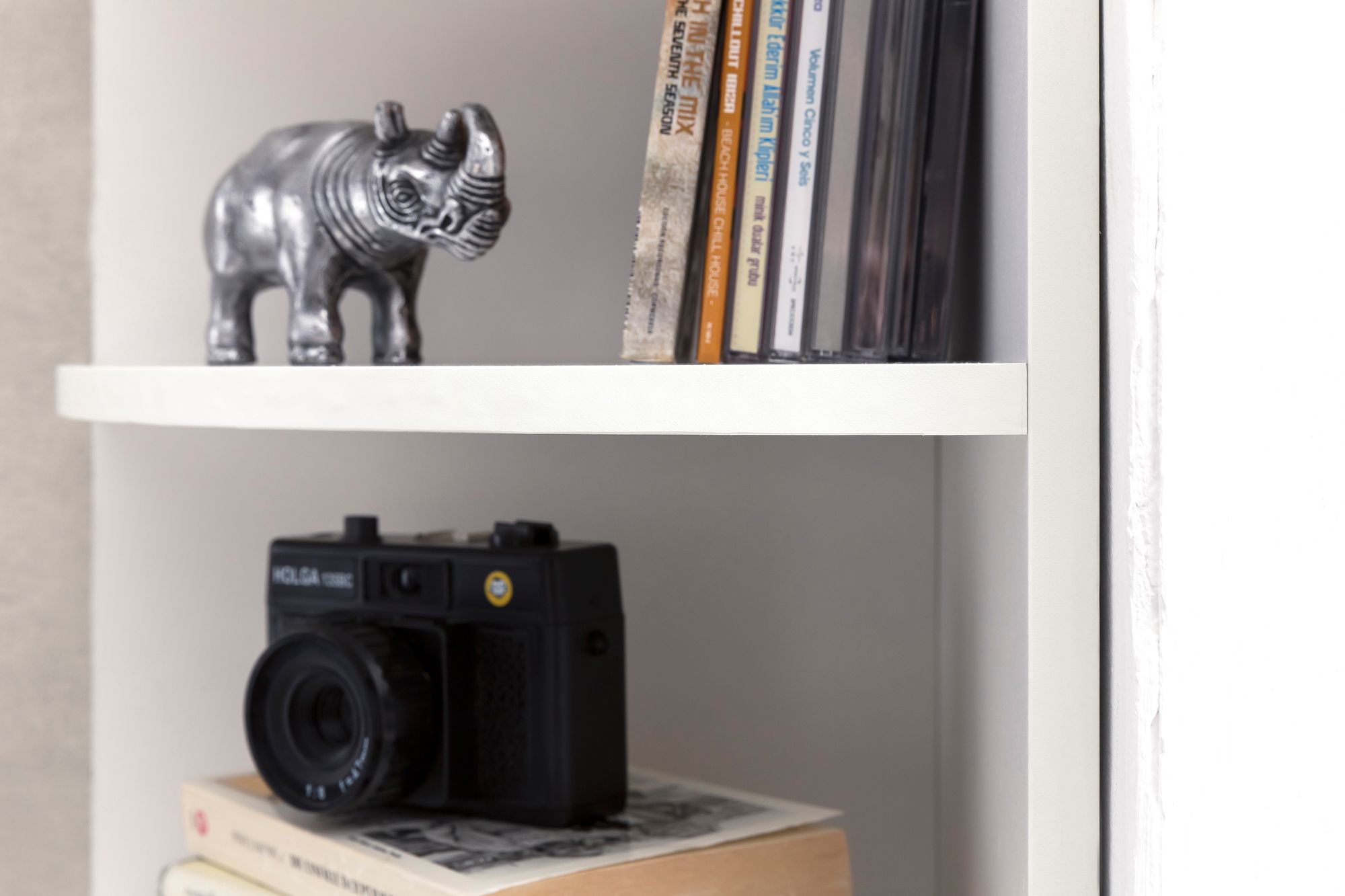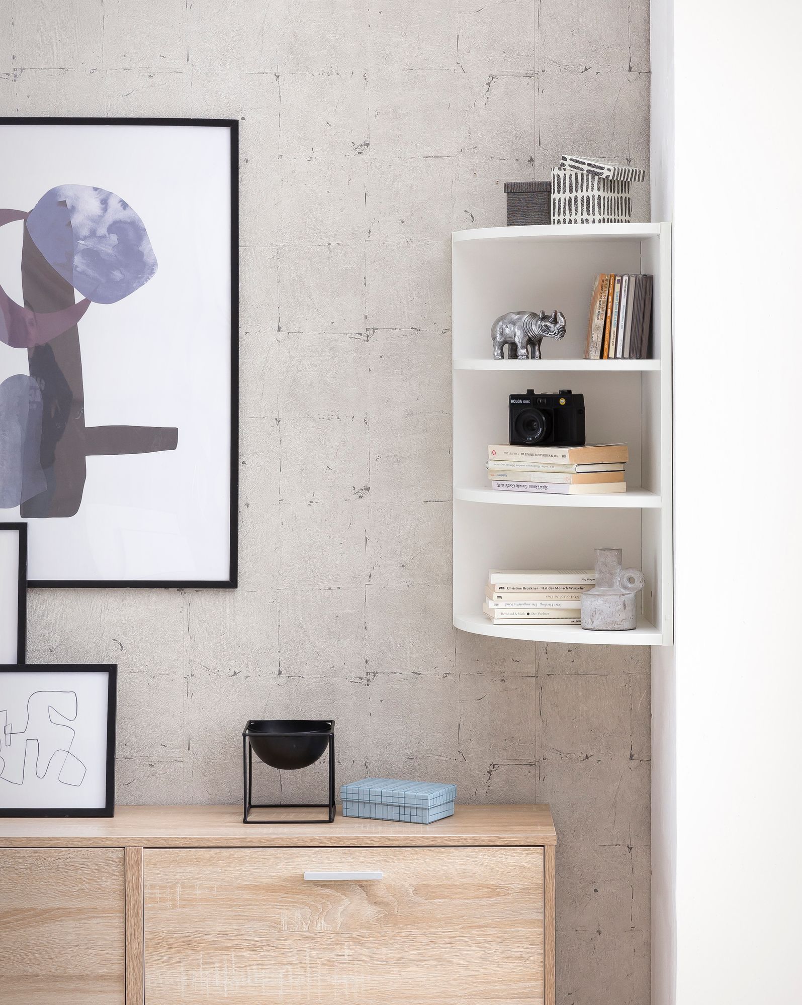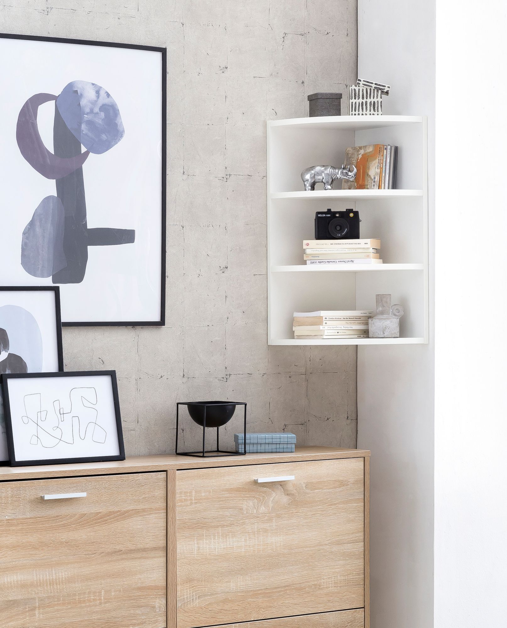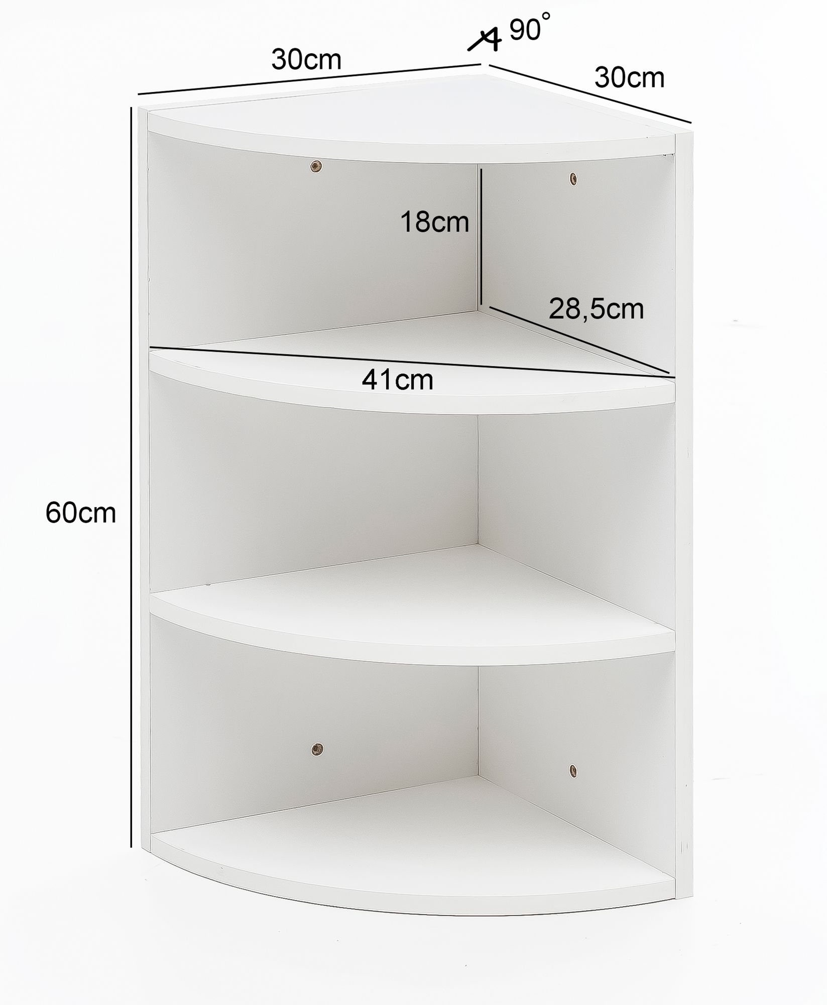 Dieses moderne Eckregal aus weißem Holz verfügt über drei offene Fächer, die ausreichend Platz für Dekorationen und persönliche Gegenstände bieten. Die melaminharzbeschichtete Oberfläche ist kratz- und wasserfest, was eine langlebige und elegante Nutzung ermöglicht.