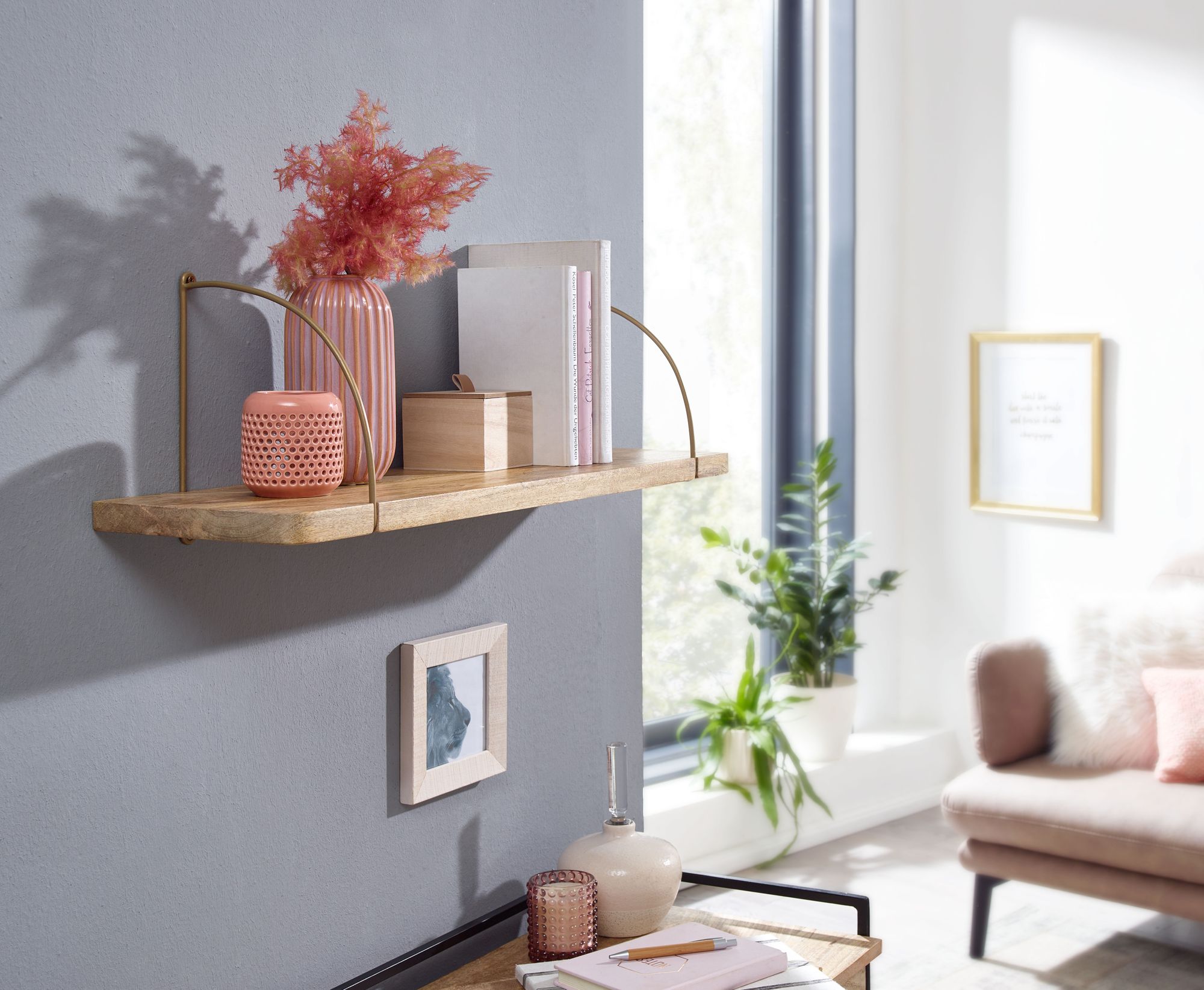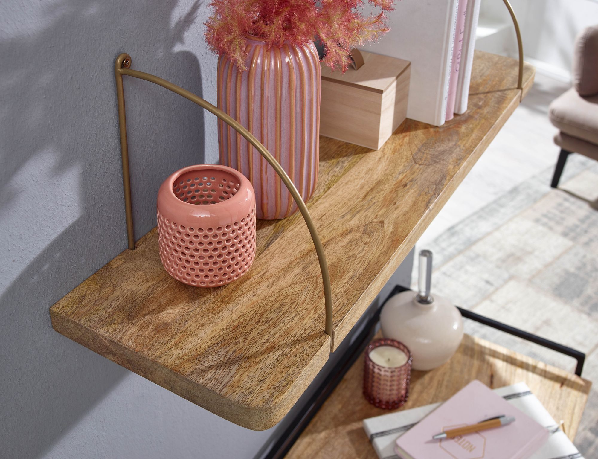 Wandregal aus Mango Massivholz und goldfarbenem Metall | 80x25x22 cm
