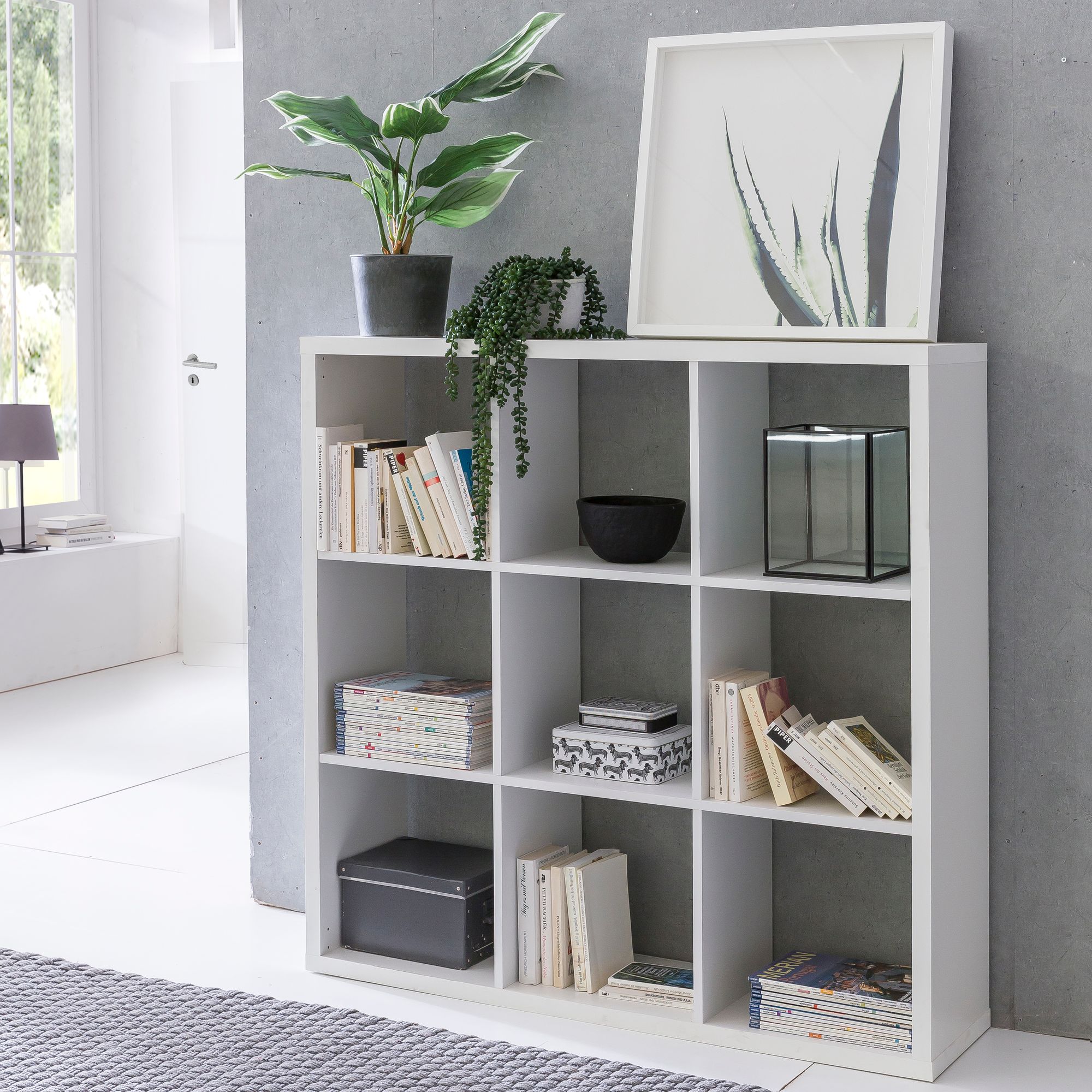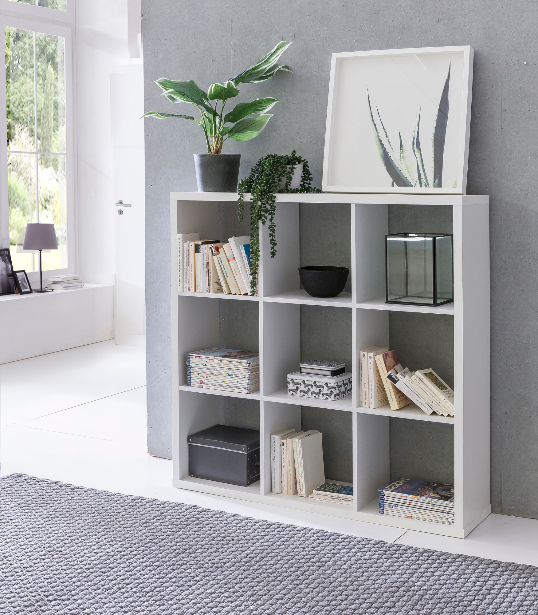 Modernes weißes Würfelregal mit zeitlosem Design und hoher Funktionalität. Mit 9 geräumigen Fächern bietet es großzügigen Stauraum für Bücher, Ordner und Dekoration. Die melaminharzbeschichtete Oberfläche ist kratzfest und wasserabweisend für eine lange Lebensdauer.