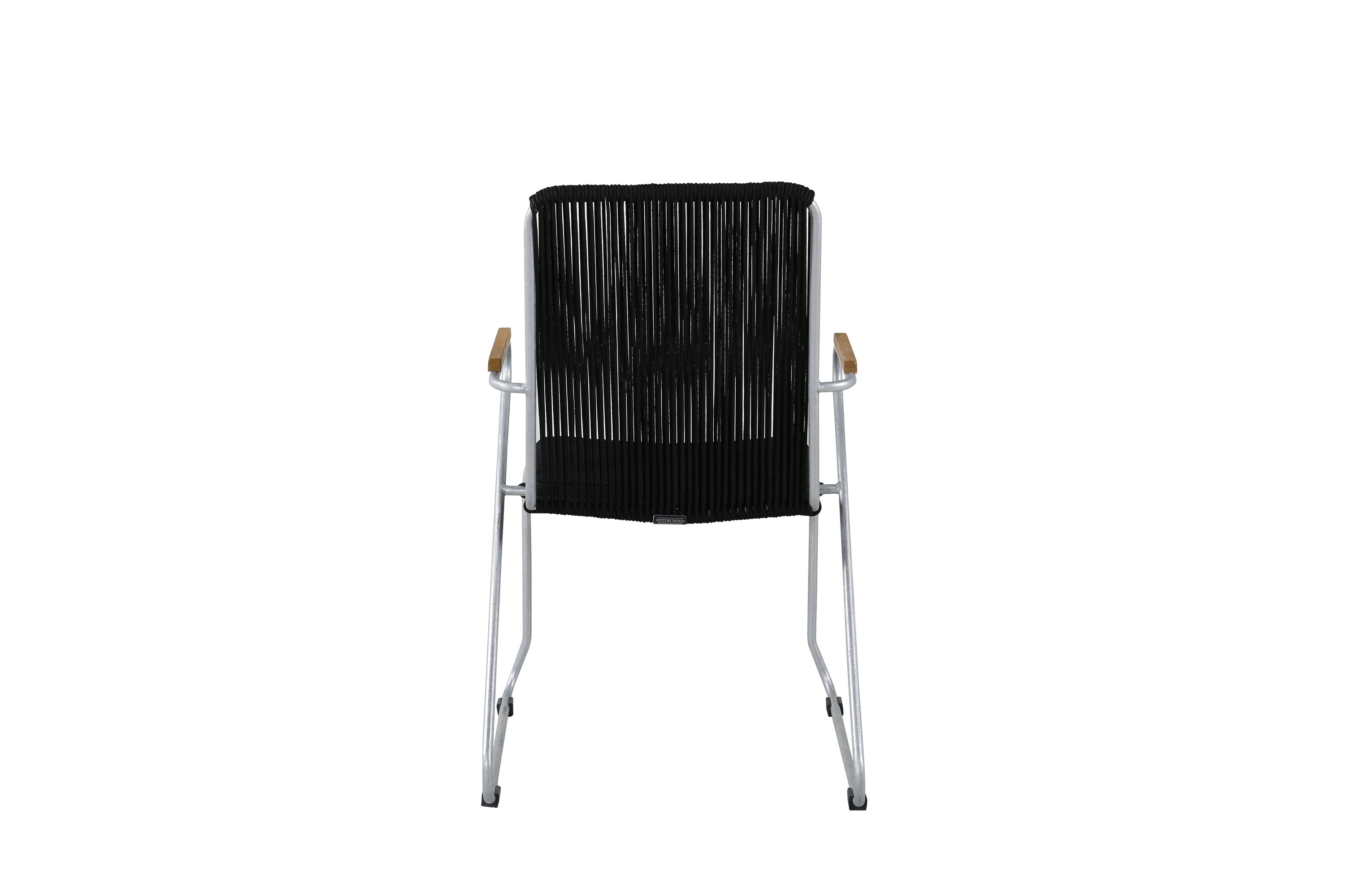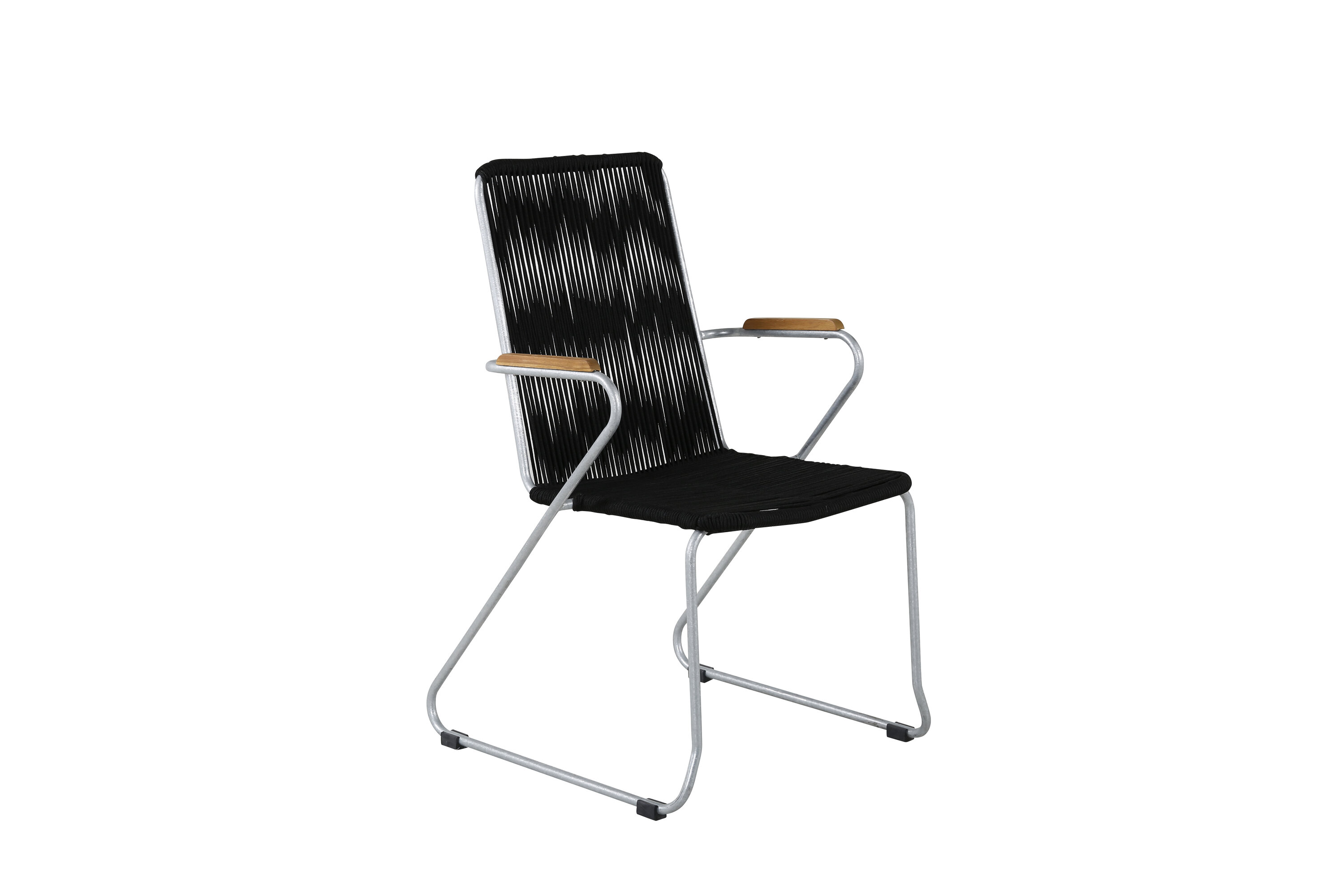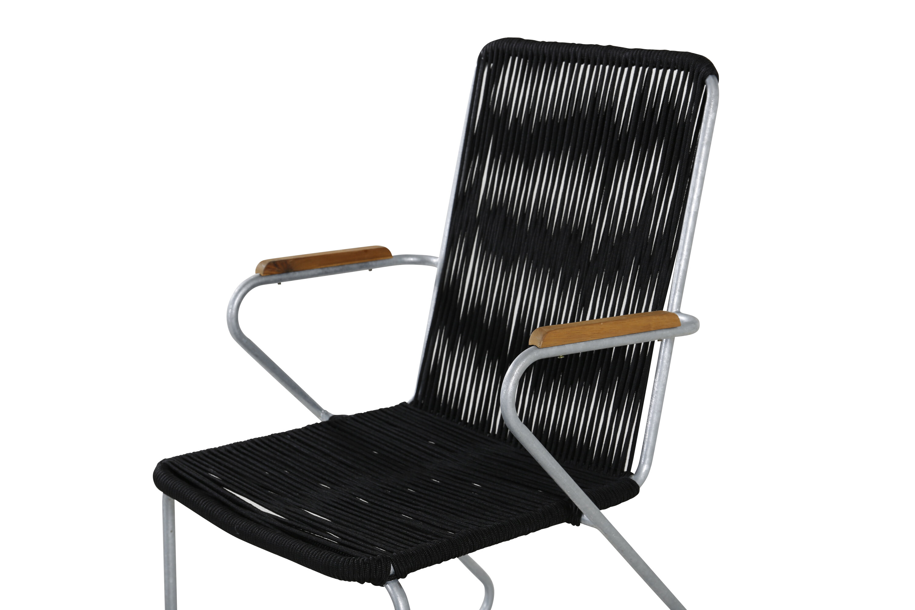 Modern, stilvoll und langlebig - ein trendiger Stuhl, bei dem jeder Recht hat! BoIS hat ein komfortables Design in Zinkkonstruktion, Sitz in schwarzem Seil und dekorative Armlehnen in Teakholz. Ein Möbelstück, das zu vielen angenehmen Momenten einlädt! Genießen Sie ein kleines Extra an schönen Mahlzeiten im Freien und statten Sie den Balkon stilvoll aus. Der Stuhl ist stapelbar.