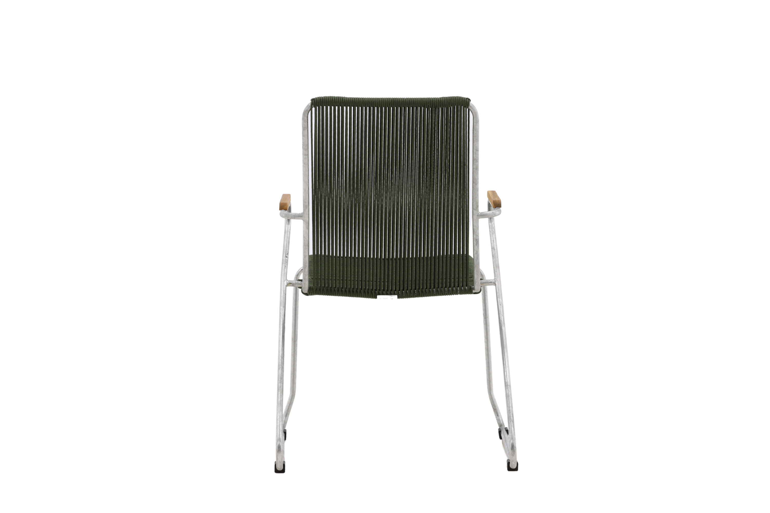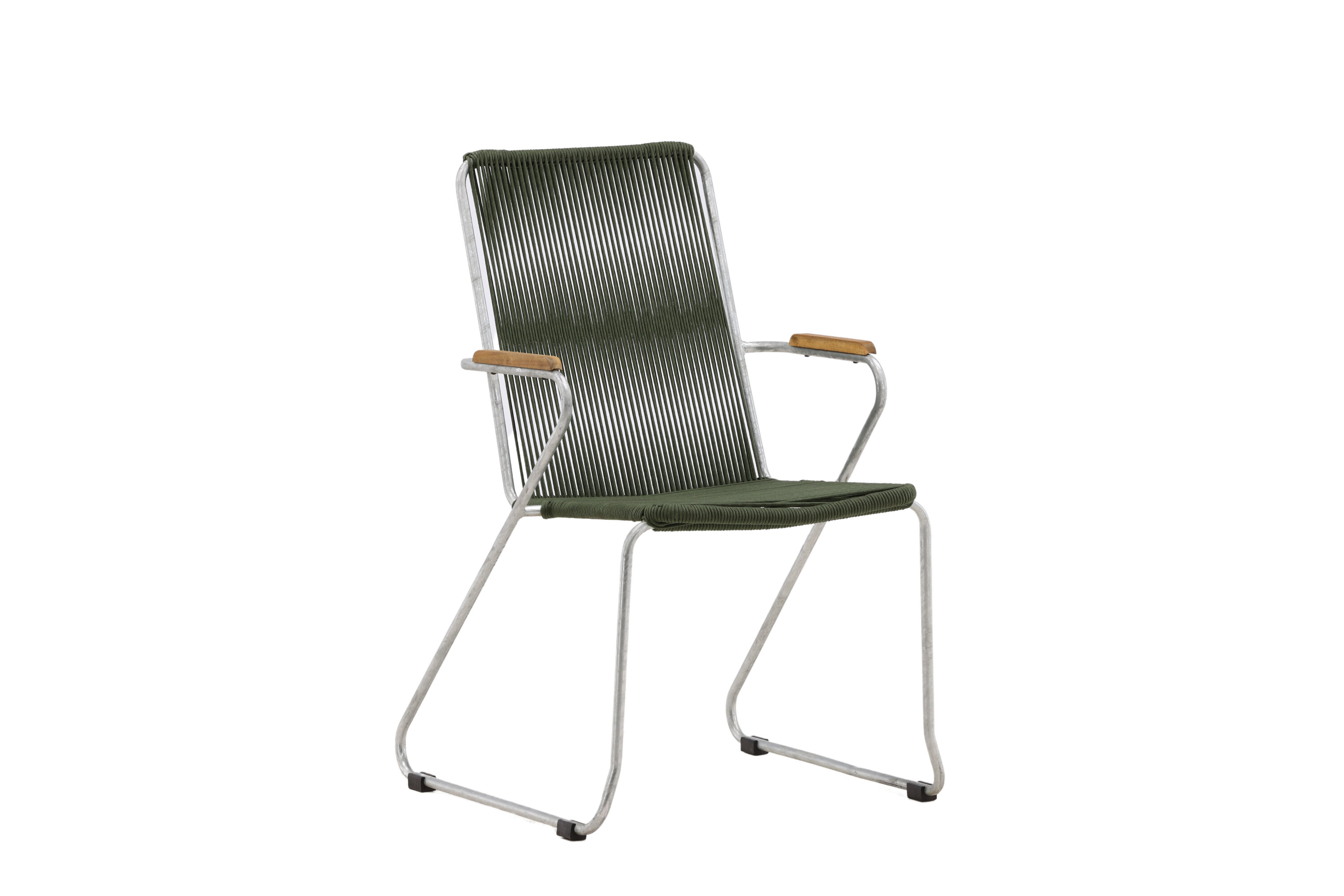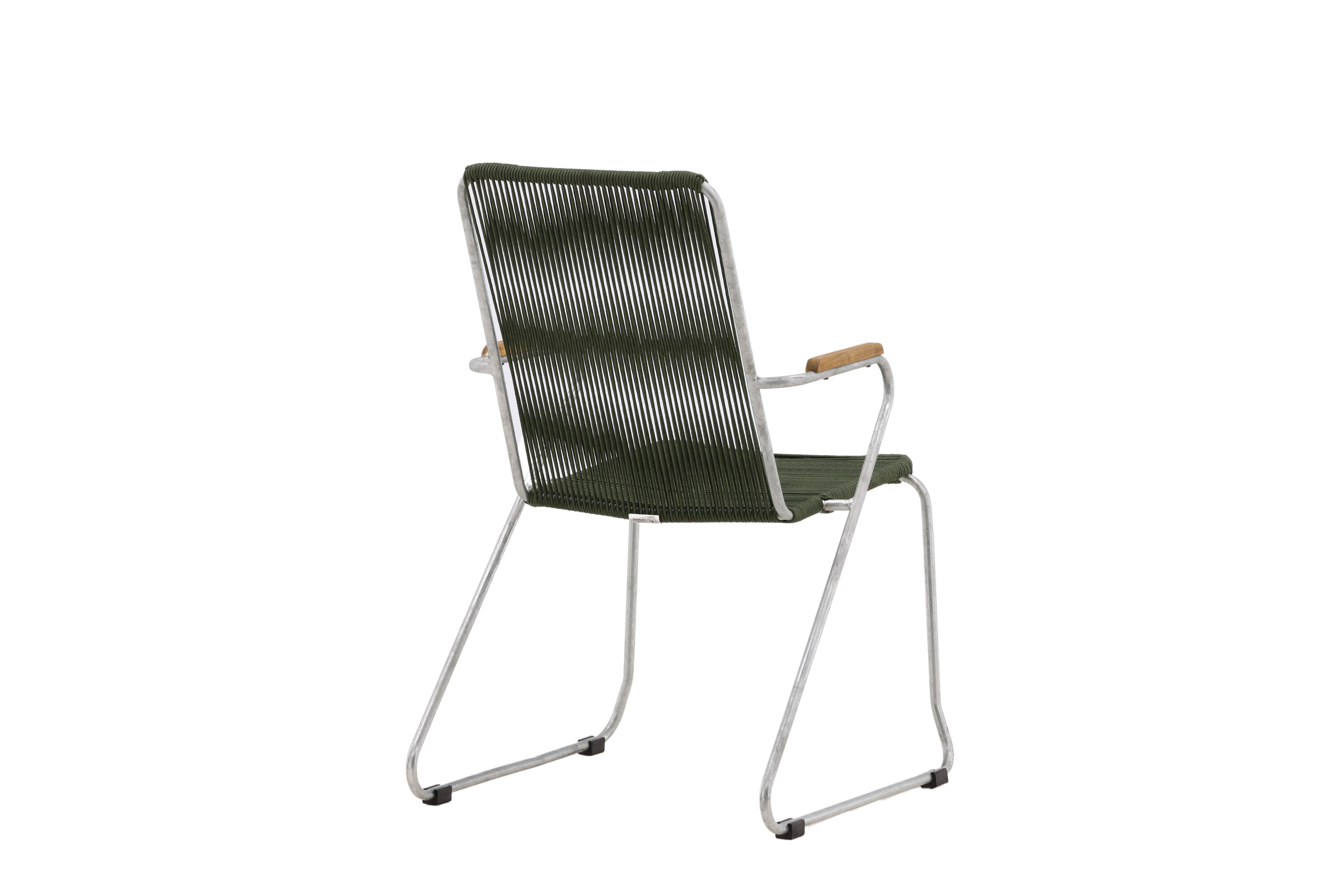 Modern, stilvoll und langlebig - ein trendiger Stuhl mit den richtigen Features! Bois hat ein komfortables Design in Zinkkonstruktion, Sitz in weichem grünem Seil und dekorative Armlehnen in Teakholz. Ein Möbelstück, das zu vielen angenehmen Momenten einlädt. Genießen Sie ein kleines Extra an schönen Mahlzeiten im Freien und statten Sie den Balkon stilvoll aus! Der Stuhl ist stapelbar.
