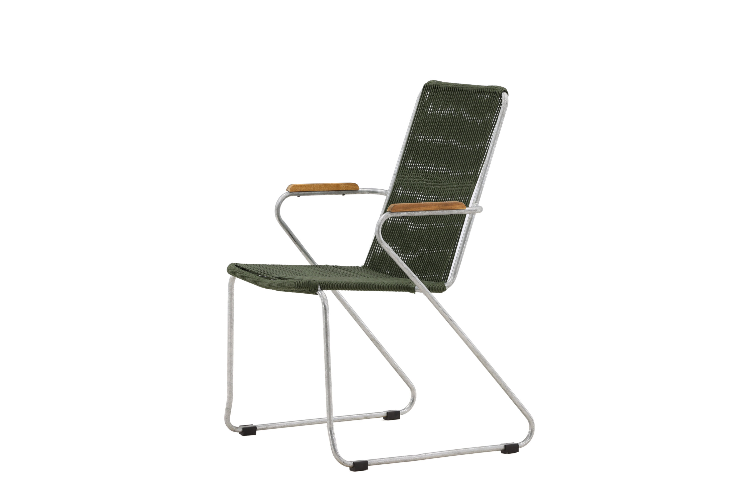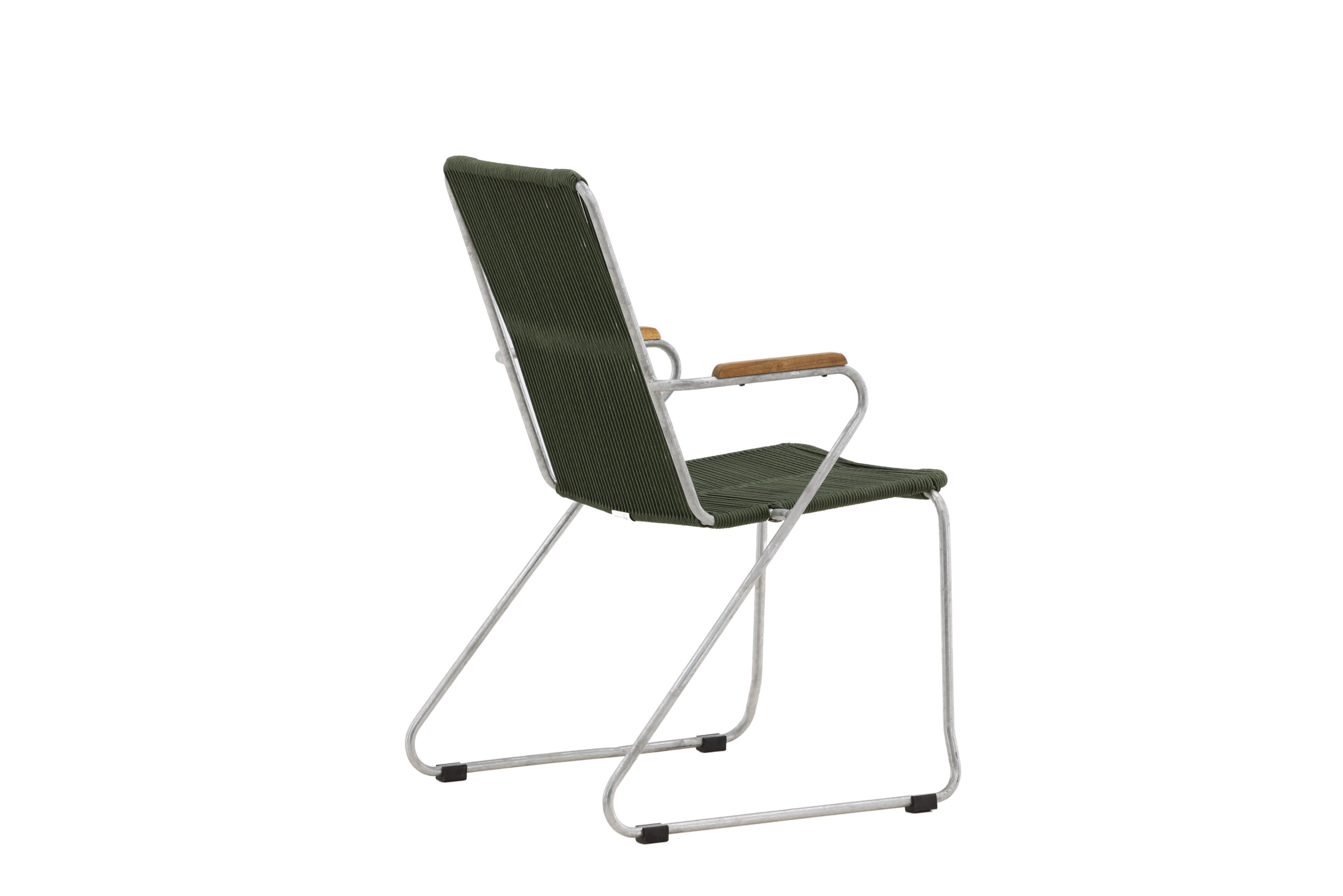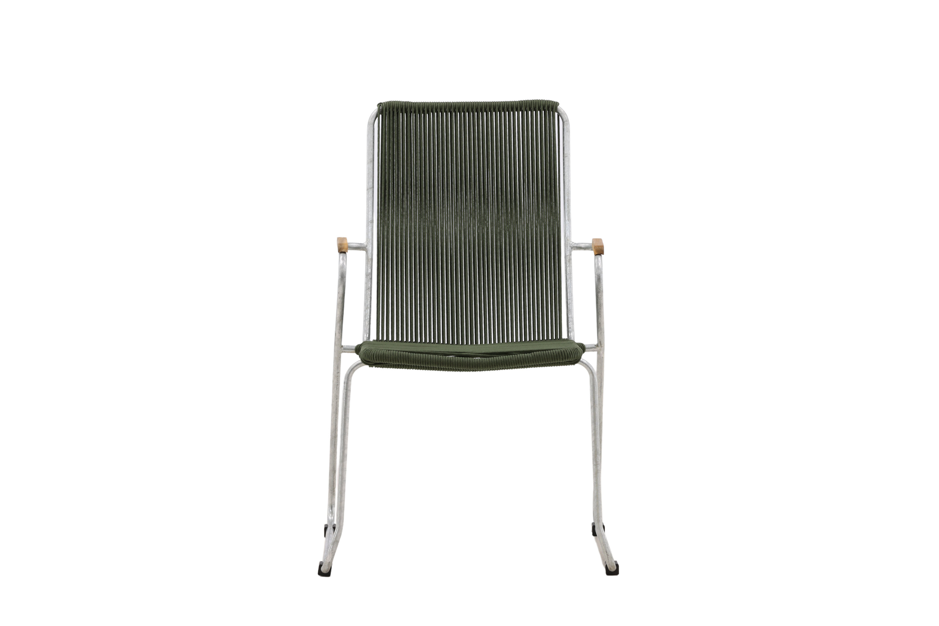 Modern, stilvoll und langlebig - ein trendiger Stuhl mit den richtigen Features! Bois hat ein komfortables Design in Zinkkonstruktion, Sitz in weichem grünem Seil und dekorative Armlehnen in Teakholz. Ein Möbelstück, das zu vielen angenehmen Momenten einlädt. Genießen Sie ein kleines Extra an schönen Mahlzeiten im Freien und statten Sie den Balkon stilvoll aus! Der Stuhl ist stapelbar.