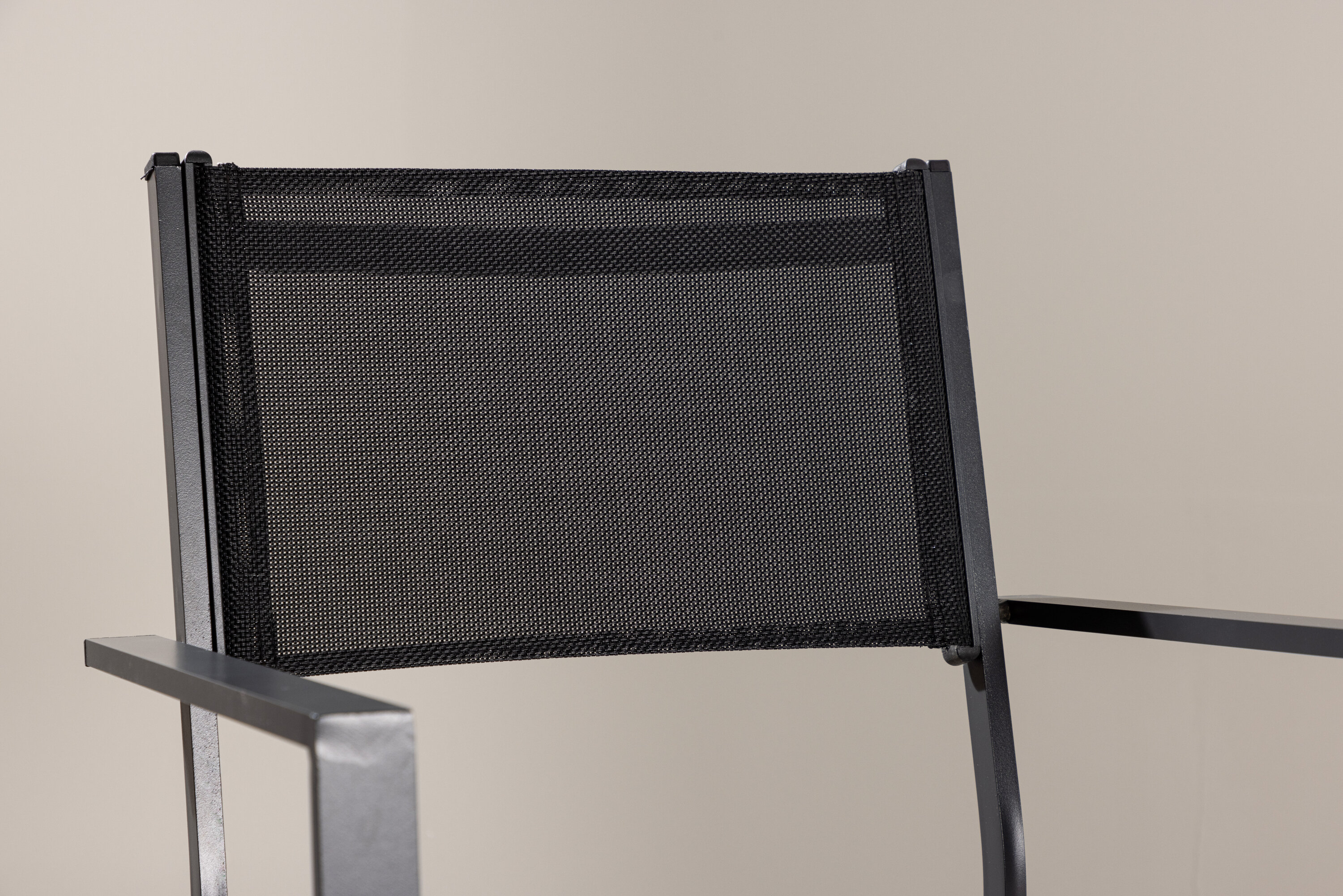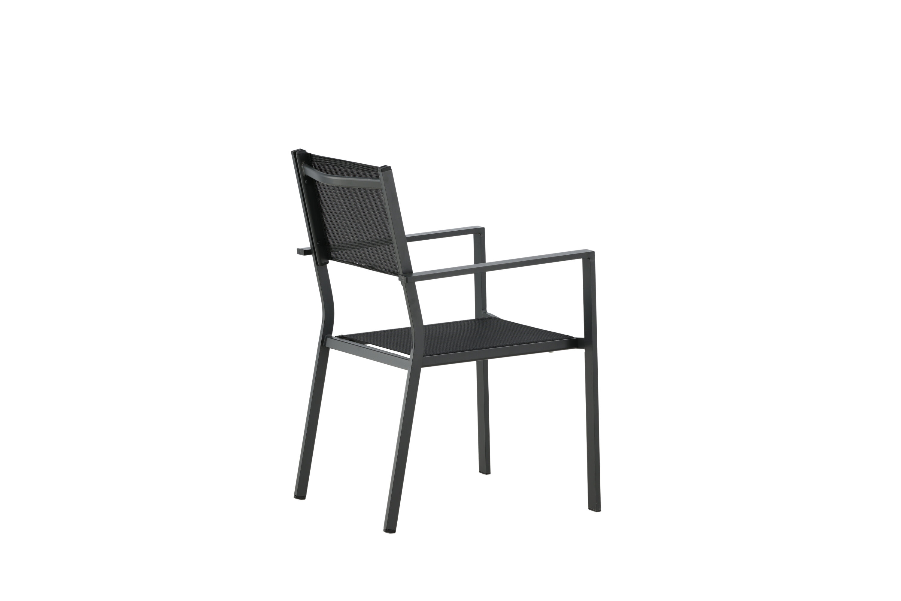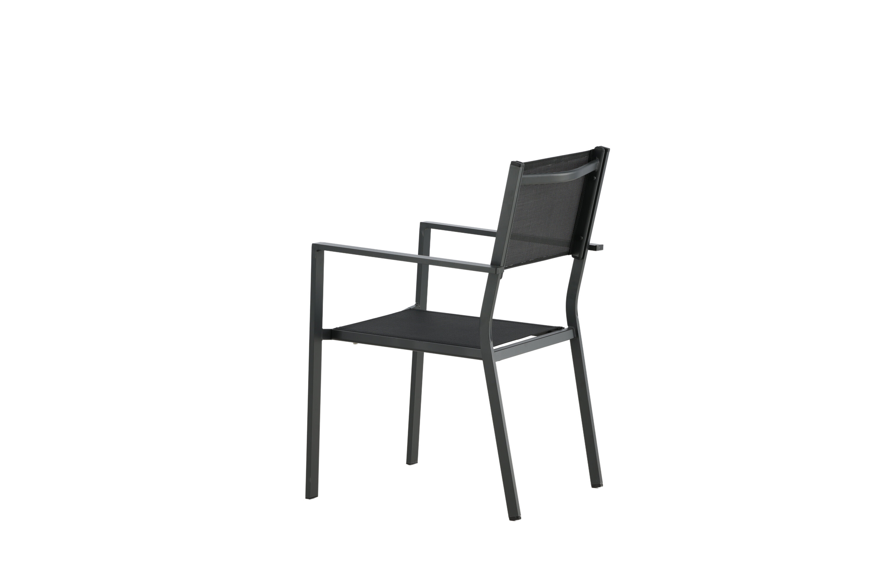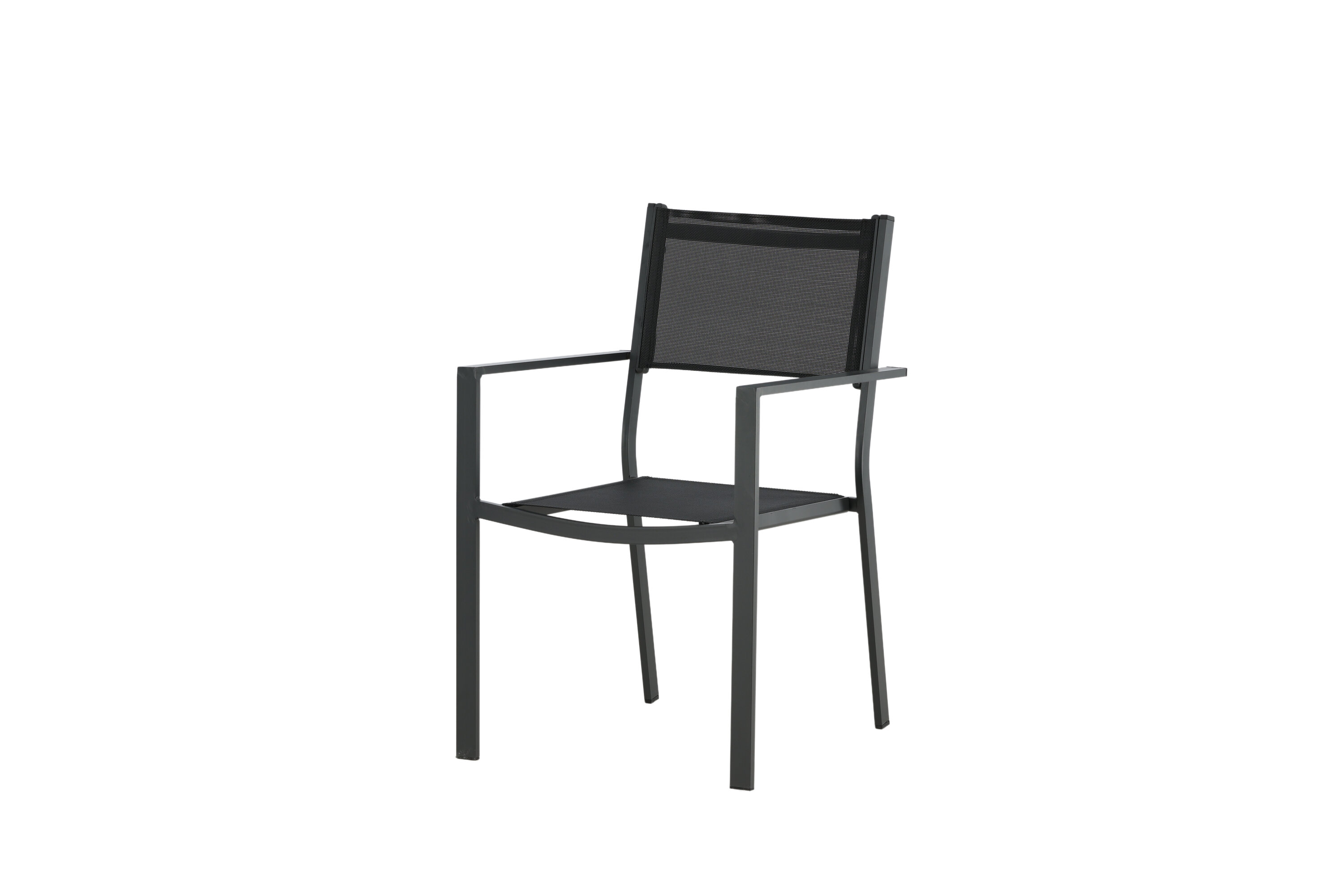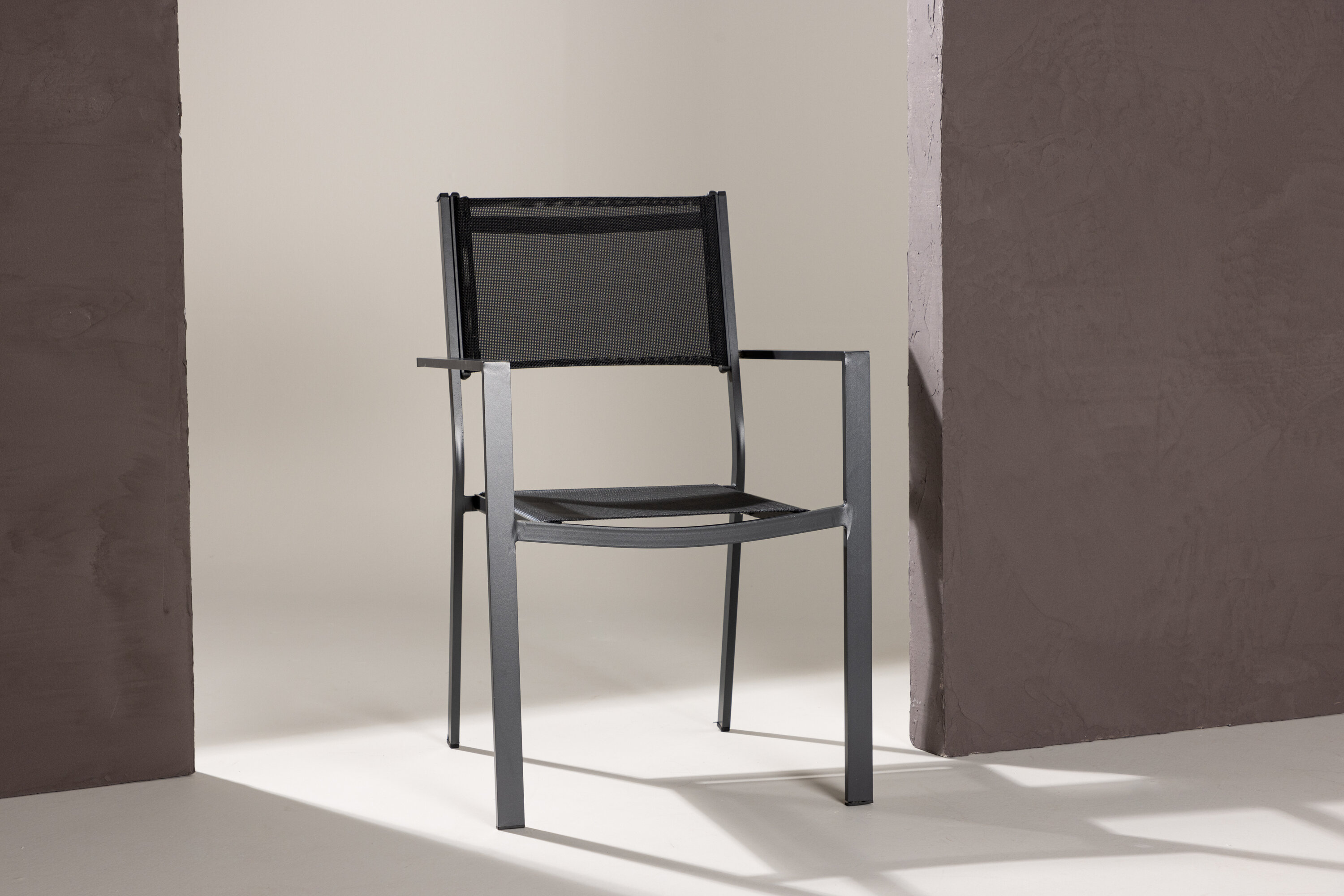 Copacabana macht sich in seinem robusten und stilvollen Design hervorragend zusammen mit anderen Outdoor-Möbeln. Die schwarze Aluminiumkonstruktion und der weiche Sitz aus schwarzen Textilien bieten Ihnen einen praktischen Esszimmerstuhl, der mit der Zeit hält. Der Stuhl ist auch stapelbar für praktische Aufbewahrung. Möblieren Sie die Terrasse in diesem Sommer elegant, ordentlich und langlebig!