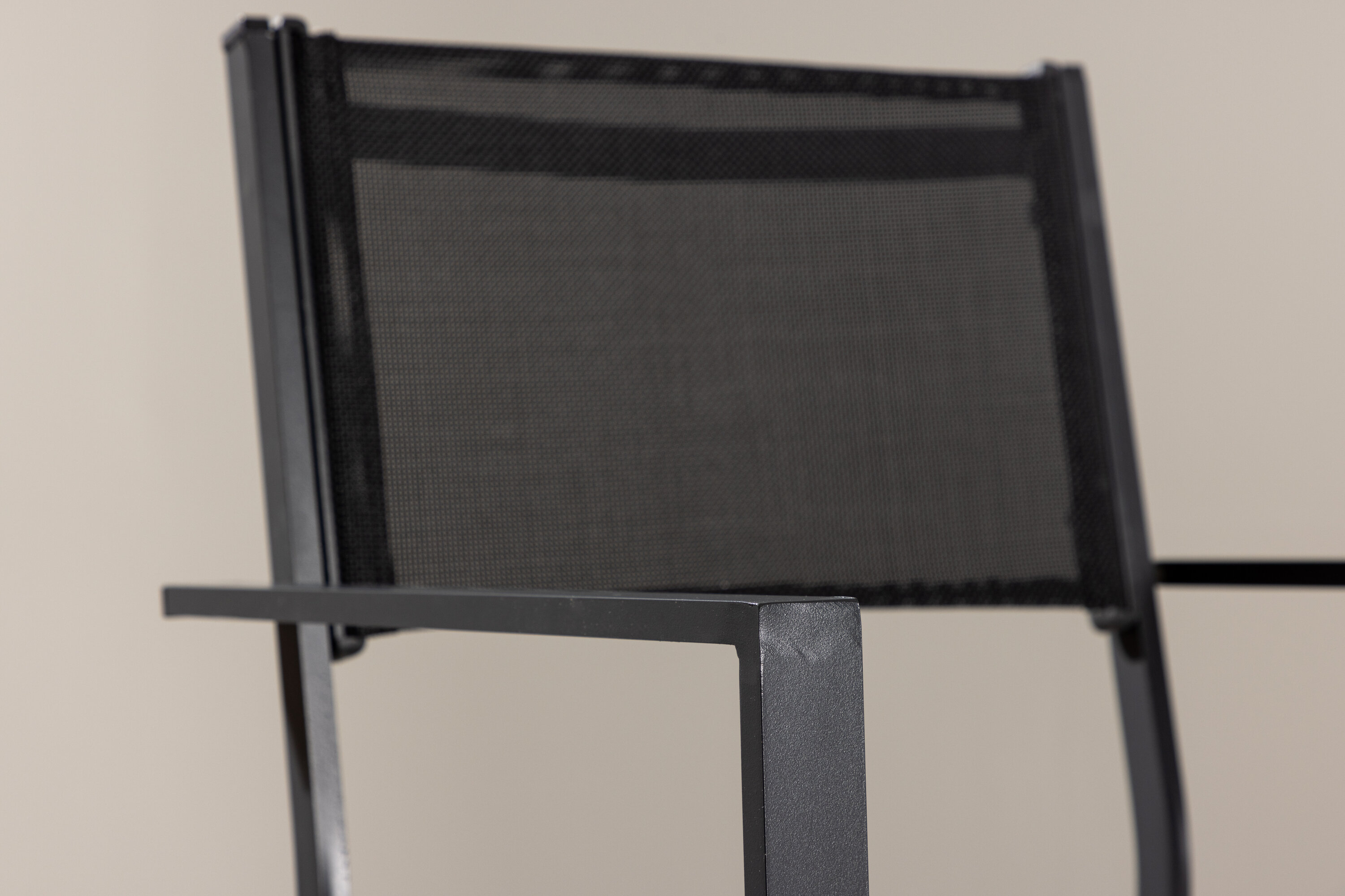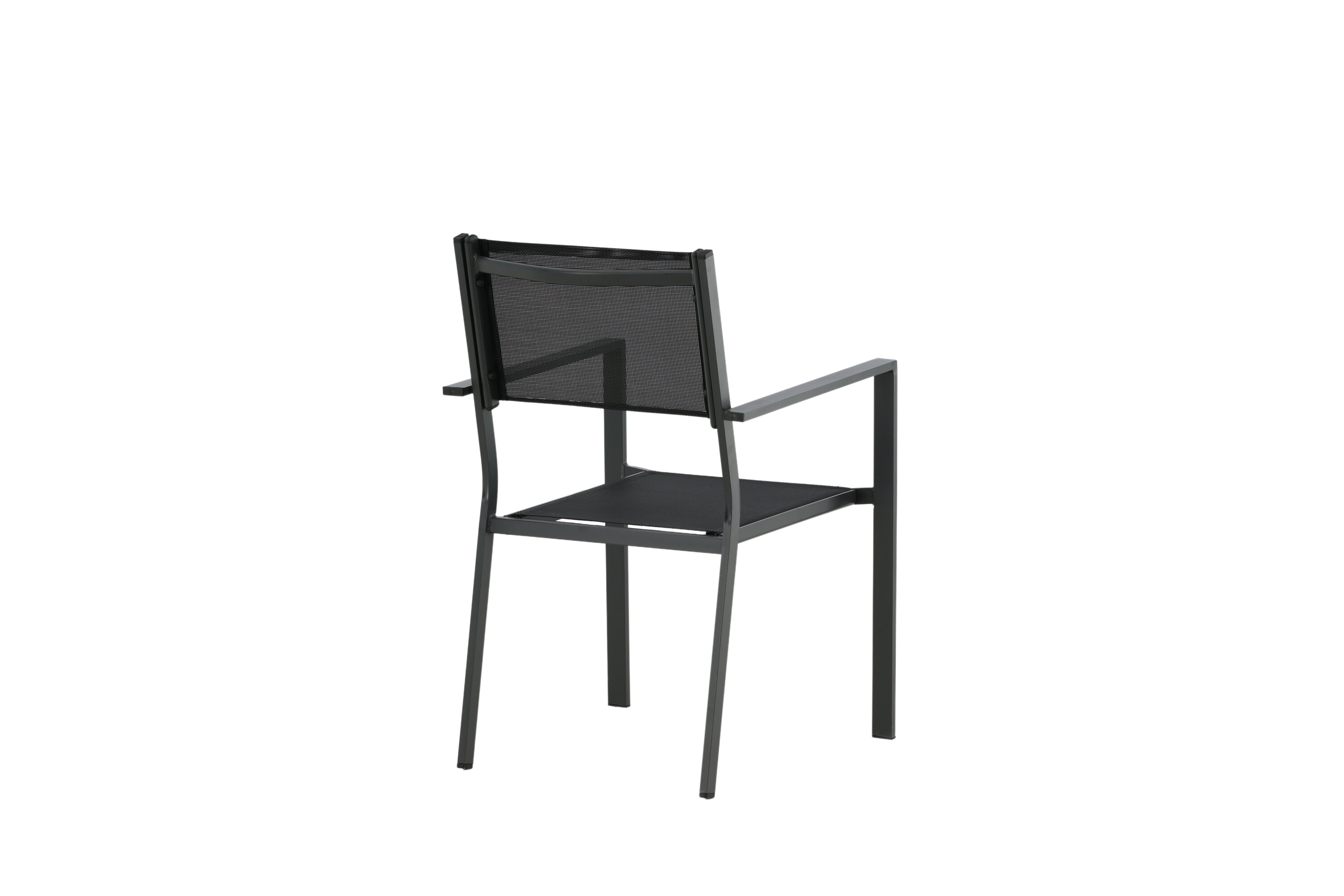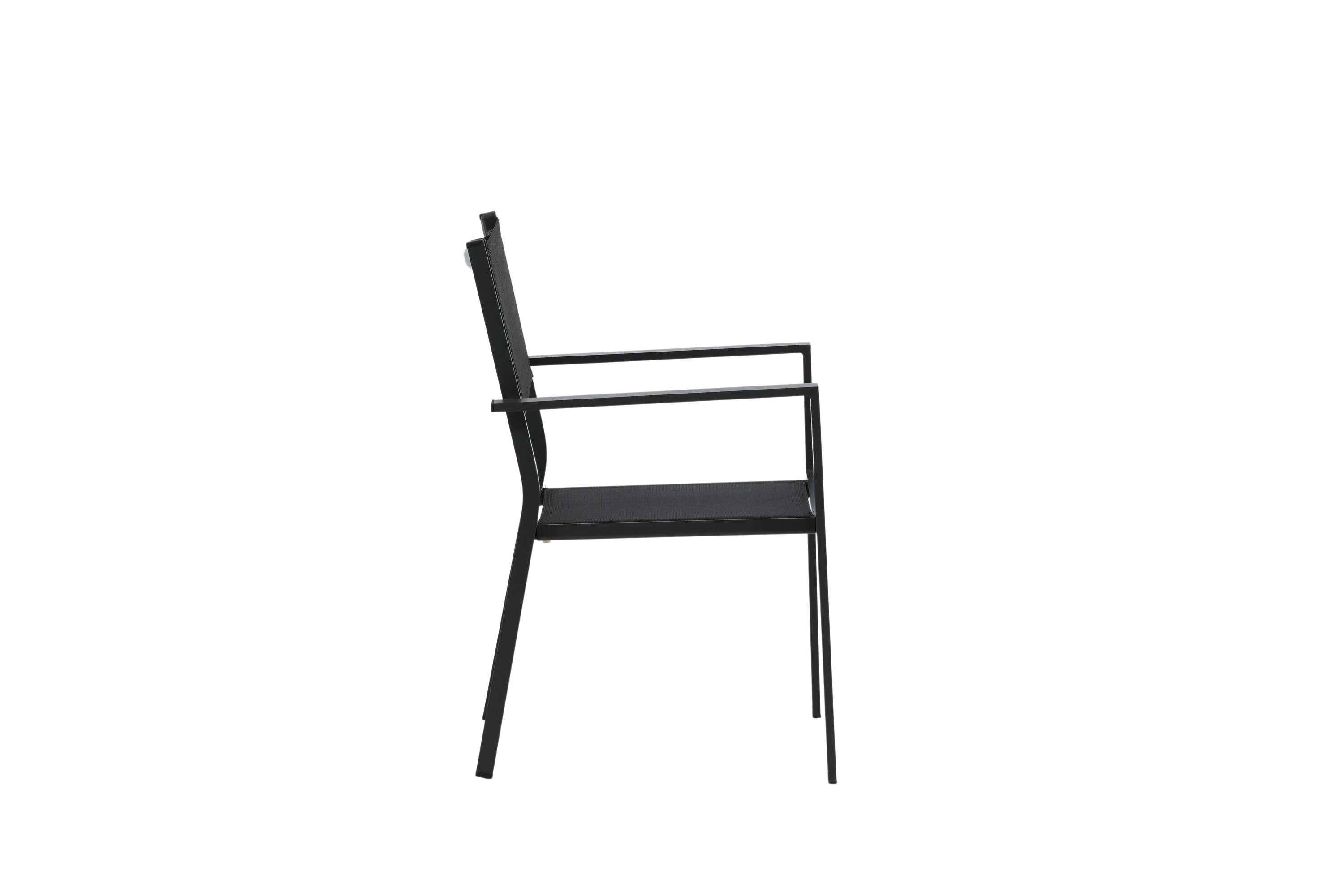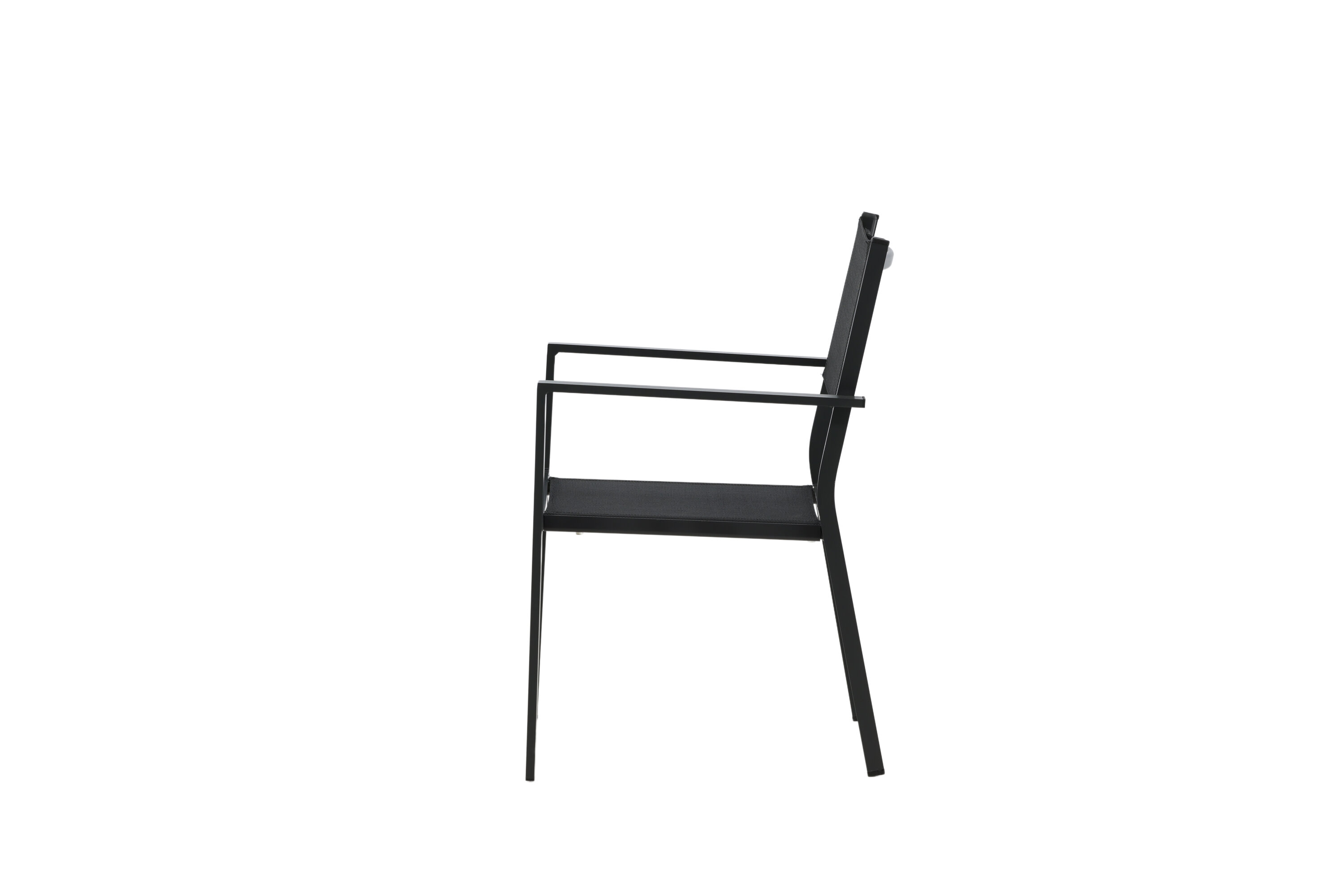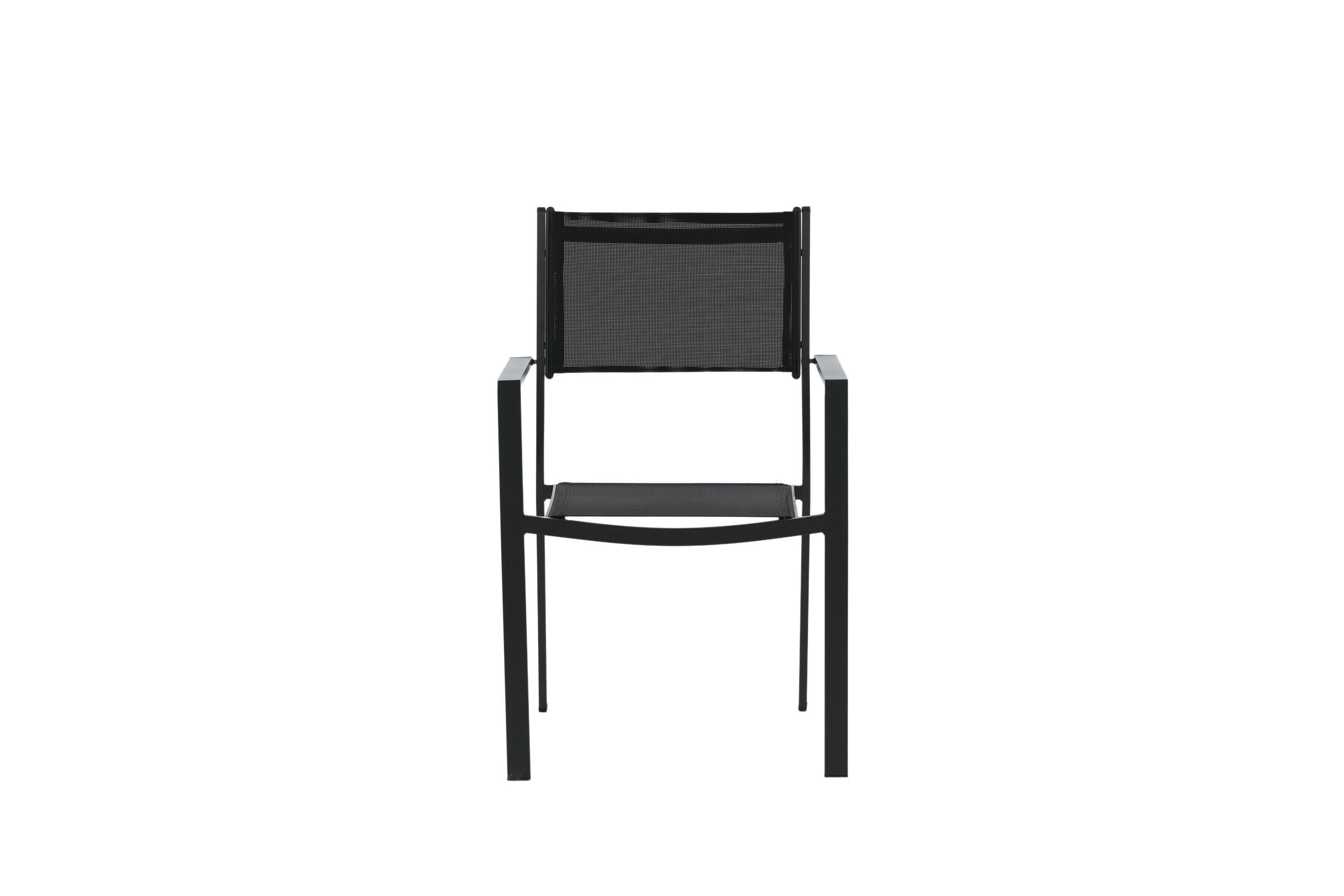 Copacabana macht sich in seinem robusten und stilvollen Design hervorragend zusammen mit anderen Outdoor-Möbeln. Die schwarze Aluminiumkonstruktion und der weiche Sitz aus schwarzen Textilien bieten Ihnen einen praktischen Esszimmerstuhl, der mit der Zeit hält. Der Stuhl ist auch stapelbar für praktische Aufbewahrung. Möblieren Sie die Terrasse in diesem Sommer elegant, ordentlich und langlebig!