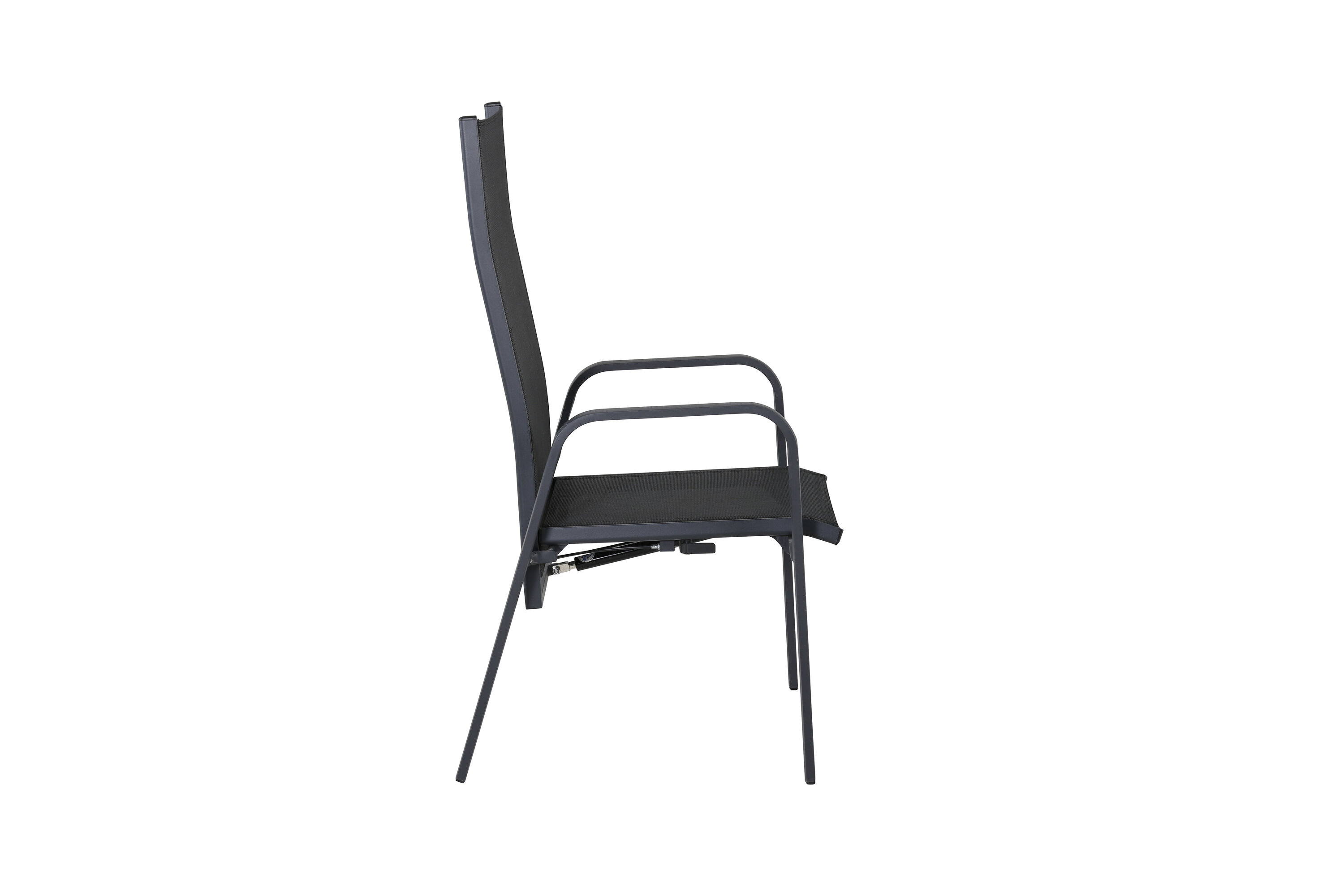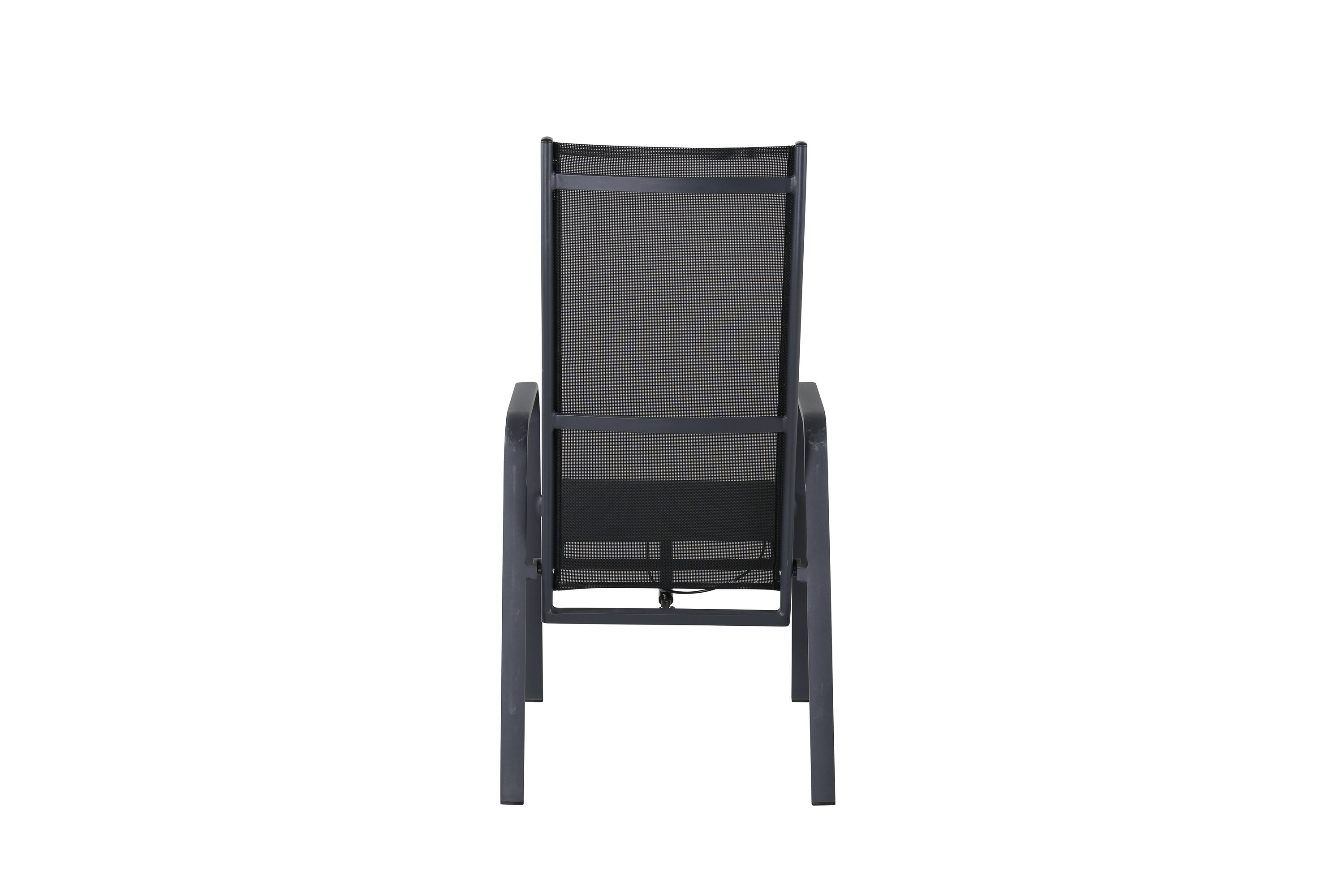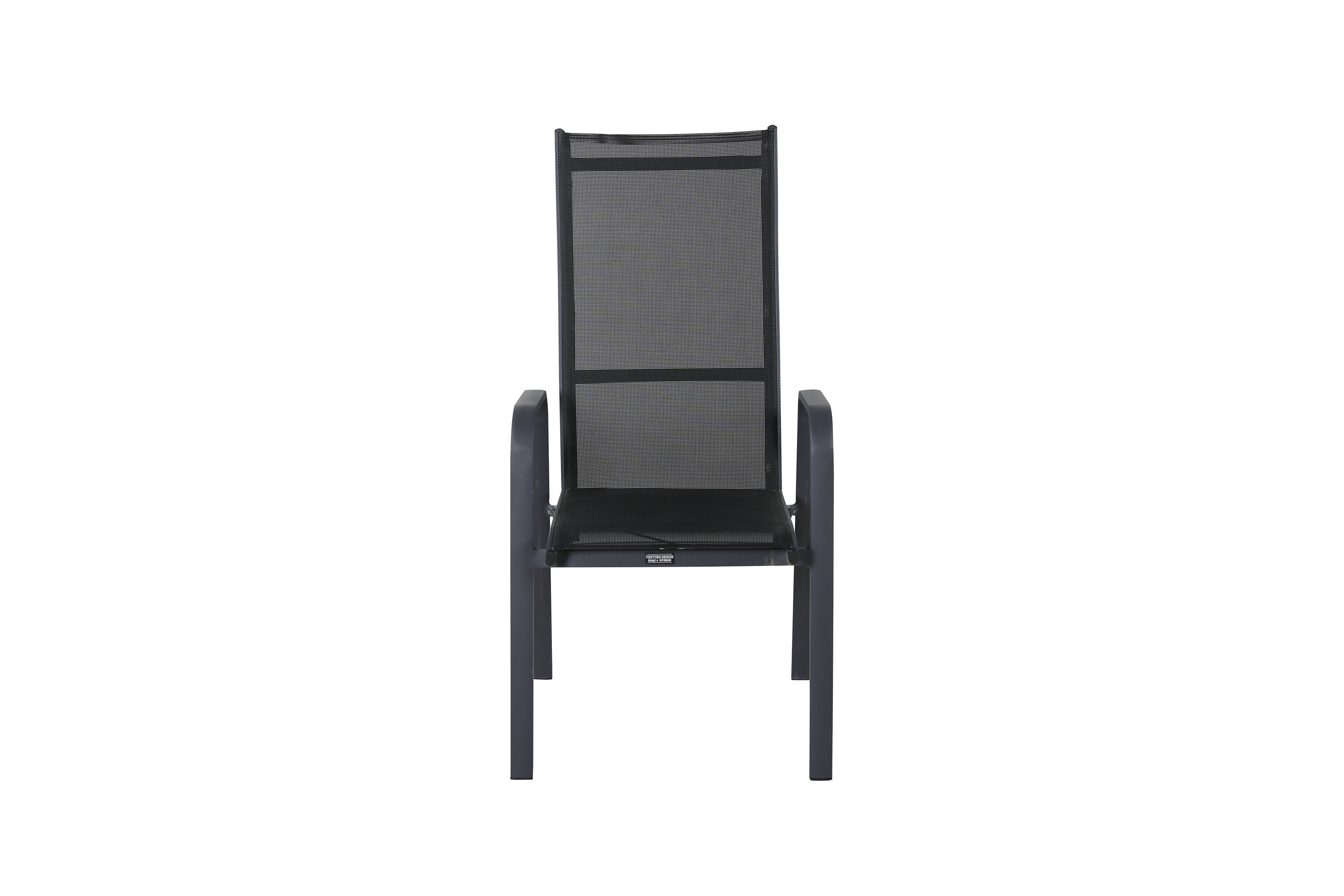 Copacabana, ein moderner Stapelsessel in schwarzer Farbe, der sich am Esstisch auf dem Balkon hervorragend macht. Die Rückenlehne des Stuhls kann eingeklemmt werden, was ihn sehr bequem und praktisch macht. Genießen Sie den Sommer auf die beste Weise!