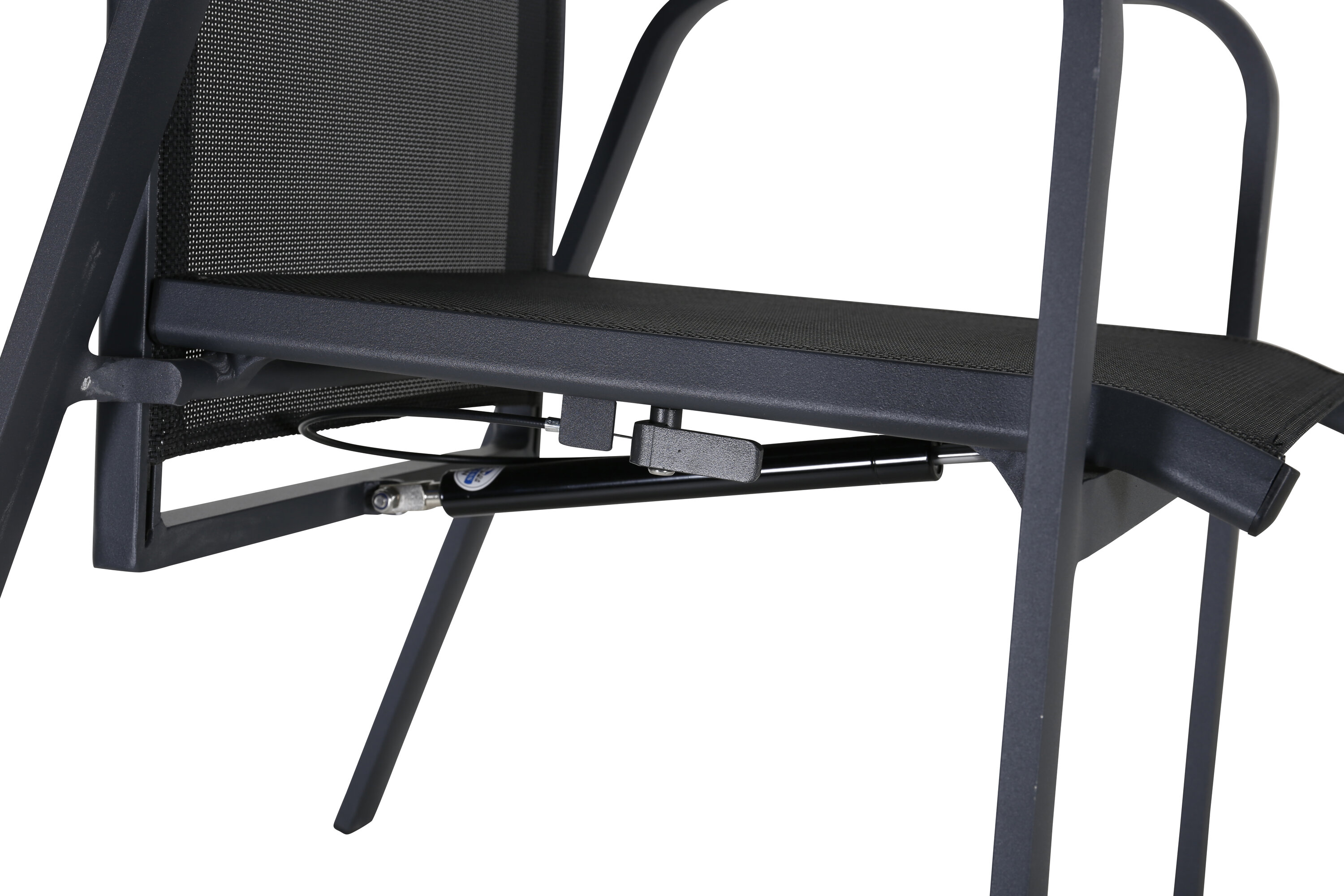 Textilene ist ein synthetisches Gewebe aus PVC-behandeltem Polyester. Das Material ist wasserbeständig und UV-behandelt, um der Bleichung der Sonne entgegenzuwirken. Die Reinigung sollte etwa einmal im Monat erfolgen. Verwenden Sie ein feuchtes Tuch und trocknen Sie es.