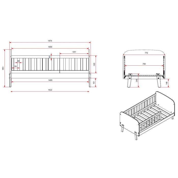 Kinderbett aus der Serie Kiddy. Hier hat jedes Kind Freude daran und das Bett lädt zum Träumen und kuscheln ein. Die Liegefläche ist 70 x 140 cm. Ein Lattenrost mit 11 Leisten gehört bereits zum Lieferumfang dazu. Der Korpus ist aus hochwertigem MDF, weiß lackiert. Die Sprossen des seitlichen Gitters sind in Kiefer massiv natur abgesetzt. Das Gitter hat eine Höhe vom Boden bis Gitter Oberkante von ca. 57 cm. Der Einstieg ins Bett ist ca. 52 cm breit, bei einer Einstiegshöhe von ca. 25 cm. Alle Kanten sind gerundet und das Kopf- und Fußteil (beide ca. 68,3 cm hoch) verläuft bogenförmig. Die Kiefer massiven Füße bieten eine hohe Standfestigkeit, bei einer Bodenfreiheit von ca. 15 cm. Für die Matratze steht eine Einlegetiefe von ca. 20 cm zur Verfügung. Die Matratze sowie die Deko gehören nicht zum Lieferumfang. Die Ware ist zerlegt, mit Montageanleitung zur einfachen Selbstmontage. Stellfläche ca.: B: 147,4 x H: 68,3 x T: 77 cm.