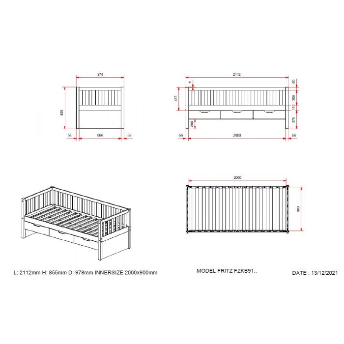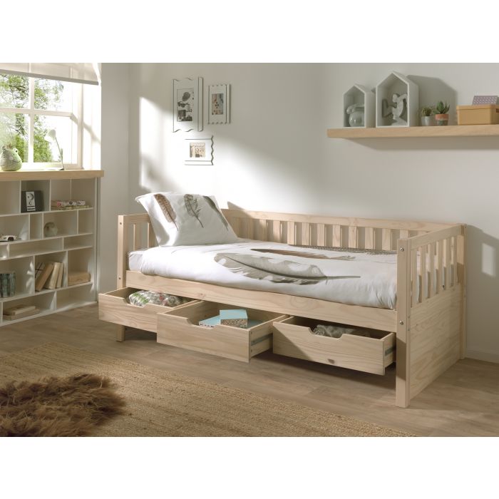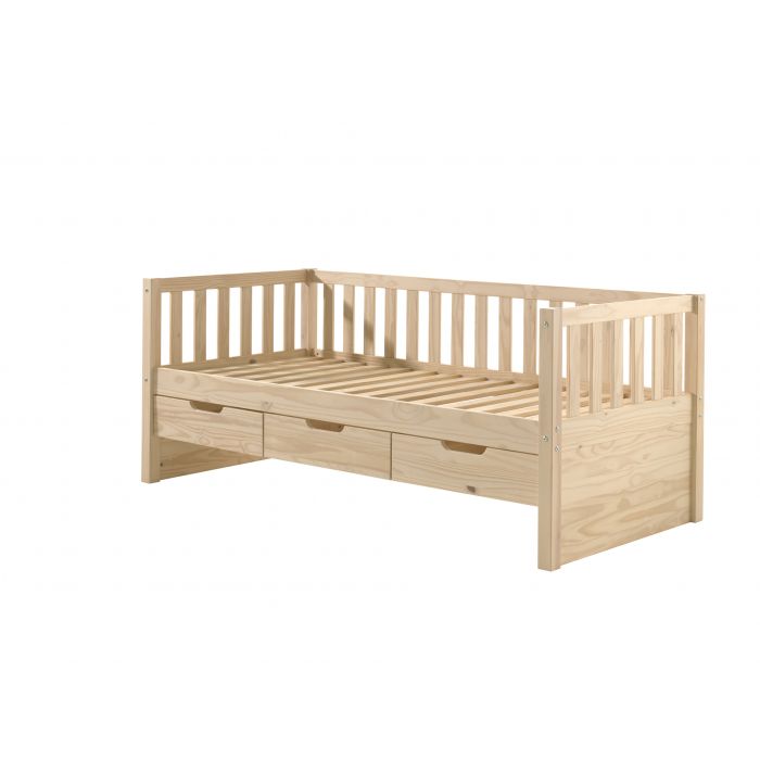 Schickes Kojen Bett mit Sprossenumrandung und 3 Schubladen, aus massiver Kiefer in Ausführung Milky Pine lackiert. Die natürliche Oberfläche ist ganz leicht weiß pigmentiert. Diese Pigmentierung ist im Lack, bewirkt dass die Holzmaserung der Kiefer noch deutlich sichtbar ist, aber nicht mehr so gelblich wie bei Kiefer Natur lackiert. Das Bett mit der Liegefläche ca. 90 x 200 cm ist universell im Kinder- oder Gästezimmer einsetzbar. Ein Rolllattenrost mit 15 Leisten gehört zum Lieferumfang. Die 3 Schubladen unter der Liegefläche lassen sich durch die Grifföffnung einfach bedienen und bieten zusätzlich Stauraum. Besonders praktisch ist, das man vom Bett aus auf die Schubladen (Innenmaß ca.: B: 60 x H: 13 x T: 49 cm) zugreifen kann. Der Artikel zeichnet sich durch hochwertige Verarbeitung und gute Stabilität aus. Die Bettpfosten haben ein Maß von ca. 56 x 56 mm, die Bettseite ist ca. 11 cm hoch und die Bodenfreiheit beträgt ca. 20 cm. Der Abstand vom Boden bis Oberkante Bettseite sind 48,5 cm. Für die Matratze steht eine Einlegetiefe von ca. 5 cm zur Verfügung. Die einzelnen Sprossen im Rücken und den Seiten sind ca. 6 cm breit und im Abstand von ca. 6,9 cm verbaut. Insgesamt hat die Bettumrandung eine Höhe von ca. 85,5 cm. Benötigte Stellfläche ca. B: 211,2 x H: 85,5 x T: 97,8 cm. Der Artikel ist zerlegt, mit Aufbauanleitung zur einfachen Selbstmontage. Die Dekoration und die Matratze gehören nicht zum Lieferumfang. FSC®-zertifiziert.