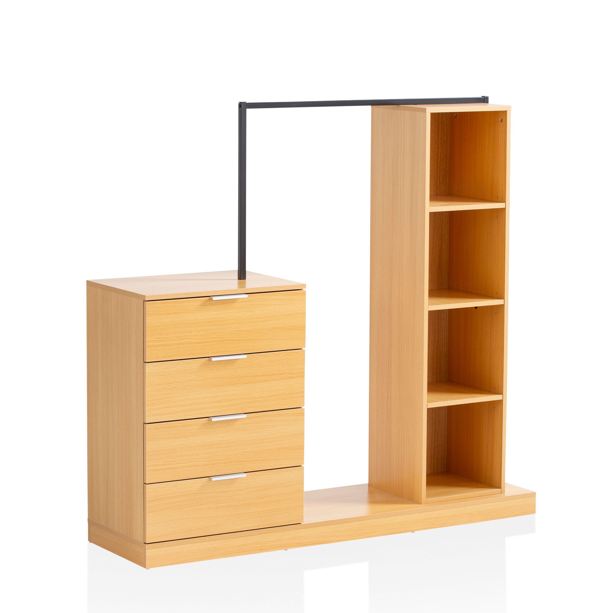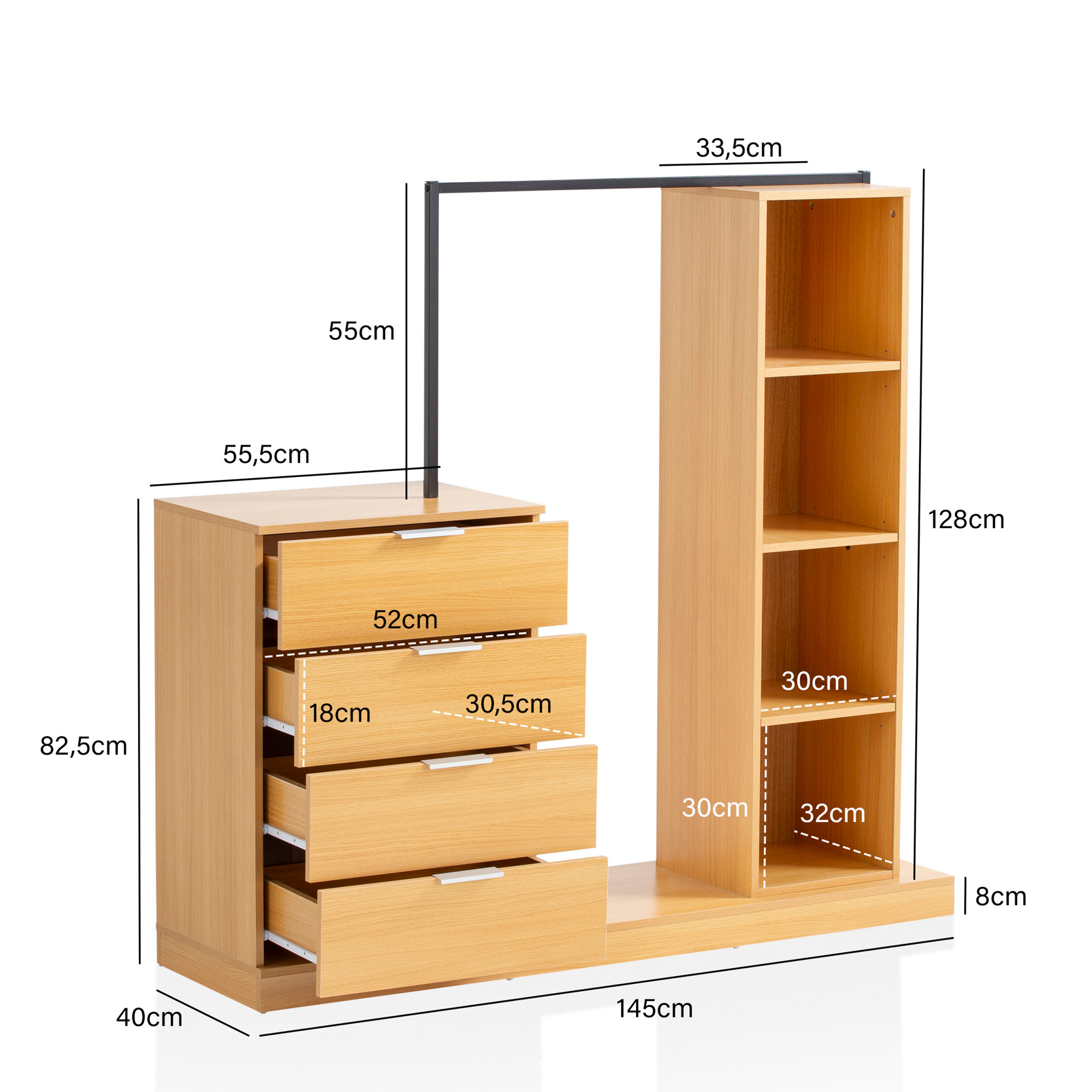 Diese moderne Garderobe im Eiche-Dekor vereint Stil und Funktionalität. Sie ist platzsparend für den Flur gestaltet und verfügt über einen stabilen Korpus mit Kleiderstange, vier Schubladen und verstellbaren Regalfächern – ideal für Schuhe, Jacken, Schals und Mützen.