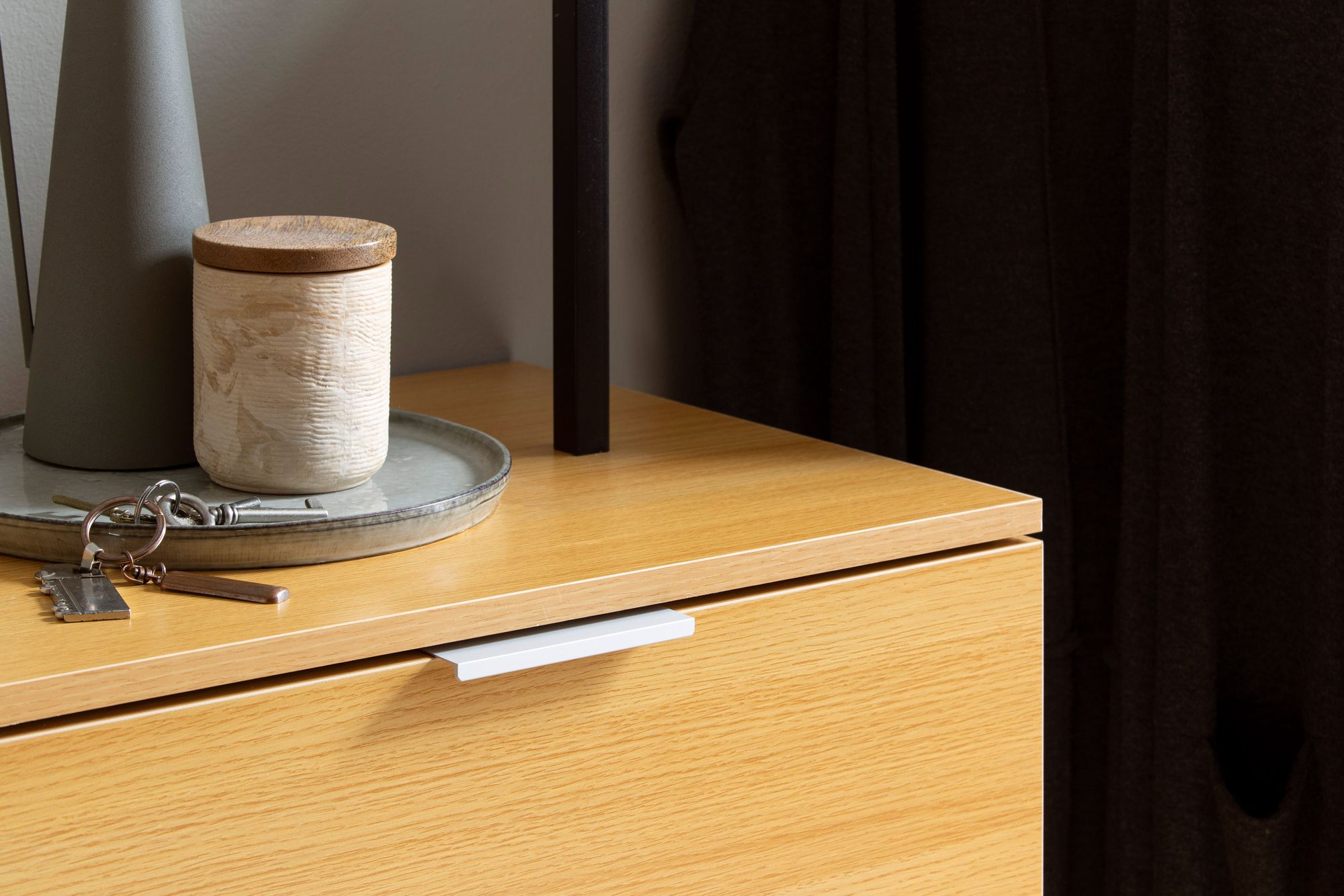 - Farbe: Korpus Eichefarben, Griffe silbern, Kleiderstange schwarz