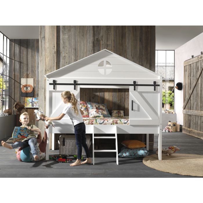 Das halbhohe Bett BARNIE, mit Rolllattenrost, ist einer Scheune nachempfunden und ein toller Platz zum Schlafen und Spielen. Das Trägermaterial ist hochwertiges MDF Weiß lackiert. Die durchgehenden Bettpfosten bieten eine hohe Stabiliät. Die Front ist einer Scheune nachempfunden und bietet viele optische Details. Die Liegefläche ist 90 x 200 cm und leicht über die kleine Leiter zu erreichen, die eine feste Position in der Mitte des Bettes hat. Die Liegehöhe ist bei ca. 65 cm. Die ca. 48 cm Bodenfreiheit unter dem Bett, lassen sich prima als Stauraum, zum Abstellen von Spielsachen nutzen. Das Bett hat einen Rolllattenrost mit 16 Leisten aus massiver Kiefer für die Liegefläche 90 x 200 cm. Die Leisten sind durch einen Textilstreifen verbunden (Abstand zwischen den Leisten ca. 5,6 cm) und haben ein Maß von ca. B: 89,5 x H: 1,7 x T: 7 cm. Die erst, mittlere und letzte Leiste muss mit der Rahmenauflageleiste des Bettes verschraubt werden. Dadurch ist der Rolllattenrost mit dem Bett fest verbunden. Die Einlegetiefe für die Matratze ist ca. 9 cm. An der Kopf- und Fußseite hat das Bett jeweils ein Fenster in der Breite von 71 cm und einer Höhe von 60,5 cm. Frontseitig befindet sich der große Betteinstieg (Maße ca.: B: 90 x H: 71 cm). Rechts und links daneben sind zwei Scheuentore. Diese sind aus Sicherheitsgründen natürlich feststehend. Die Gestaltung und angedeutete Beschlagtechnik spiegeln die Liebe zum Detail wieder. Das Dach hat zwei Öffnungen auf jeder Seite. Warnhinweis: Das Dach darf nicht bestiegen werden. Zur Rückseite hin, ist das Bett offen. Die Ware ist hochwertig verarbeitet und die Beschläge sind aus Metall. Die Matratze und die Deko gehören nicht zum Lieferumfang. Die Ware ist zerlegt, mit Montageanleitung zur einfachen Selbstmontage. Stellfläche ca.: B: 218,3 x H: 201,8 x T: 137 cm.