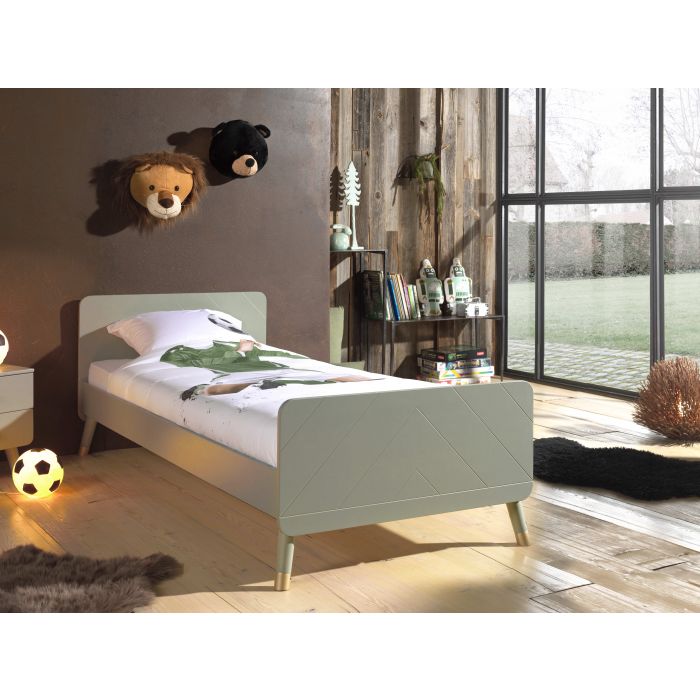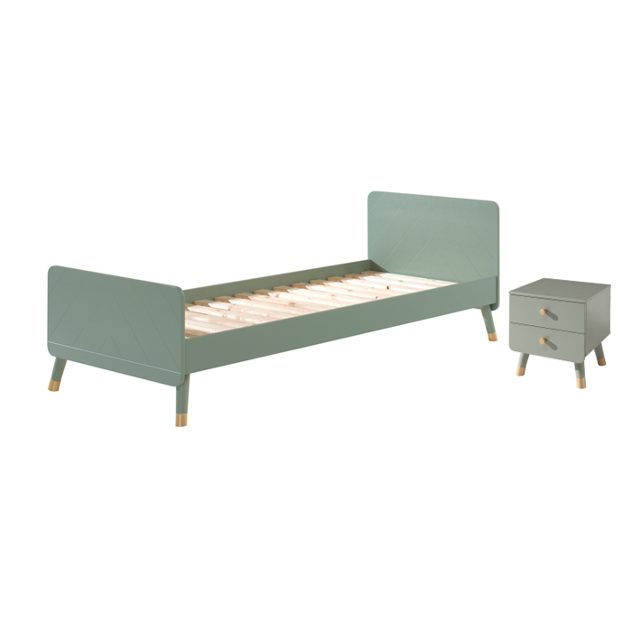 Artikelset BILLY best. aus Einzelbett und Nachtkonsole. Einzelbett mit gradlinigem Kopf- und Fußteil in 18 mm Stärke. Die diagonalen Rillenprofile geben dem Bett eine besondere Optik. Das Material ist hochwertiges MDF und die Oberfläche ist Olive Grün lackiert. Die Liegefläche ist 90 x 200 cm und ein Lattenrost mit 16 Leisten (70 x 15 mm) ist bereits im Lieferumfang inbegriffen. Mit den schräg ausgestellten Füßen, wird die Retro-Optik unterstrichen. Am unteren Ende sind diese goldfarbig abgesetzt. Das Kopfteil ist ca. 73,5 cm hoch und das Fußteil ca. 55,6 cm hoch. Die 14 cm hohe Bettseite bietet eine Einlegetiefe für die Matratze von ca. 6 cm. Das Bett ist unten offen und die seitliche Bodenfreiheit ist ca. 20,5 cm, am Kopf- und Fußteil beträgt sie ca. 15,6 cm. Die Matratze sowie die Deko gehören nicht zum Lieferumfang. Stellfläche ca.: B: 203,6 x H: 73,5 x T: 95 cm. Nachtkonsole mit zwei Schubladen. Das Material ist hochwertiges MDF und die Oberfläche ist in Olive Grün lackiert. Alle Kanten der unteren Schublade sind gerundet. Mit den schräg ausgestellten Füßen, wird die Retro-Optik unterstrichen. Seitlich ist die Bodenfreiheit ca. 17 cm, vorne ca. 13 cm. Die Schubladen laufen auf einer Metallführung und haben ein Innenmaß von ca. B: 33 x H: 6,7 x T: 34 cm. Der Griff auf der Schublade ist ebenso wie die Füße goldfarbig abgesetzt. Die Deko gehört nicht mit zum Lieferumfang. Die Ware ist zerlegt zur einfachen Selbstmontage. Stellfläche ca.: B: 43,2 x H: 45,2 x T: 40 cm.