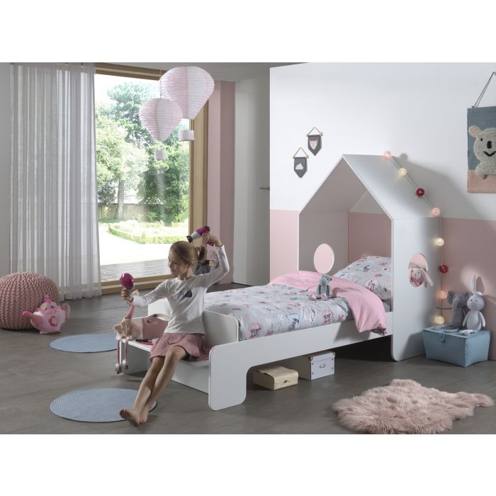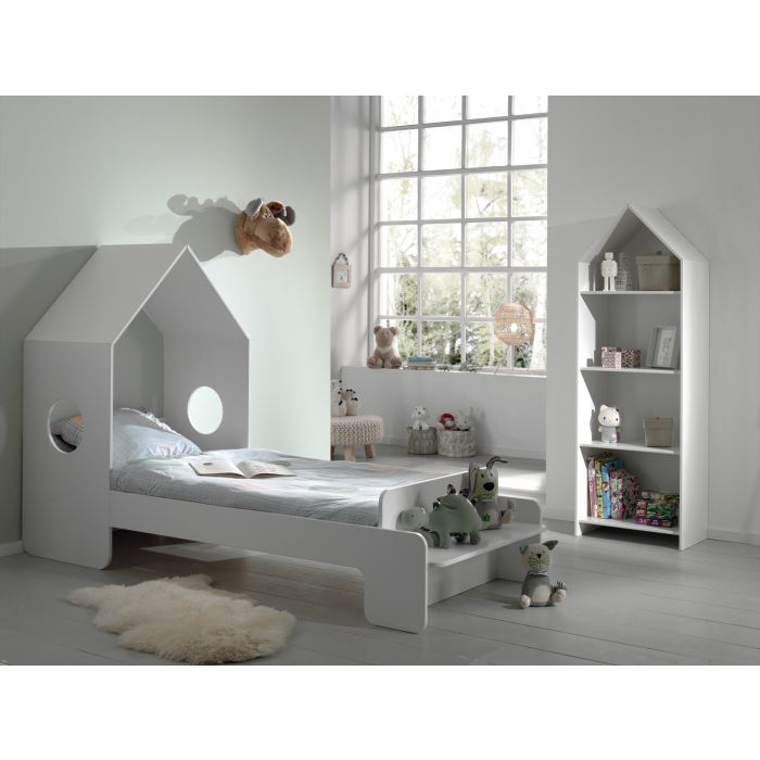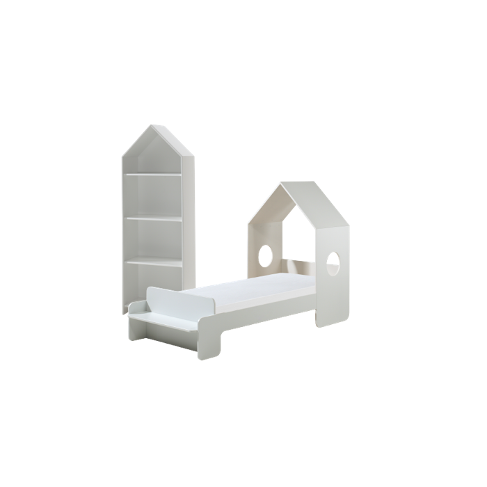 Artikelset CASAMI 2-tlg., best. aus dem traumhaften Kinderbett mit der Liegefläche 90 x 200 cm und kleiner Ablage. Der Lattenrost mit 15 Leisten (68 x 16 mm) ist bereits im Lieferumfang enthalten. Der hochwertige MDF Werkstoff ist Weiß lackiert und die Kanten am Bett sind alle gerundet. Ein sehr schönes Detail ist der kleine Dachüberbau am Kopfteil mit den zwei runden Ausschnitten im Durchmesser von 25 cm. Das Kopfteil Paneel hat eine Höhe von ca. 50 cm, darüber ist das Bett offen. Die Bettseiten sind damit fest mit dem Aufbau verbunden und bieten somit eine hohe Standfestigkeit für das Bett. Die Einlegetiefe für die Matratze beträgt ca. 10 cm und die Bodenfreiheit ist mit 20 cm ausreichend, um noch kleinere Dinge darunter zu verstauen. Die kleine Ablage hat eine Fläche von ca.: B: 90 x T: 25 cm und kann mit max. 20 kg belastet werden. Das kleine Rückenteil (23,5 cm hoch) dient prima als Rückenlehne. Die Matratze sowie die Deko gehören nicht zum Lieferumfang. Stellfläche Kinderbett ca.: B: 229,5 x H: 147,6 x T: 93,6 cm. Ebenso gehört das praktische Regal aus dem Programm CASAMI, ist eine ideale Ergänzung und passt sowohl in das Kinderzimmer, die Diele oder in den Wohnbereich. Es ist eine dekorative Stauraummöglichkeit für Bücher, Bilder oder Accessoires. Der Regalschrank hat drei Einlegeböden und bietet viel Platz für dekorative Gegenstände, die Fachinnenmaße sind ca.: B: 54 x H: 38 x T: 35 cm. Die Bodenfreiheit beträgt ca. 7 cm. Der Korpus ist aus hochwertigem MDF Holzwerkstoff und ist Weiß lackiert. Die Rückwand ist in Weiß Dekor beschichtet. Die Deko gehört nicht zum Lieferumfang. Eine Wandbefestigung ist erforderlich. Die Ware ist zerlegt, mit Montageanleitung zur einfachen Selbstmontage. Stellfläche Regal ca.: B: 57,6 x H: 171,3 x T: 37 cm.