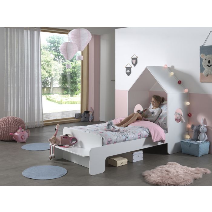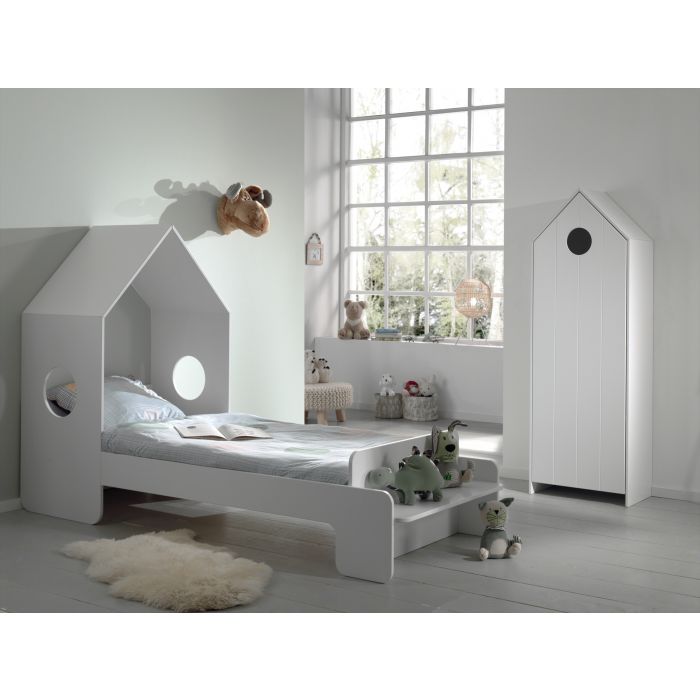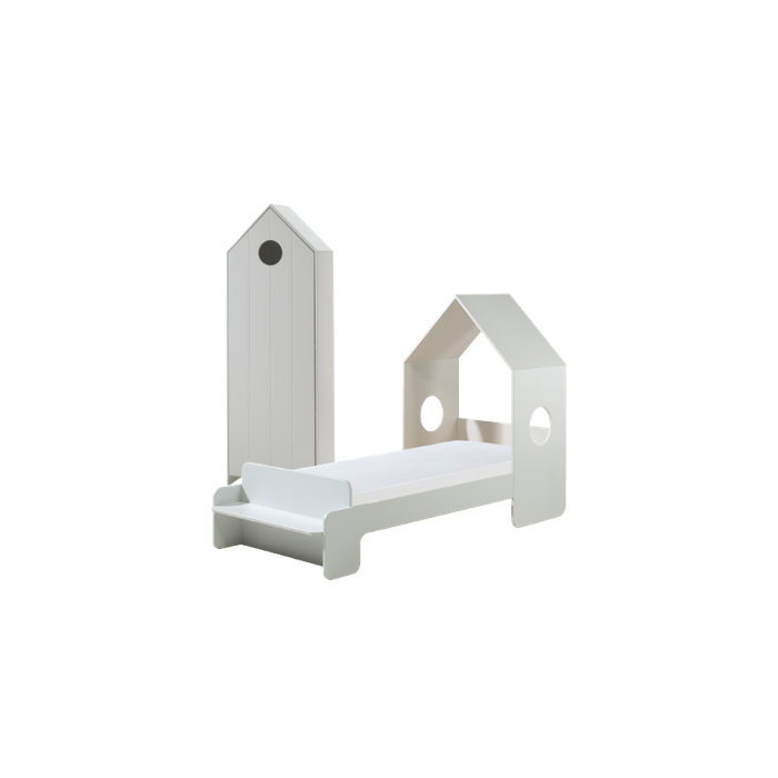 Artikelset CASAMI 2-tlg., best. aus dem traumhaften Kinderbett mit der Liegefläche 90 x 200 cm und kleiner Ablage. Der Lattenrost mit 15 Leisten (68 x 16 mm) ist bereits im Lieferumfang enthalten. Der hochwertige MDF Werkstoff ist Weiß lackiert und die Kanten am Bett sind alle gerundet. Ein sehr schönes Detail ist der kleine Dachüberbau am Kopfteil mit den zwei runden Ausschnitten im Durchmesser von 25 cm. Das Kopfteil Paneel hat eine Höhe von ca. 50 cm, darüber ist das Bett offen. Die Bettseiten sind damit fest mit dem Aufbau verbunden und bieten somit eine hohe Standfestigkeit für das Bett. Die Einlegetiefe für die Matratze beträgt ca. 10 cm und die Bodenfreiheit ist mit 20 cm ausreichend, um noch kleinere Dinge darunter zu verstauen. Die kleine Ablage hat eine Fläche von ca.: B: 90 x T: 25 cm und kann mit max. 20 kg belastet werden. Das kleine Rückenteil (23,5 cm hoch) dient prima als Rückenlehne. Die Matratze sowie die Deko gehören nicht zum Lieferumfang. Stellfläche Kinderbett ca.: B: 229,5 x H: 147,6 x T: 93,6 cm. Ebenso gehört der praktische Schrank aus dem Programm CASAMI dazu. Er hat die dekorative Optik eines Strandhaus-Schrankes. Die Innenausstattung kann der Kunde selbst bestimmen. Im Lieferumfang sind drei Einlegeböden und eine Kleiderstange (Belastbarkeit ca. 5 kg). Entweder bieten die vier Fächer viel Platz für Bekleidung und Wäsche, die Fachinnenmaße sind ca.: B: 54 x H: 38 x T: 35 cm, oder er montiert die Kleiderstange und hat dann Hängemöglichkeiten für Bekleidung. Die Bodenfreiheit beträgt ca. 7 cm. Der Korpus ist aus hochwertigem MDF Holzwerkstoff und ist Weiß lackiert. Die Front, ebenfalls aus MDF, hat senkrecht verlaufende Rillenprofile und ist Weiß lackiert. Durch das Griffloch (ca. 15 cm Durchmesser) ist die Tür einfach zu öffnen. Alternativ kann seitlich an der Tür ein weißer Metallgriff angebracht werden. Dieser ist bereits im Lieferumfang enthalten. . Die Rückwand ist in Weiß Dekor beschichtet. Die Deko gehört nicht zum Lieferumfang. Eine Wandbefestigung ist erforderlich. Die Ware ist zerlegt, mit Montageanleitung zur einfachen Selbstmontage. Stellfläche Schrank ca.: B: 57,6 x H: 171,3 x T: 37 cm.