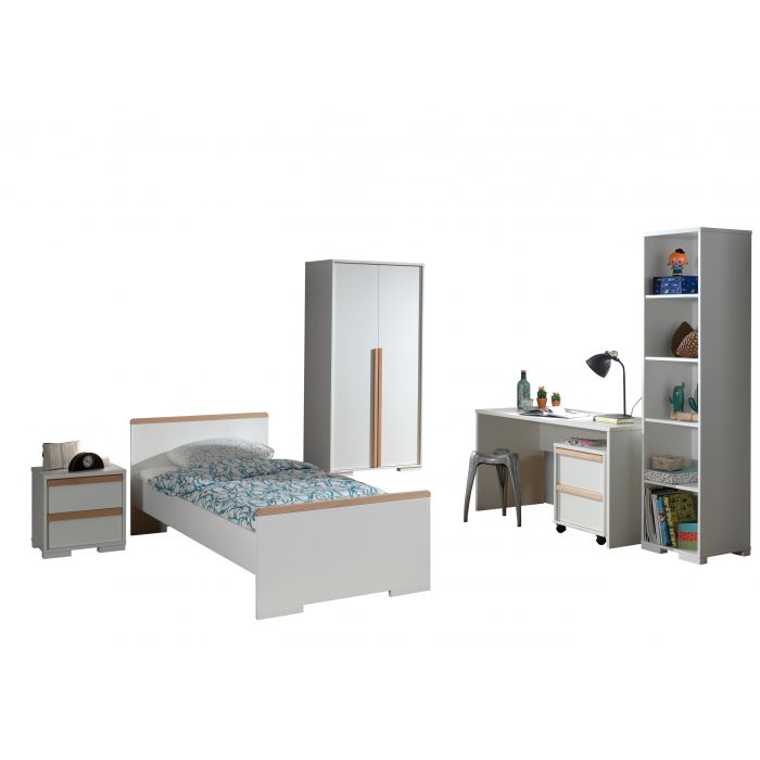 Artikelset LONDON 6-tlg. best. aus: Das Jugendzimmer LONDON zeichnet sich durch das gradlinige Design und die Kombinationsvielfalt der Einzeltypen aus. Es werden geschmackvolle Akzente mit Massivholz gesetzt, die zu einer wohnlichen Atmosphäre beitragen. Der hochwertige Holzwerkstoff als Trägermaterial hat eine pflegeleichte Oberfläche in Dekor Farbe Weiß. Die eingesetzten Materialstärken (ca. 25 mm) bieten eine solide Verarbeitung, Stabilität und Standfestigkeit. Das Einzelbett hat eine Liegefläche von 90 x 200 cm und ist mit seinen vier Auflagewinkeln ausschließlich für einen festen Lattenrost geeignet. Den Abschluss beim Kopf- (Höhe ca. 76,1 cm) und Fußteil (Höhe ca. 52 cm) bildet jeweils eine Leiste aus massiver Buche in Ausf. natur. Die Bodenfreiheit beträgt seitlich ca. 20 cm, am Kopf- und Fußteil jeweils ca. 3,6 cm. Die Bettseitenhöhe ist ca. 20 cm und bietet eine Einlegetiefe für Rahmen und Matratze von ca. 19 cm. Stellfläche Einzelbett ca.: B: 205 x H: 76,1 x T: 97 cm. Die Nachtkonsole hat zwei geräumige Schubladen mit Selbsteinzug. Jede Schublade hat einen Griff in Buche massiv auf der Front. Das Schubladen Innenmaß ist ca. B: 37 x H: 14 x T: 30 cm. Der Abstand zum Boden beträgt ca. 3,6 cm. Stellfläche Nachtkonsole ca.: B: 48,1 x H: 48,8 x T: 40 cm. Der Kleiderschrank hat 2 Drehtüren mit Anschlagdämpfung und auf der Front jeweils einen Griff in Buche massiv. Die langen senkrecht verlaufenden Griffe ermöglichen ein einfaches Öffnen und Schließen der Türen. Innen hat der Schrank einen verstellbaren Ablageboden unten, einen verstellbaren Boden oben und darunter eine Kleiderstange. Die Schrankinnentiefe beträgt ca. 53 cm, die Innenbreite ca. 93 cm. Der Abstand zum Boden beträgt ca. 3,6 cm. Stellfläche Kleiderschrank 2-trg. ca.: B: 98,5 x H: 195,2 x T: 56 cm. Der Schreibtisch hat eine Arbeitsfläche von 140 x 65 cm, bei einer Arbeitshöhe von 75 cm. Für die Beinfreitheit stehen unter dem Tisch ca. B: 133 x H: 72,5 x T: 58 cm zur Verfügung. Die Dekoration gehört nicht zum Lieferumfang. Stellfläche Schreibtisch ca.: B: 140 x H: 75 x T: 65 cm. Der Rollcontainer hat zwei geräumige Schubladen mit Selbsteinzug. Jede Schublade hat einen Griff in Buche massiv auf der Front. Das Schubladen Innenmaß ist ca. B: 37 x H: 14 x T: 35 cm. Der Bürocontainer steht auf 4 Rollen und lässt sich somit problemlos im Raum bewegen. Der Abstand zum Boden beträgt ca. 6 cm (Rollenhöhe). Stellfläche Nachtkonsole ca.: B: 48,1 x H: 60 x T: 44 cm. Das Regal hat 5 geräumige Fächer mit einem Fachinnenmaß von ca. B: 41 x H: 36,2 x T: 42 cm. Die Böden sind nicht verstellbar und die Rückwand ist in Dekor Weiß. Der Artikel bietet viel Stauraum und Platz für Dekoration, Bücher und Accessoires. Die Bodenfreiheit ist ca. 3,6 cm. Stellfläche Regal ca.: B: 45,5 x H: 195,2 x T: 45 cm. Die Dekoration, Bettwäsche, Lattenrost und Matratze gehören nicht zum Lieferumfang. Der Artikel wird zerlegt geliefert, mit Aufbauanleitung zur einfachen Selbstmontage.