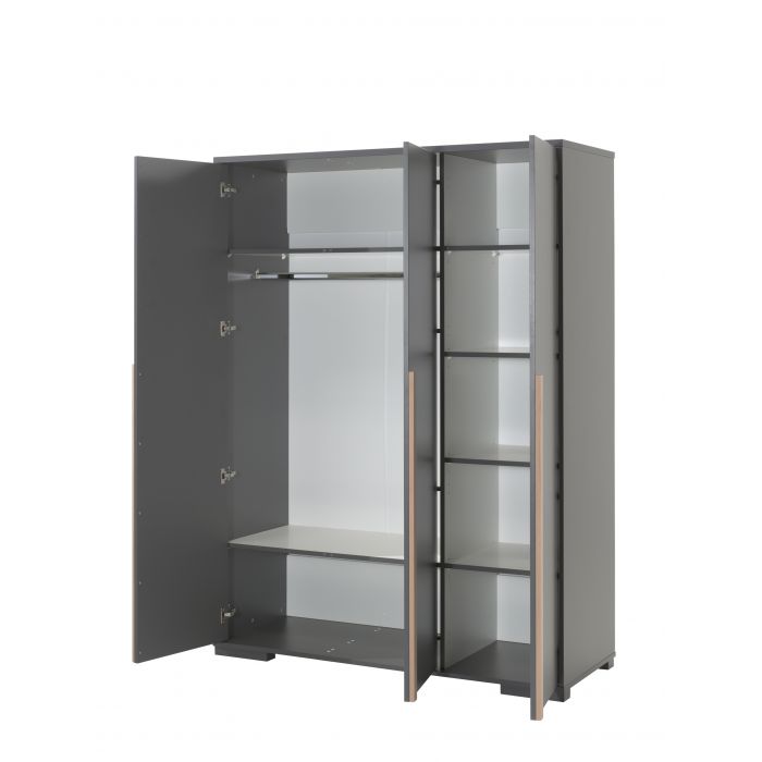 Artikelset LONDON 4-tlg. best. aus: Das Jugendzimmer LONDON zeichnet sich durch das gradlinige Design und die Kombinationsvielfalt der Einzeltypen aus. Es werden geschmackvolle Akzente mit Massivholz gesetzt, die zu einer wohnlichen Atmosphäre beitragen. Der hochwertige Holzwerkstoff als Trägermaterial hat eine pflegeleichte Oberfläche in Dekor Farbe Anthrazit. Die eingesetzten Materialstärken (ca. 25 mm) bieten eine solide Verarbeitung, Stabilität und Standfestigkeit. Das Einzelbett hat eine Liegefläche von 90 x 200 cm und ist mit seinen vier Auflagewinkeln ausschließlich für einen festen Lattenrost geeignet. Den Abschluss beim Kopf- (Höhe ca. 76,1 cm) und Fußteil (Höhe ca. 52 cm) bildet jeweils eine Leiste aus massiver Buche in Ausf. natur. Die Bodenfreiheit beträgt seitlich ca. 20 cm, am Kopf- und Fußteil jeweils ca. 3,6 cm. Die Bettseitenhöhe ist ca. 20 cm und bietet eine Einlegetiefe für Rahmen und Matratze von ca. 19 cm. Stellfläche Einzelbett ca.: B: 205 x H: 76,1 x T: 97 cm. Die Nachtkonsole hat zwei geräumige Schubladen mit Selbsteinzug. Jede Schublade hat einen Griff in Buche massiv auf der Front. Das Schubladen Innenmaß ist ca. B: 37 x H: 14 x T: 30 cm. Der Abstand zum Boden beträgt ca. 3,6 cm. Stellfläche Nachtkonsole ca.: B: 48,1 x H: 48,8 x T: 40 cm. Der Kleiderschrank hat 3 Drehtüren mit Anschlagdämpfung und auf der Front jeweils einen Griff in Buche massiv. Die langen senkrecht verlaufenden Griffe ermöglichen ein einfaches Öffnen und Schließen der Türen. Innen links hat der Schrank einen verstellbaren Ablageboden unten, einen verstellbaren Boden oben und darunter eine Kleiderstange. Die Schrankinnentiefe beträgt ca. 53 cm, die Innenbreite ca. 93 cm. Auf der rechten Seite befindet sich 5 Wäschefächer mit verstellbaren Böden. Die Innenbreite beträgt ca. 45 cm und die Innentiefe ca. 50 cm. Der Abstand zum Boden beträgt ca. 3,6 cm. Stellfläche Kleiderschrank 3-trg. ca.: B: 145,6 x H: 195,2 x T: 56 cm. Die Bettschublade hat ein Innemaß von ca. 90 x 190 cm. Die Front der Bettschublade ist glatt. Durch den Rollenauszug lässt sich die Schublade einfach bedienen. Die Innenhöhe der Bettschublade ist ca. 11,5 cm. Die durchgehende Bodenplatte ist Dekor beschichtet ermöglicht, die Schublade als zusätzlichen Stauraum zu nutzen. Die Außenabmessung der Bettschublade ist ca.: B: 198 x H: 17,5 x T: 93,7 cm. Die Dekoration, Bettwäsche, Lattenrost und Matratze gehören nicht zum Lieferumfang. Der Artikel wird zerlegt geliefert, mit Aufbauanleitung zur einfachen Selbstmontage.