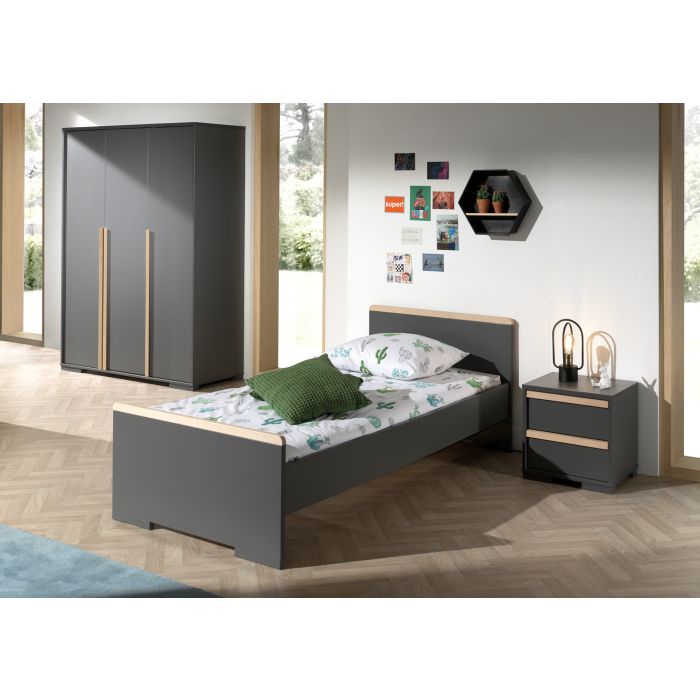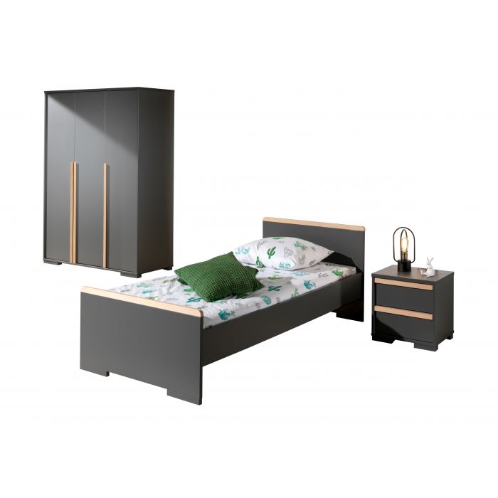 Artikelset LONDON 3-tlg. best. aus: Das Jugendzimmer LONDON zeichnet sich durch das gradlinige Design und die Kombinationsvielfalt der Einzeltypen aus. Es werden geschmackvolle Akzente mit Massivholz gesetzt, die zu einer wohnlichen Atmosphäre beitragen. Der hochwertige Holzwerkstoff als Trägermaterial hat eine pflegeleichte Oberfläche in Dekor Farbe Anthrazit. Die eingesetzten Materialstärken (ca. 25 mm) bieten eine solide Verarbeitung, Stabilität und Standfestigkeit. Das Einzelbett hat eine Liegefläche von 90 x 200 cm und ist mit seinen vier Auflagewinkeln ausschließlich für einen festen Lattenrost geeignet. Den Abschluss beim Kopf- (Höhe ca. 76,1 cm) und Fußteil (Höhe ca. 52 cm) bildet jeweils eine Leiste aus massiver Buche in Ausf. natur. Die Bodenfreiheit beträgt seitlich ca. 20 cm, am Kopf- und Fußteil jeweils ca. 3,6 cm. Die Bettseitenhöhe ist ca. 20 cm und bietet eine Einlegetiefe für Rahmen und Matratze von ca. 19 cm. Stellfläche Einzelbett ca.: B: 205 x H: 76,1 x T: 97 cm. Die Nachtkonsole hat zwei geräumige Schubladen mit Selbsteinzug. Jede Schublade hat einen Griff in Buche massiv auf der Front. Das Schubladen Innenmaß ist ca. B: 37 x H: 14 x T: 30 cm. Der Abstand zum Boden beträgt ca. 3,6 cm. Stellfläche Nachtkonsole ca.: B: 48,1 x H: 48,8 x T: 40 cm. Der Kleiderschrank hat 3 Drehtüren mit Anschlagdämpfung und auf der Front jeweils einen Griff in Buche massiv. Die langen senkrecht verlaufenden Griffe ermöglichen ein einfaches Öffnen und Schließen der Türen. Innen links hat der Schrank einen verstellbaren Ablageboden unten, einen verstellbaren Boden oben und darunter eine Kleiderstange. Die Schrankinnentiefe beträgt ca. 53 cm, die Innenbreite ca. 93 cm. Auf der rechten Seite befindet sich 5 Wäschefächer mit verstellbaren Böden. Die Innenbreite beträgt ca. 45 cm und die Innentiefe ca. 50 cm. Der Abstand zum Boden beträgt ca. 3,6 cm. Stellfläche Kleiderschrank 3-trg. ca.: B: 145,6 x H: 195,2 x T: 56 cm. Die Dekoration, Bettwäsche, Lattenrost und Matratze gehören nicht zum Lieferumfang, nur die Bettschublade. Der Artikel wird zerlegt geliefert, mit Aufbauanleitung zur einfachen Selbstmontage.