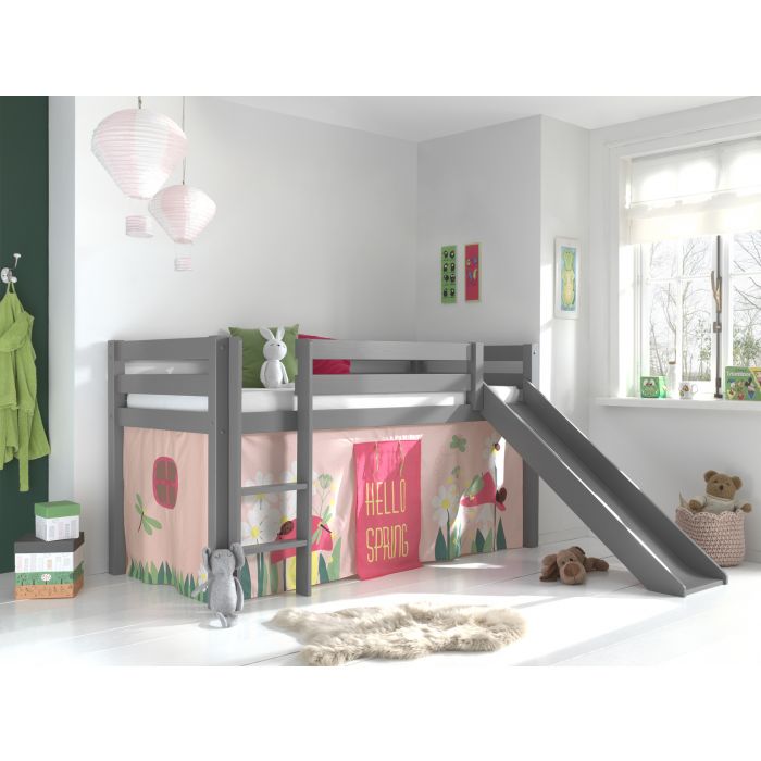 Dieses Hochbett mit Rutsche läd zum Spielen und Schlafen ein. Es ist aus massiver Kiefer gefertigt und in der Ausführung grau lackiert. Die Rutsche bringt viel Spaß beim Spielen und die Leiter und Rutsche ist links oder rechts montierbar. Das Textilset in dem Design "Spring", bestehend aus dem Vorhang, gehört mit zum Lieferumfang. Die Grundfarbe ist ein heller Rosafarbton, auf dem sich das florale Muster farblich toll absetzt. Der vordere Vorhang hat einen Durchlass, der hochgerollt werden kann. Die Textilien sind 100% Baumwolle, bei 30° waschbar. Der Raum unter der Liegefläche lässt sich prima zum spielen nutzen, oder kann als Stauraum genutzt werden. Die Höhe vom Boden bis Unterkante der Bettseite beträgt ca. 70 cm. Ein Rolllattenrost gehört zum Lieferumfang. Die Leiter ist links oder rechts montierbar. Der umlaufende Absturzschutz, die breiten Trittstufen zum sicheren Hinauf- und Hinabsteigen, sowie die hochwertige Verarbeitung und gute Stabilität, zeichnen diesen Artikel aus. Pfostenstärke ca. 6,4 x 6,4 cm. Die Liegefläche ist 90 x 200 cm. Benötigte Stellfläche ca. 210 x 218 cm. Höhe 114 cm. Der Artikel ist ist zerlegt mit Aufbauanleitung zur einfachen Selbstmontage. Höhe von der Oberkante der Bettseite bis Oberkante Absturzschutz ca. 36 cm. Max. Matratzenhöhe ca. 20 cm. Für Kinder unter 6 Jahren nicht geeignet. Die Dekoration gehört nicht zum Lieferumfang. FSC®-zertifiziert und nach EN 747-2:2012+A1(2015) gebaut.