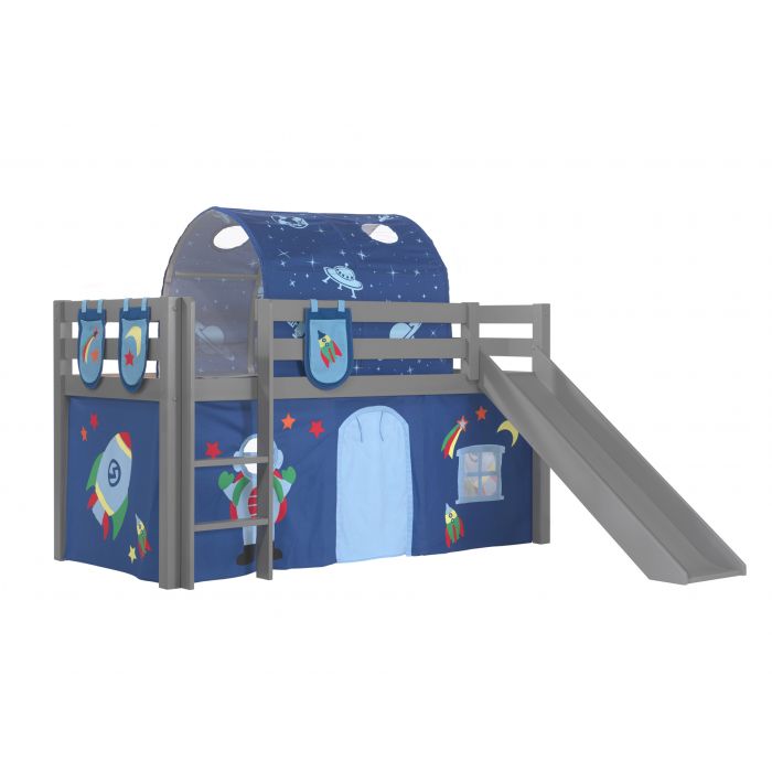 Dieses Hochbett mit Rutsche läd zum Spielen und Schlafen ein. Es ist aus massiver Kiefer gefertigt und in der Ausführung grau lackiert. Die Rutsche bringt viel Spaß beim Spielen und die Leiter und Rutsche ist links oder rechts montierbar. Das Textilset in dem Design "Astro", bestehend aus dem Vorhang, dem Tunnel und 3 Taschen, gehört mit zum Lieferumfang. Die Grundfarbe ist ein dunkler Blaufarbton, auf dem sich das Muster zum Thema Weltraum farblich toll absetzt. Der vordere Vorhang hat einen Durchlass, der hochgerollt werden kann. Die Textilien sind 100% Baumwolle, bei 30° waschbar. Der Tunnel hat ein Maß von ca.: B: 90 x H: 100 x T: 86 cm. Die Taschen haben jeweils unterschiedliche Motive und werden mit den Laschen am Absturzschutz befestigt. Der Raum unter der Liegefläche lässt sich prima zum spielen nutzen, oder kann als Stauraum genutzt werden. Die Höhe vom Boden bis Unterkante der Bettseite beträgt ca. 70 cm. Ein Rolllattenrost gehört zum Lieferumfang. Die Leiter ist links oder rechts montierbar. Der umlaufende Absturzschutz, die breiten Trittstufen zum sicheren Hinauf- und Hinabsteigen, sowie die hochwertige Verarbeitung und gute Stabilität, zeichnen diesen Artikel aus. Pfostenstärke ca. 6,4 x 6,4 cm. Die Liegefläche ist 90 x 200 cm. Benötigte Stellfläche ca. 210 x 218 cm. Höhe 114 cm + ca. 100 cm für den Tunnel. Der Artikel ist ist zerlegt mit Aufbauanleitung zur einfachen Selbstmontage. Höhe von der Oberkante der Bettseite bis Oberkante Absturzschutz ca. 36 cm. Max. Matratzenhöhe ca. 20 cm. Für Kinder unter 6 Jahren nicht geeignet. Die Dekoration gehört nicht zum Lieferumfang. FSC®-zertifiziert und nach EN 747-2:2012+A1(2015) gebaut.