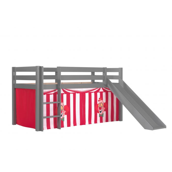 Ein tolles Hochbett mit Rutsche zum spielen und schlafen. Aus massiver Kiefer in Ausführung grau lackiert. Die Rutsche bringt viel Spaß beim Spielen, ein Abenteuerspielplatz für jedes Kinderzimmer. Das Textilset in dem Design "Zirkus", bestehend aus dem Vorhang, mit toller Darstellung eines Zirkus Zeltes und gehört mit zum Lieferumfang. Die Textilien sind 100% Polyester, bei 30° waschbar. Ein Rolllattenrost gehört ebenfalls zum Lieferumfang. Die Leiter und Rutsche ist links oder rechts montierbar. Der umlaufende Absturzschutz, die breiten Trittstufen zum sicheren Hinauf- und Hinabsteigen, sowie die hochwertige Verarbeitung und gute Stabilität, zeichnen diesen Artikel aus. Der Raum unter der Liegefläche lässt sich prima zum spielen nutzen, oder kann als Stauraum genutzt werden. Die Höhe vom Boden bis Unterkante der Bettseite beträgt ca. 70 cm. Pfostenstärke ca. 6,4 x 6,4 cm. Die Liegefläche ist 90 x 200 cm. Benötigte Stellfläche ca. 210 x 218 cm. Höhe 114 cm. Der Artikel ist ist zerlegt mit Aufbauanleitung zur einfachen Selbstmontage. Höhe von der Oberkante der Bettseite bis Oberkante Absturzschutz ca. 36 cm. Max. Matratzenhöhe ca. 20 cm. Für Kinder unter 6 Jahren nicht geeignet. Die Dekoration gehört nicht zum Lieferumfang. FSC®-zertifiziert und nach EN 747-2:2012+A1(2015) gebaut.