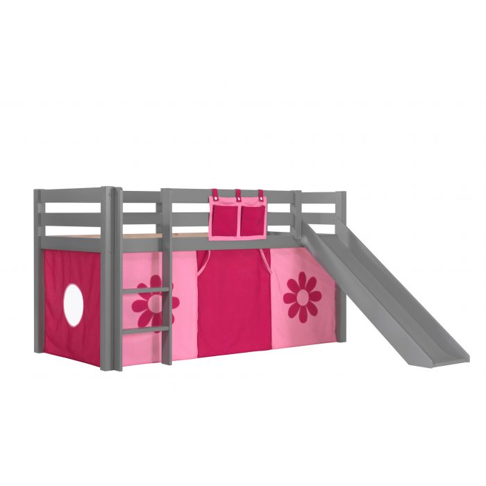 Ein tolles Hochbett mit Rutsche zum spielen und schlafen. Aus massiver Kiefer in Ausführung grau lackiert. Die Rutsche bringt viel Spaß beim Spielen, ein Abenteuerspielplatz für jedes Kinderzimmer. Das Textilset in dem Design "Pink Flower", bestehend aus dem Vorhang, gehört mit zum Lieferumfang. Die Textilien sind 100% Polyester, bei 30° waschbar. Ein Rolllattenrost gehört ebenfalls zum Lieferumfang. Die Leiter und Rutsche ist links oder rechts montierbar. Der umlaufende Absturzschutz, die breiten Trittstufen zum sicheren Hinauf- und Hinabsteigen, sowie die hochwertige Verarbeitung und gute Stabilität, zeichnen diesen Artikel aus. Der Raum unter der Liegefläche lässt sich prima zum spielen nutzen, oder kann als Stauraum genutzt werden. Die Höhe vom Boden bis Unterkante der Bettseite beträgt ca. 70 cm. Pfostenstärke ca. 6,4 x 6,4 cm. Die Liegefläche ist 90 x 200 cm. Benötigte Stellfläche ca. 210 x 218 cm. Höhe 114 cm. Der Artikel ist ist zerlegt mit Aufbauanleitung zur einfachen Selbstmontage. Höhe von der Oberkante der Bettseite bis Oberkante Absturzschutz ca. 36 cm. Max. Matratzenhöhe ca. 20 cm. Für Kinder unter 6 Jahren nicht geeignet. Die Dekoration gehört nicht zum Lieferumfang. FSC®-zertifiziert und nach EN 747-2:2012+A1(2015) gebaut.