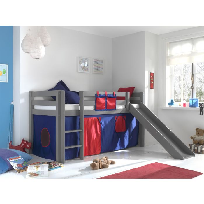 Ein tolles Hochbett mit Rutsche zum spielen und schlafen. Aus massiver Kiefer in Ausführung weiß lackiert. Die Rutsche bringt viel Spaß beim Spielen, ein Abenteuerspielplatz für jedes Kinderzimmer. Das Textilset in dem Design "Domino", bestehend aus dem Vorhang, gehört mit zum Lieferumfang. Die Textilien sind 100% Polyester, bei 30° waschbar. Ein Rolllattenrost gehört ebenfalls zum Lieferumfang. Die Leiter und Rutsche ist links oder rechts montierbar. Der umlaufende Absturzschutz, die breiten Trittstufen zum sicheren Hinauf- und Hinabsteigen, sowie die hochwertige Verarbeitung und gute Stabilität, zeichnen diesen Artikel aus. Der Raum unter der Liegefläche lässt sich prima zum spielen nutzen, oder kann als Stauraum genutzt werden. Die Höhe vom Boden bis Unterkante der Bettseite beträgt ca. 70 cm. Pfostenstärke ca. 6,4 x 6,4 cm. Die Liegefläche ist 90 x 200 cm. Benötigte Stellfläche ca. 210 x 218 cm. Höhe 114 cm. Der Artikel ist ist zerlegt mit Aufbauanleitung zur einfachen Selbstmontage. Höhe von der Oberkante der Bettseite bis Oberkante Absturzschutz ca. 36 cm. Max. Matratzenhöhe ca. 20 cm. Für Kinder unter 6 Jahren nicht geeignet. Die Dekoration und Tasche gehört nicht zum Lieferumfang. FSC®-zertifiziert und nach EN 747-2:2012+A1(2015) gebaut.