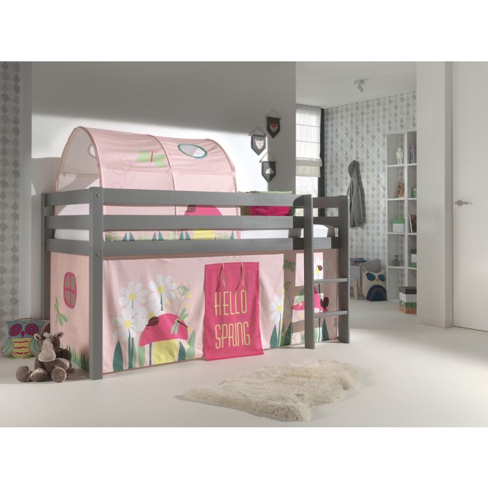 Dieses Hochbett läd zum Spielen und Schlafen ein. Es ist aus massiver Kiefer gefertigt und in der Ausführung grau lackiert. Das Textilset in dem Design "Spring", bestehend aus dem Vorhang und dem Tunnel, gehört mit zum Lieferumfang. Die Grundfarbe ist ein heller Rosafarbton, auf dem sich das florale Muster farblich toll absetzt. Der vordere Vorhang hat einen Durchlass, der hochgerollt werden kann. Die Textilien sind 100% Baumwolle, bei 30° waschbar. Der Tunnel hat ein Maß von ca.: B: 90 x H: 100 x T: 86 cm. Der Raum unter der Liegefläche lässt sich prima zum spielen nutzen, oder kann als Stauraum genutzt werden. Die Höhe vom Boden bis Unterkante der Bettseite beträgt ca. 70 cm. Ein Rolllattenrost gehört zum Lieferumfang. Die Leiter ist links oder rechts montierbar. Der umlaufende Absturzschutz, die breiten Trittstufen zum sicheren Hinauf- und Hinabsteigen, sowie die hochwertige Verarbeitung und gute Stabilität, zeichnen diesen Artikel aus. Pfostenstärke ca. 6,4 x 6,4 cm. Die Liegefläche ist 90 x 200 cm. Benötigte Stellfläche ca. 210 x 106 cm. Höhe 114 cm + ca. 100 cm für den Tunnel. Der Artikel ist ist zerlegt mit Aufbauanleitung zur einfachen Selbstmontage. Höhe von der Oberkante der Bettseite bis Oberkante Absturzschutz ca. 36 cm. Max. Matratzenhöhe ca. 20 cm. Für Kinder unter 6 Jahren nicht geeignet. Die Dekoration gehört nicht zum Lieferumfang. FSC®-zertifiziert und nach EN 747-2:2012+A1(2015) gebaut.