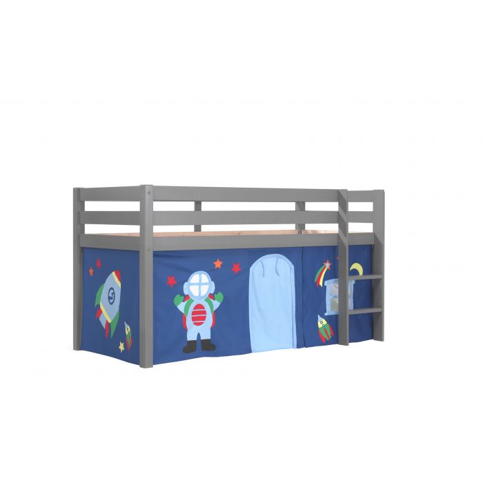 Dieses Hochbett läd zum Spielen und Schlafen ein. Es ist aus massiver Kiefer gefertigt und in der Ausführung grau lackiert. Das Textilset in dem Design "Astro", bestehend aus dem Vorhang, gehört mit zum Lieferumfang. Die Grundfarbe ist ein dunkler Blaufarbton, auf dem sich das Muster zum Thema Weltraum farblich toll absetzt. Der vordere Vorhang hat einen Durchlass, der hochgerollt werden kann. Die Textilien sind 100% Baumwolle, bei 30° waschbar. Der Raum unter der Liegefläche lässt sich prima zum spielen nutzen, oder kann als Stauraum genutzt werden. Die Höhe vom Boden bis Unterkante der Bettseite beträgt ca. 70 cm. Ein Rolllattenrost gehört zum Lieferumfang. Die Leiter ist links oder rechts montierbar. Der umlaufende Absturzschutz, die breiten Trittstufen zum sicheren Hinauf- und Hinabsteigen, sowie die hochwertige Verarbeitung und gute Stabilität, zeichnen diesen Artikel aus. Pfostenstärke ca. 6,4 x 6,4 cm. Die Liegefläche ist 90 x 200 cm. Benötigte Stellfläche ca. 210 x 106 cm. Höhe 114 cm. Der Artikel ist ist zerlegt mit Aufbauanleitung zur einfachen Selbstmontage. Höhe von der Oberkante der Bettseite bis Oberkante Absturzschutz ca. 36 cm. Max. Matratzenhöhe ca. 20 cm. Für Kinder unter 6 Jahren nicht geeignet. Die Dekoration gehört nicht zum Lieferumfang. FSC®-zertifiziert und nach EN 747-2:2012+A1(2015) gebaut.