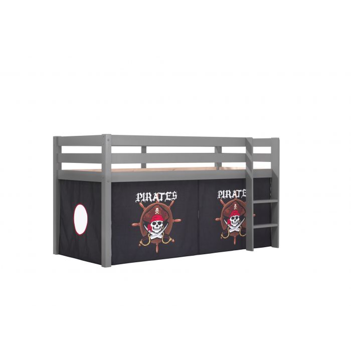 Ein schickes Hochbett zum spielen und schlafen. Aus massiver Kiefer in Ausführung grau lackiert. Das Textilset in dem Design "Pirates", bestehend aus dem Vorhang, mit toller Darstellung eines Piratenkopfes und gehört mit zum Lieferumfang. Die Textilien sind 100% Polyester, bei 30° waschbar. Der Raum unter der Liegefläche lässt sich prima zum spielen nutzen, oder kann als Stauraum genutzt werden. Die Höhe vom Boden bis Unterkante der Bettseite beträgt ca. 70 cm. Ein Rolllattenrost gehört zum Lieferumfang. Die Leiter ist links oder rechts montierbar. Der umlaufende Absturzschutz, die breiten Trittstufen zum sicheren Hinauf- und Hinabsteigen, sowie die hochwertige Verarbeitung und gute Stabilität, zeichnen diesen Artikel aus. Pfostenstärke ca. 6,4 x 6,4 cm. Die Liegefläche ist 90 x 200 cm. Benötigte Stellfläche ca. 210 x 106 cm. Höhe 114 cm. Der Artikel ist ist zerlegt mit Aufbauanleitung zur einfachen Selbstmontage. Höhe von der Oberkante der Bettseite bis Oberkante Absturzschutz ca. 36 cm. Max. Matratzenhöhe ca. 20 cm. Für Kinder unter 6 Jahren nicht geeignet. Die Dekoration gehört nicht mit zum Lieferumfang. Die Dekoration gehört nicht zum Lieferumfang. FSC®-zertifiziert und nach EN 747-2:2012+A1(2015) gebaut.
