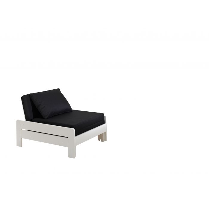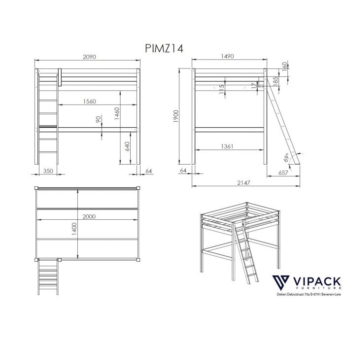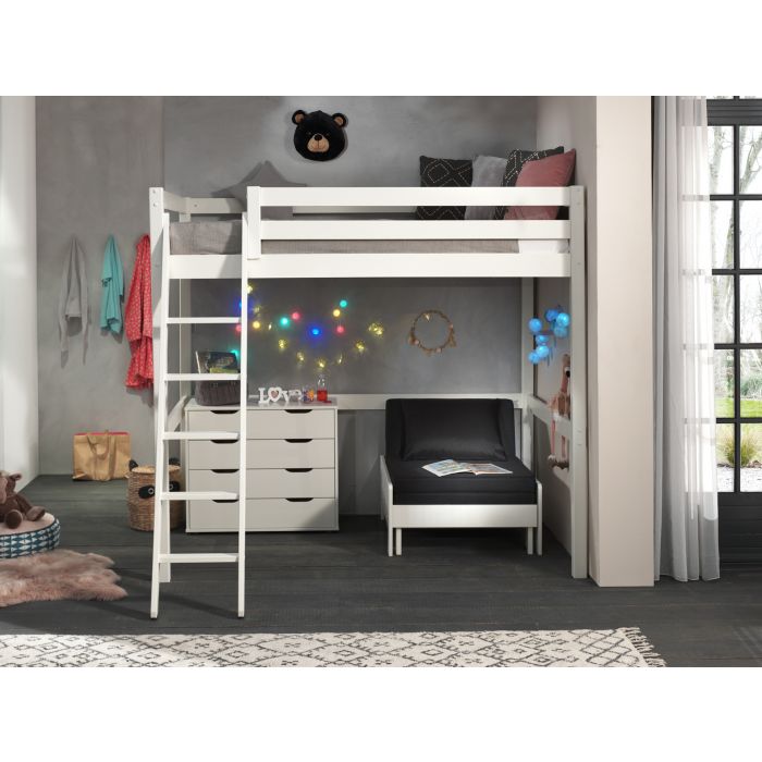 Dieses Hochbett mit 1 Schlafgelegenheit oben ist ideal für das Kinderzimmer oder die Studentenwohnung. Es hat viel Funktion auf kleinstem Raum und ist aus massiver Kiefer gefertigt, in der Ausführung weiß lackiert. Die Liegefläche oben ist jeweils 140 x 200 cm und die Leiter sowie der Rolllattenrost sind inklusive. Die obere Liegefläche hat einen hohen umlaufenden Absturzschutz. Die Leiter verläuft schräg und ist links oder rechts montierbar. Breite Trittstufen für sicheres Hinauf- und Hinabsteigen. Die lichte Höhe unter dem Bett ist ca. 145 cm. Der praktische Sessel mit Sitzkissen, der zum Sesselbett umfunktioniert werden kann, gehört auch zum Lieferumfang. Er ist aus massiver Kiefer gefertigt und weiß lackiert. Die Kanten sind gerundet und durch einfaches Ausziehen, lässt sich eine Liegefläche im Maß ca. 76 x 190 cm erzeugen. Der Lattenrost ist bereits im Lieferumfang inklusive. Das Sitzkissen gehört ebenfalls dazu und wird einfach nach vorne ausgeklappt, es dient gleichzeitig als Matratze. Der Stoff ist in Farbe schwarz, 100% Polyester, abnehmbar und bei 30° als Handwäsche waschbar. Produktmaße Sessel: B: 80 H: 68 T: 85 cm, die Tiefe ausgezogen ist 206 cm. Gerade in kleinen Räumlichkeiten ist diese zweite Schlafgelegeheit ein echter Vorteil. Das Bett ist hochwertig verarbeitet und zeichnet sich durch sehr gute Stabilität aus. Die Kommode mit 4 Schubladen gehört ebenso dazu. Das Trägermaterial ist hochwertiges MDF weiß lackiert. Die Griffaussparungen an den Schubladen erleichtern das Auf und Zumachen, ohne die gradlinige Optik zu beeinträchtigen. Das Schubladen Innenmaß ist ca.: B: 78 x H: 12 x T: 36 cm. Damit bietet sie viel Stauraum für Dinge jeglicher Art. Sie steht auf ca. 2 cm hohen Möbelgleitern und die Beschläge sind aus Metall. Stellfläche Kommode: B: 85,5 x H: 72 T: 43,3 cm. Die Pfostenstärke ist ca. 6,4 x 6,4 cm, die Bettseiten und der Absturzschutz sind 2,0 cm stark. Produktmaße Hochbett: B: 209 H: 190 T: 215 cm. Die Ware ist zerlegt, zur einfachen Selbstmontage. Max. Matratzenhöhe ca. 18,5 cm. Für Kinder unter 6 Jahren nicht geeignet. Die Dekoration gehört nicht zum Lieferumfang. FSC®-zertifiziert und nach EN 747-1 gebaut.