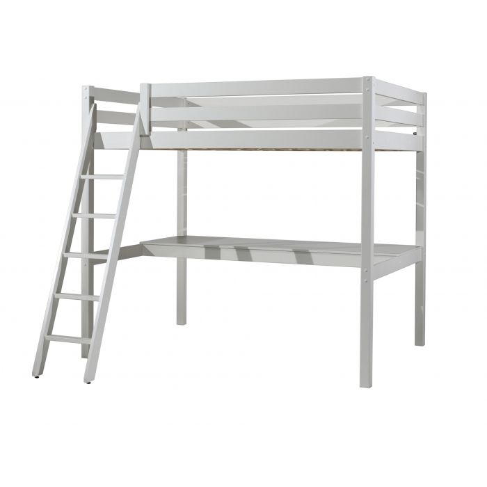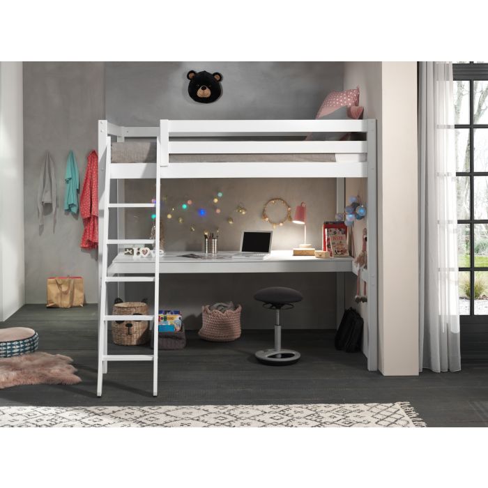 Dieses Hochbett ist ideal für das Kinderzimmer. Es hat viel Funktion auf kleinstem Raum und ist aus massiver Kiefer gefertigt, in der Ausführung weiß lackiert. Die Liegefläche oben ist 140 x 200 cm und die Leiter sowie der Rolllattenrost sind inklusive. Die obere Liegefläche hat einen 55 cm hohen umlaufenden Absturzschutz. Die Leiter (35 cm breit) verläuft schräg und ist links oder rechts montierbar. Breite Trittstufen für sicheres Hinauf- und Hinabsteigen. Die lichte Höhe unter dem Bett ist ca. 146 cm. Der Platz unter dem Bett wird für eine große Schreibplatte genutzt. Sie nutzt den Platz optimal und bietet viel Raum als Arbeitsfläche und Ablage. Die Arbeitshöhe ist ca. 75 cm und die Beinfreiheit unter der Platte ca. 65 cm. Das Plattenmaß ist ca. B: 205 x T: 65 cm. Das Bett ist hochwertig verarbeitet und zeichnet sich durch sehr gute Stabilität aus. Die Pfostenstärke ist ca. 6,4 x 6,4 cm, die Bettseiten und der Absturzschutz sind 2,0 cm stark. Stellfläche Hochbett: B: 209,4 H: 190 T: 149/214,7 cm (inkl. Leiter). Die Ware ist zerlegt, zur einfachen Selbstmontage. Max. Matratzenhöhe ca. 18,5 cm. Für Kinder unter 6 Jahren nicht geeignet. Die Dekoration gehört nicht zum Lieferumfang. FSC®-zertifiziert und nach EN 747-1 gebaut.