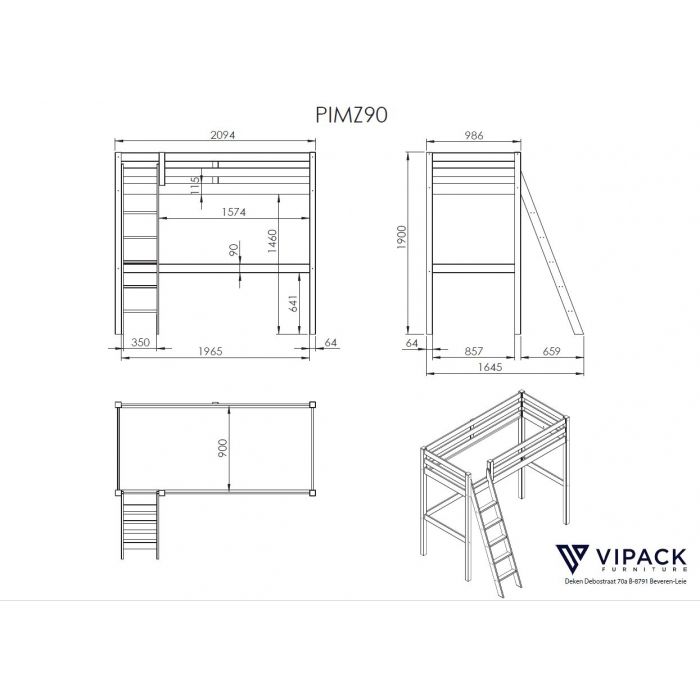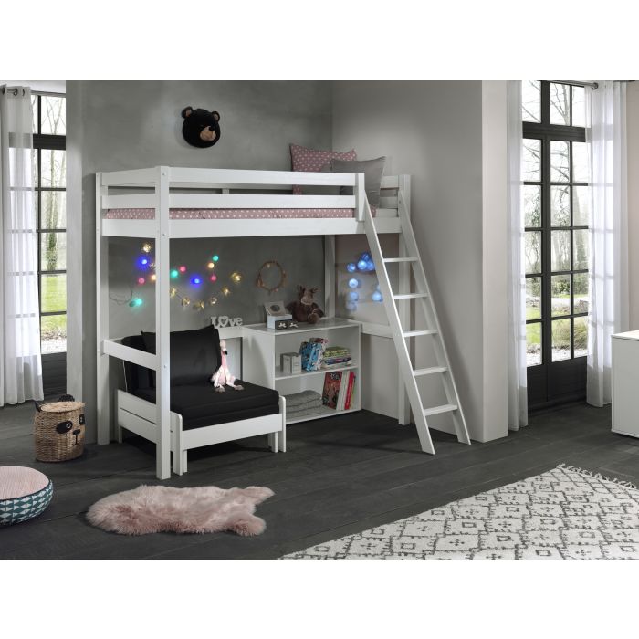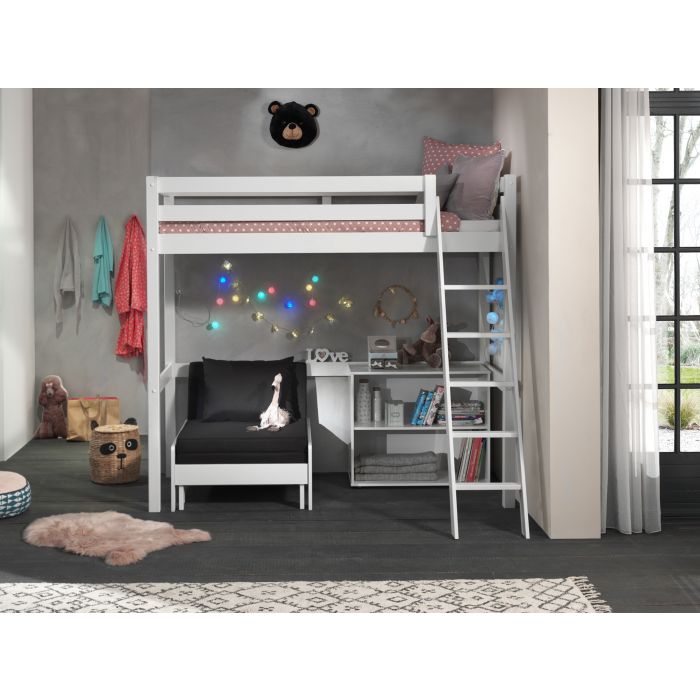 Dieses Hochbett mit 1 Schlafgelegenheit oben ist ideal für das Kinderzimmer oder die Studentenwohnung. Es hat viel Funktion auf kleinstem Raum und ist aus massiver Kiefer gefertigt, in der Ausführung weiß lackiert. Die Liegefläche oben ist jeweils 90 x 200 cm und die Leiter sowie der Rolllattenrost sind inklusive. Die obere Liegefläche hat einen hohen umlaufenden Absturzschutz. Die Leiter verläuft schräg und ist links oder rechts montierbar. Breite Trittstufen für sicheres Hinauf- und Hinabsteigen. Die lichte Höhe unter dem Bett ist ca. 145 cm. Der praktische Sessel mit Sitzkissen, der zum Sesselbett umfunktioniert werden kann, gehört auch zum Lieferumfang. Er ist aus massiver Kiefer gefertigt und weiß lackiert. Die Kanten sind gerundet und durch einfaches Ausziehen, lässt sich eine Liegefläche im Maß ca. 76 x 190 cm erzeugen. Der Lattenrost ist bereits im Lieferumfang inklusive. Das Sitzkissen gehört ebenfalls dazu und wird einfach nach vorne ausgeklappt, es dient gleichzeitig als Matratze. Der Stoff ist in Farbe schwarz, 100% Polyester, abnehmbar und bei 30° als Handwäsche waschbar. Produktmaße Sessel: B: 80 H: 68 T: 85 cm, die Tiefe ausgezogen ist 206 cm. Gerade in kleinen Räumlichkeiten ist diese zweite Schlafgelegeheit ein echter Vorteil. Das Bett ist hochwertig verarbeitet und zeichnet sich durch sehr gute Stabilität aus. Das Regal mit 2 geräumigen Fächern gehört ebenso dazu. Das Trägermaterial ist hochwertiges MDF weiß lackiert. Der Boden ist fest montiert und nicht verstellbar. Das Fachinnenmaß mit Ordnerhöhe lautet ca.: B: 82 x H: 32,5 x T: 39,5 cm. Damit bietet es viel Stauraum für Dinge jeglicher Art. Das Regal steht auf ca. 2 cm hohen Möbelgleitern und die Beschläge sind aus Metall. Stellfläche Regal: B: 85,5 x H: 72 T: 43,3 cm. Die Pfostenstärke ist ca. 6,4 x 6,4 cm, die Bettseiten und der Absturzschutz sind 2,0 cm stark. Produktmaße Hochbett ca.: B: 209 H: 190 T: 165 cm. Die Ware ist zerlegt, zur einfachen Selbstmontage. Max. Matratzenhöhe ca. 18,5 cm. Für Kinder unter 6 Jahren nicht geeignet. Die Dekoration gehört nicht zum Lieferumfang. FSC®-zertifiziert und nach EN 747-1 gebaut.