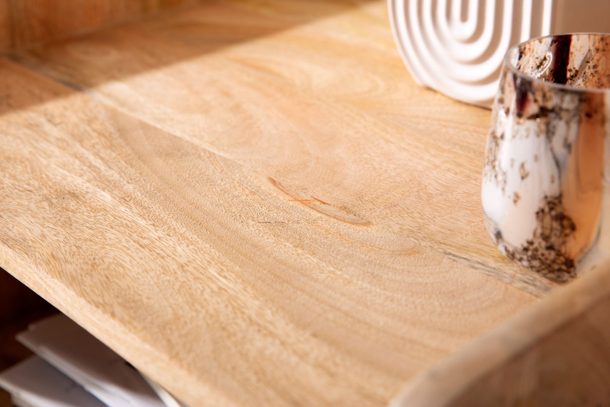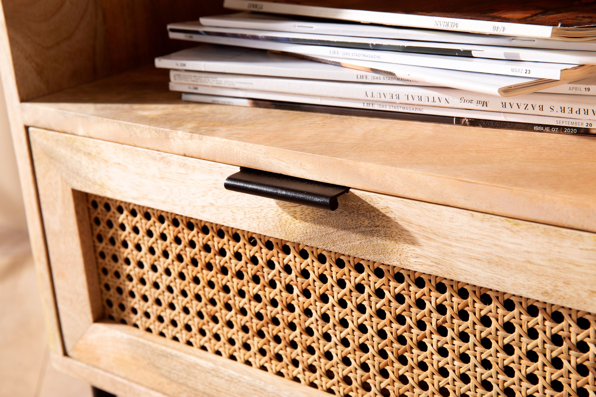 - Materialien: Korpus aus Mango Massivholz (klar lackiert), Schubladenfront aus Rattan & MDF, pulverbeschichtetes Metallgestell und Griff