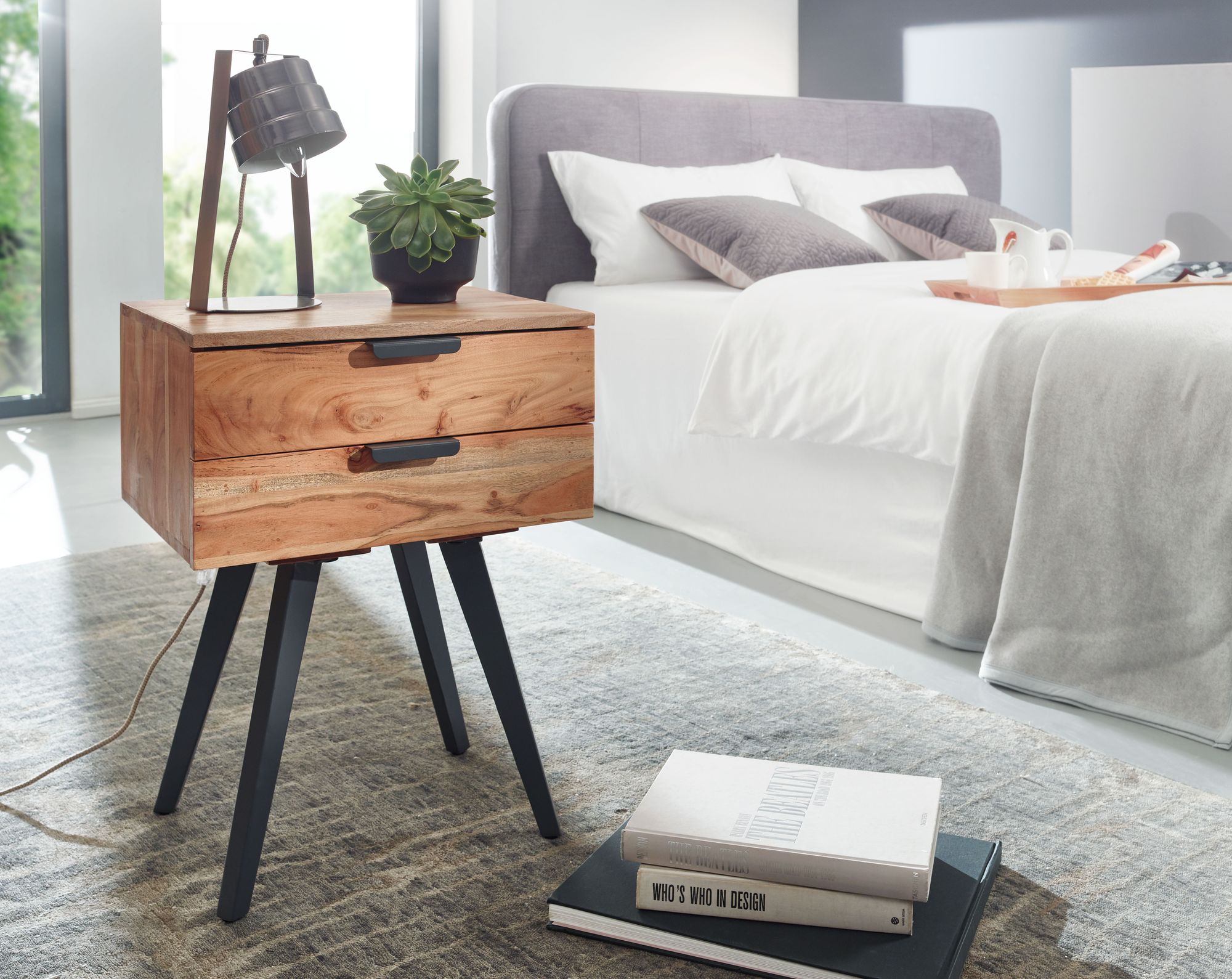 Diese Nachtkonsole verbindet angesagtes Industrial-Design mit hochwertigem massivem Akazienholz. Die braune Oberfläche und graue Metallbeine verleihen ein robustes, modernes Erscheinungsbild.