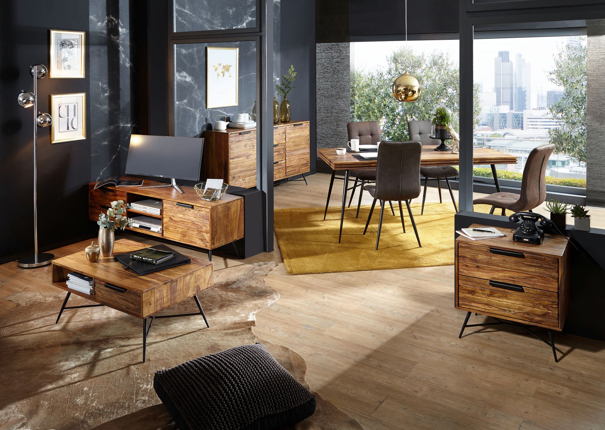 Diese Nachttisch aus massivem Sheesham-Holz im angesagten Industrial-Look verleiht Ihrem Schlafzimmer praktischen Stauraum und Stil. Die natürliche Holzfarbe in Kombination mit dem schwarzen matten Metallgestell sorgt für Robustheit und Einzigartigkeit dank der natürlichen Maserung.