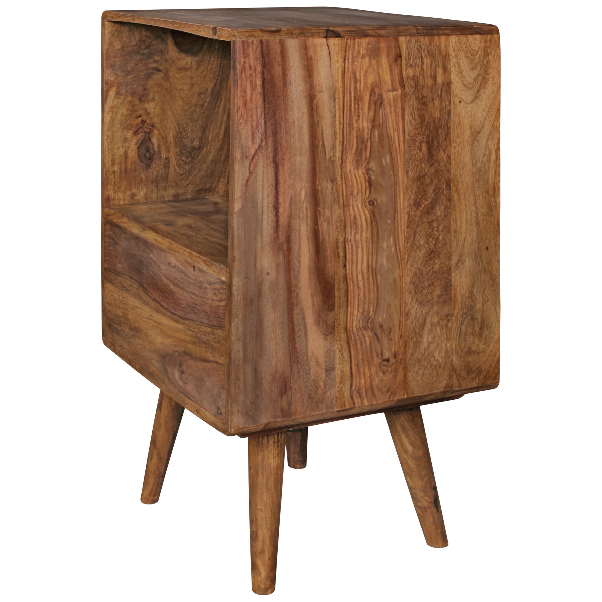 Bringen Sie mit dieser großen Nachtkonsole aus massivem Sheesham-Holz im Retro-Look einen besonderen Charme in Ihr Schlafzimmer. Das Design kombiniert Vintage-Stil mit viel Stauraum in einer Schublade und einem Regal.