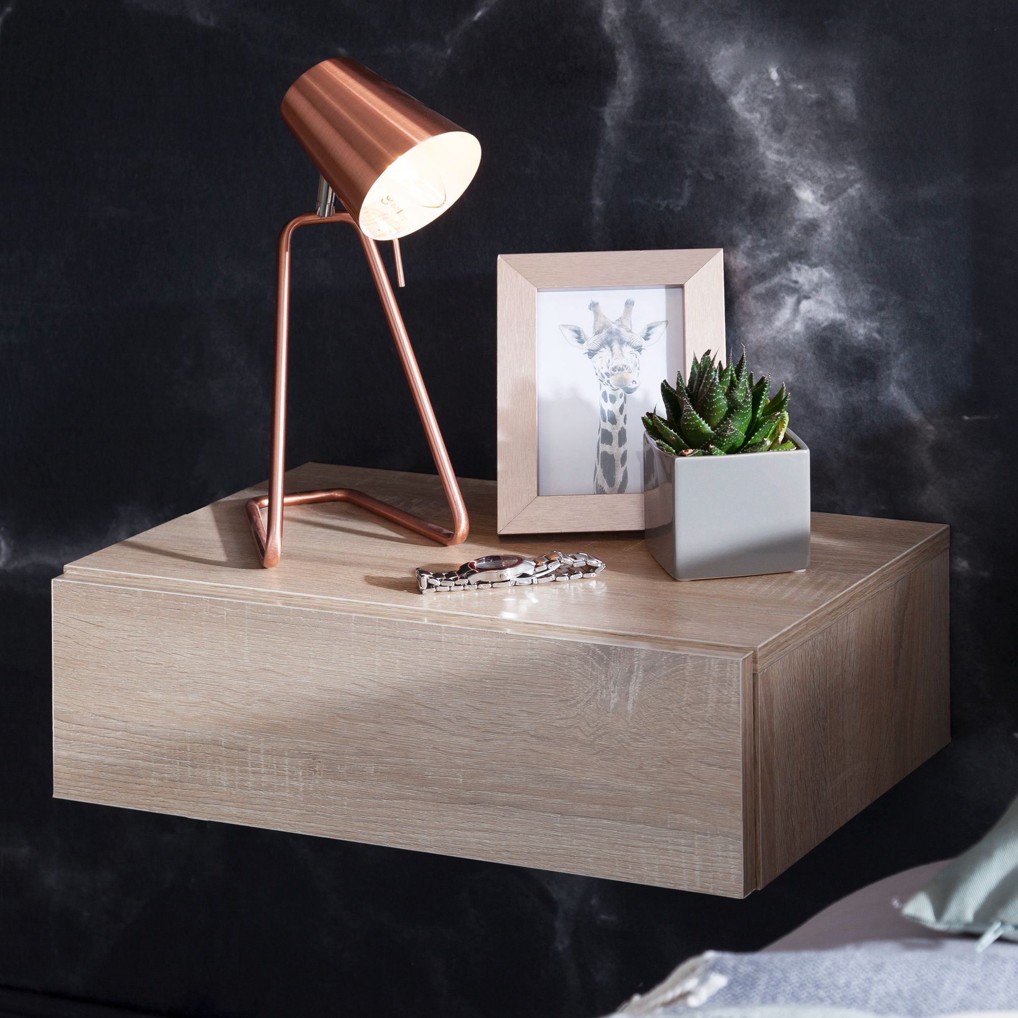 Wandmontierte Nachtkonsole im zeitlosen Design, ideal zur Platzoptimierung im Schlafzimmer. Die schlichte rechteckige Ablagefläche bietet Platz für Lampe, Wecker und Co. Die herausnehmbare Schublade eignet sich zur Aufbewahrung von Büchern, Brille und Medikamenten.